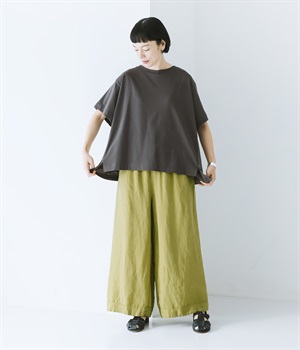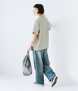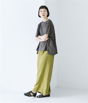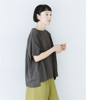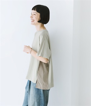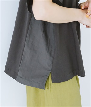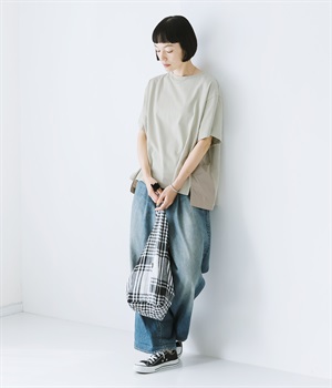 切り替えデザインをほどこしてベーシックになりすぎず、こなれ感のある印象に仕上がっています。体のラインを拾いにくいゆったりとしたサイズ感でラフな着こなしがたのしめます。同色系でまとまりがありスタイリングしやすい点も◎。