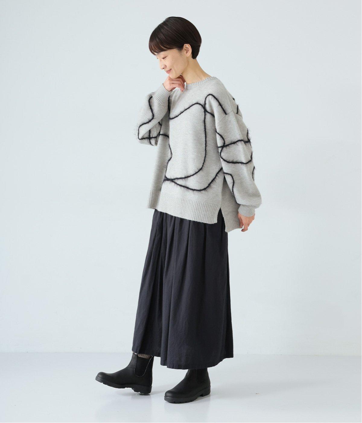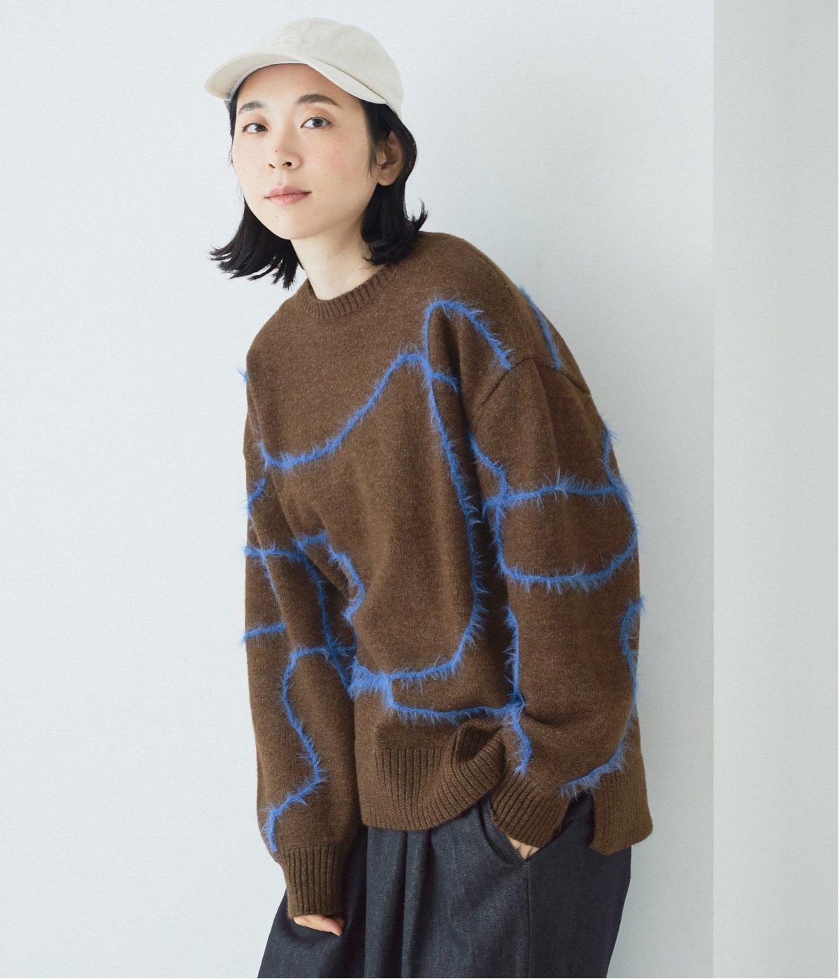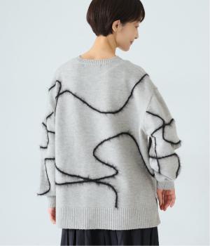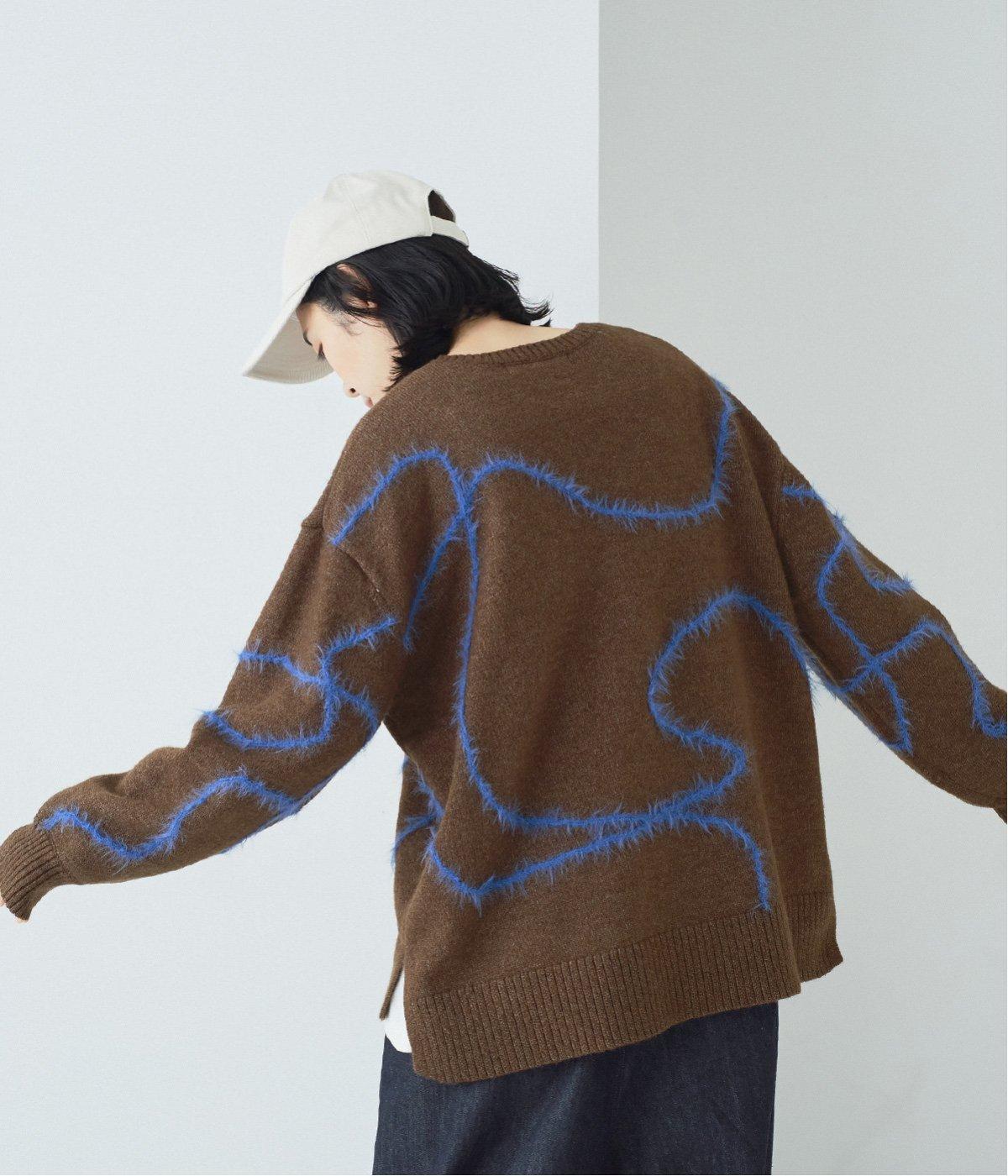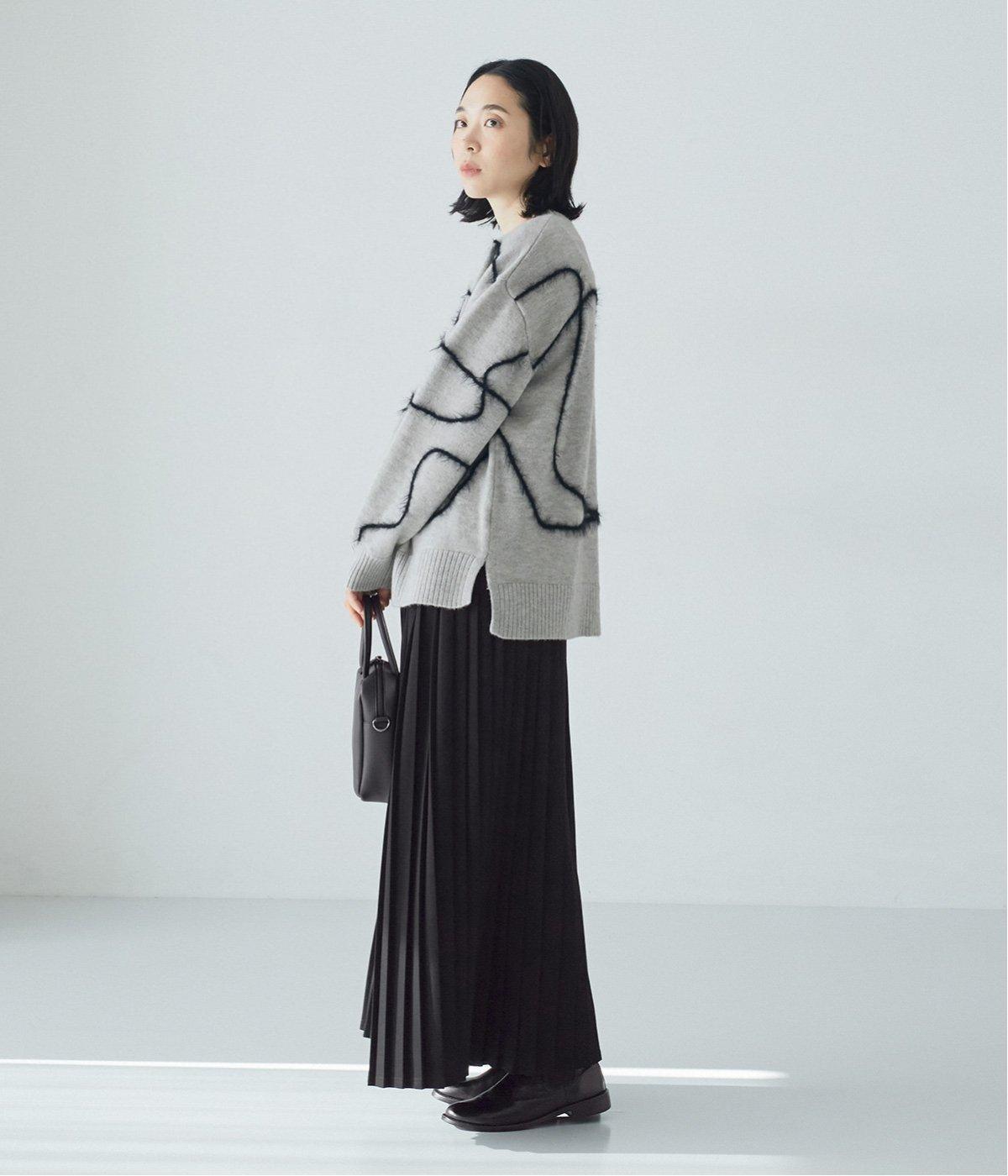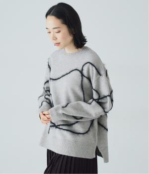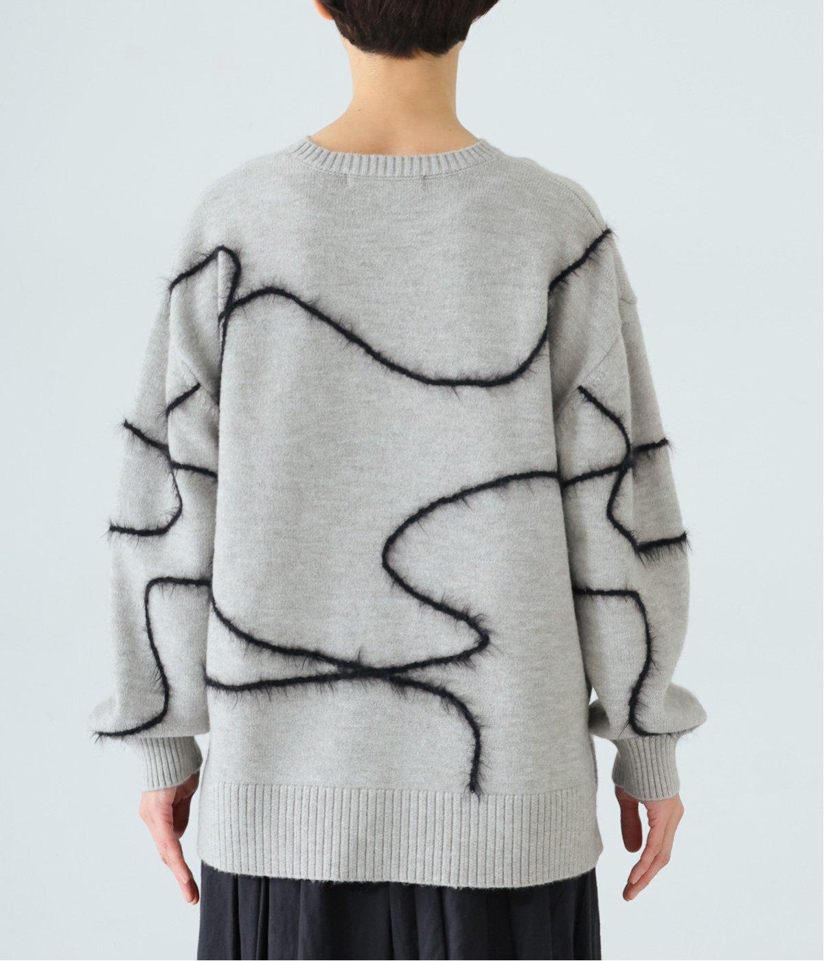 ニット全体にデザインされたラインが目を引くトップス。落ち着いた配色で、コーディネートになじみながらもほどよく存在感を放ちます。ドロップショルダーから成るゆったりとした身幅でこなれた印象に。前後差のある着丈とサイドスリットもポイントです。