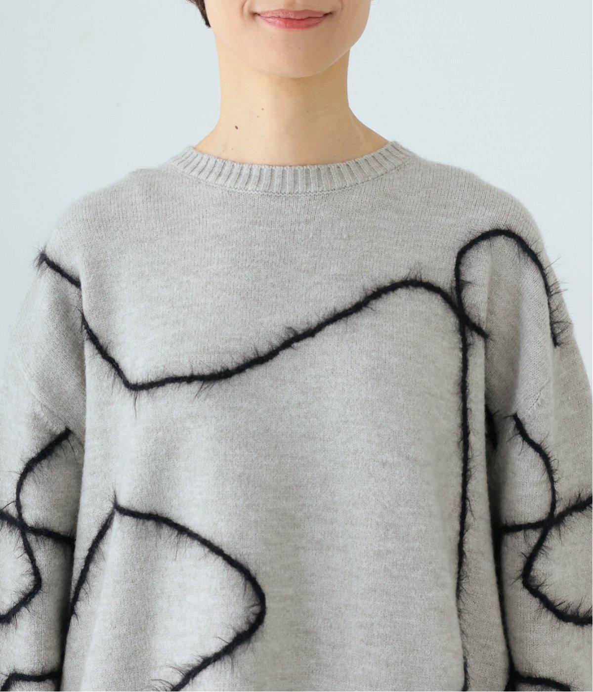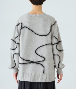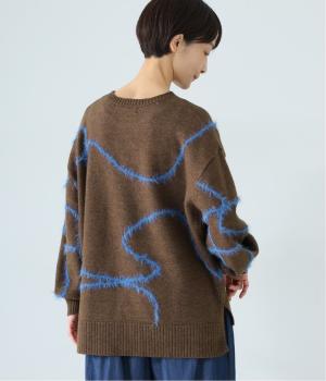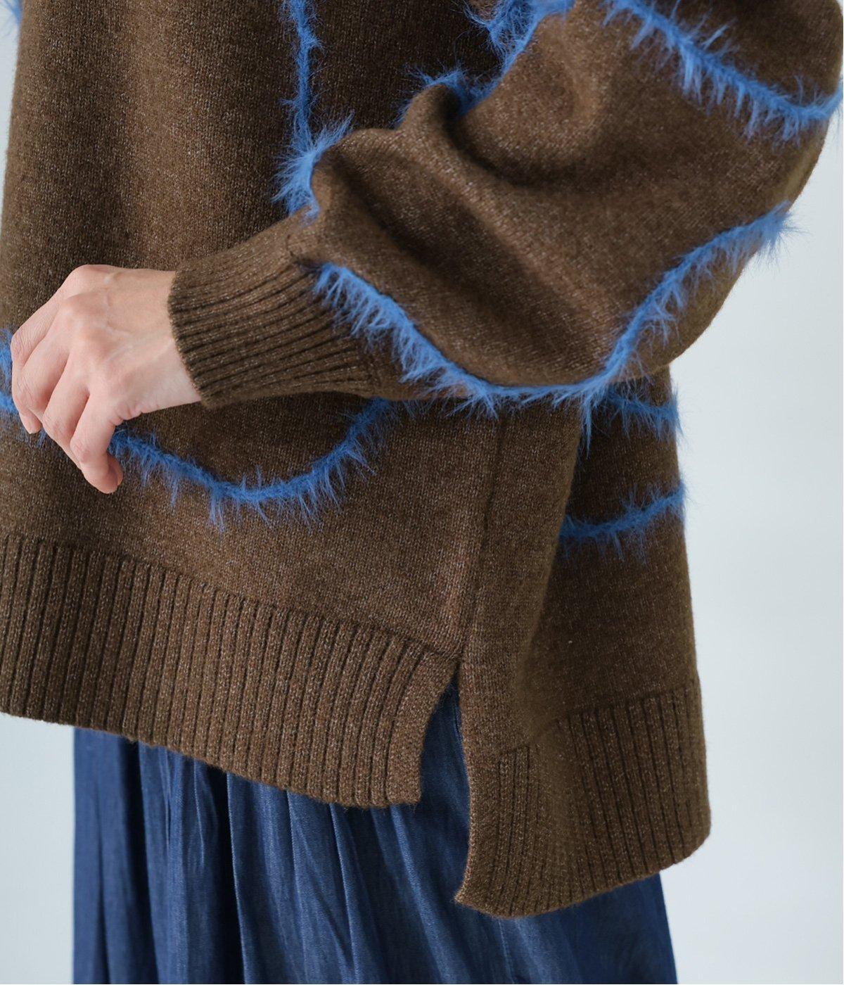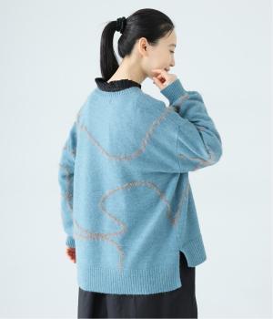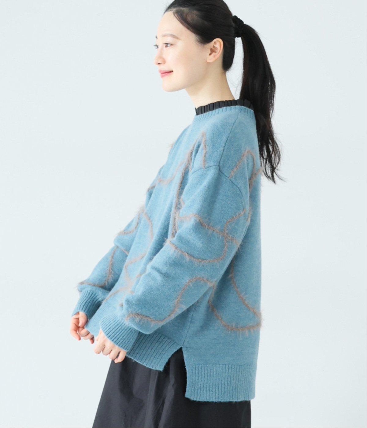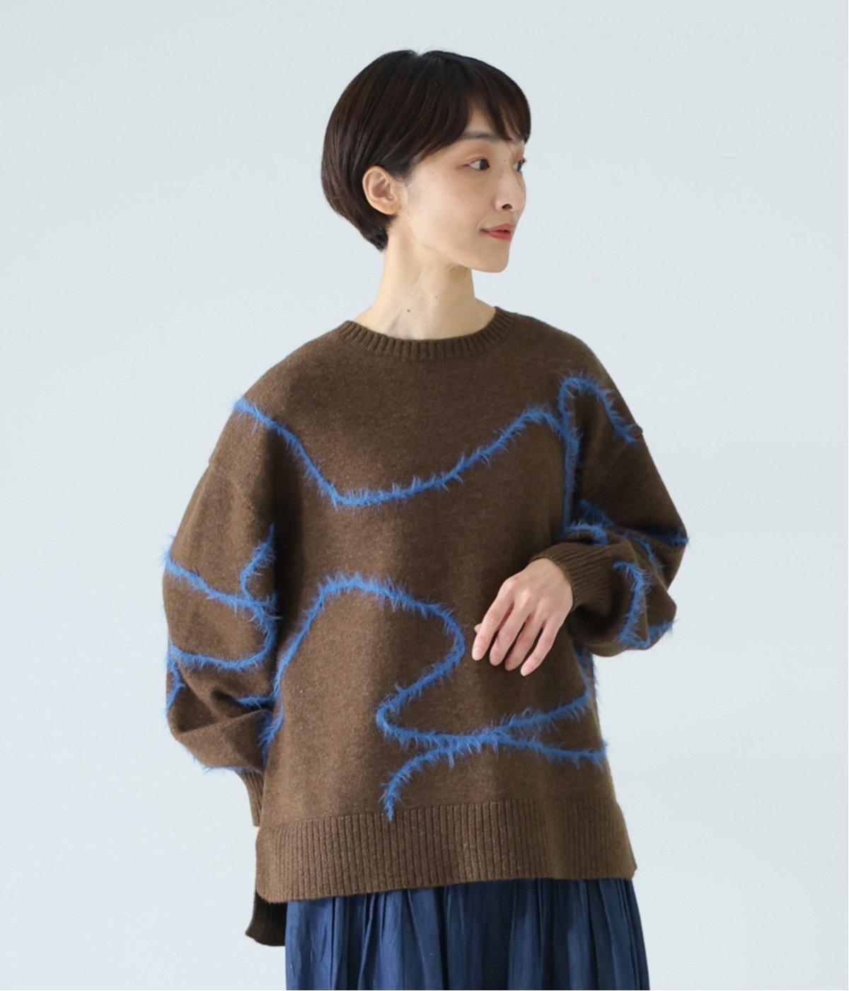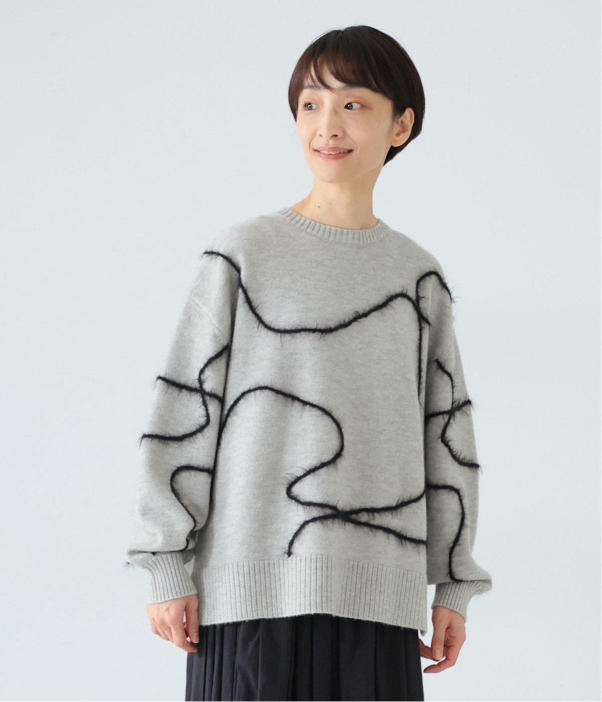 ニット全体にデザインされたラインが目を引くトップス。落ち着いた配色で、コーディネートになじみながらもほどよく存在感を放ちます。ドロップショルダーから成るゆったりとした身幅でこなれた印象に。前後差のある着丈とサイドスリットもポイントです。