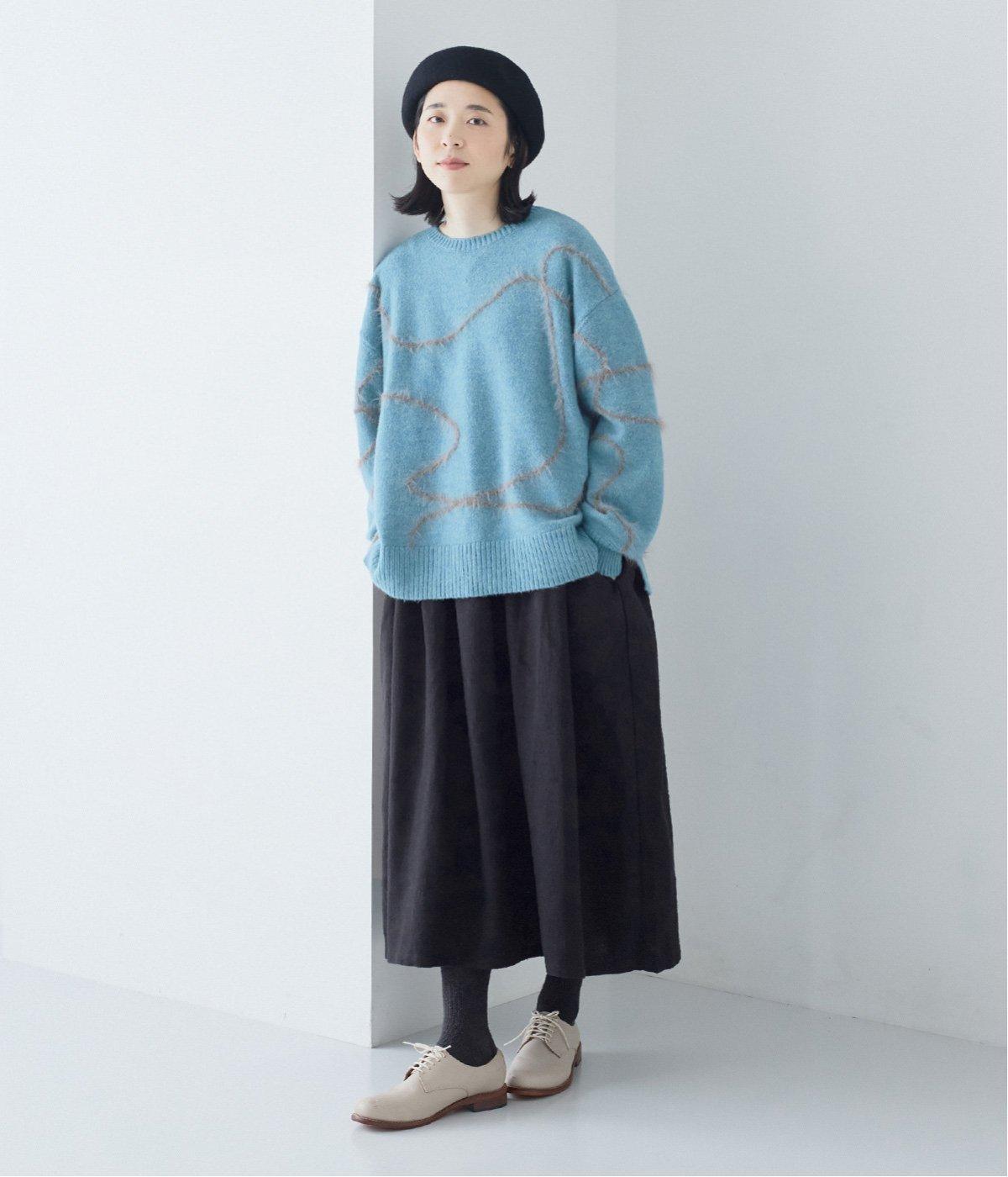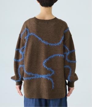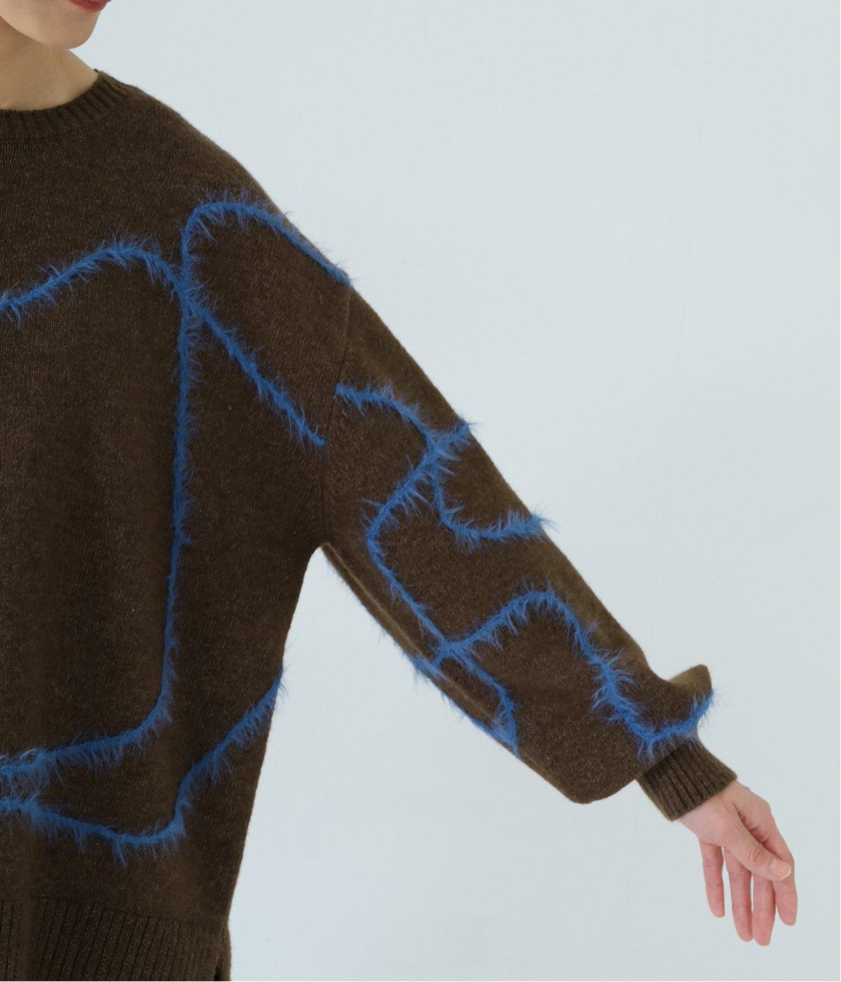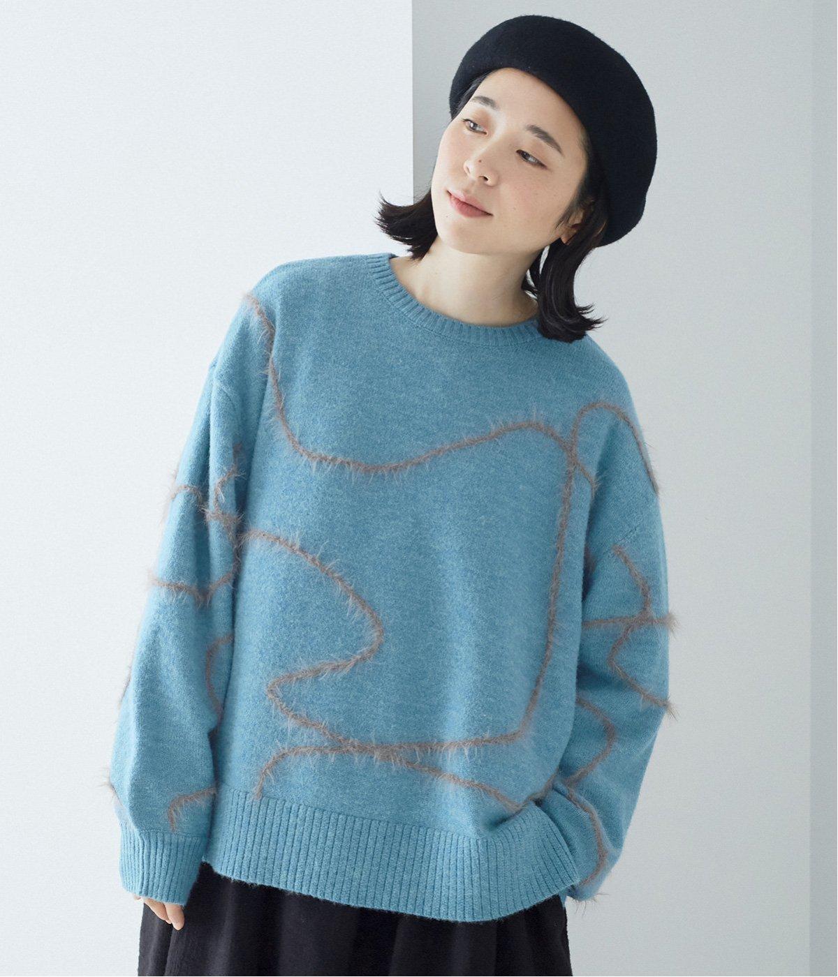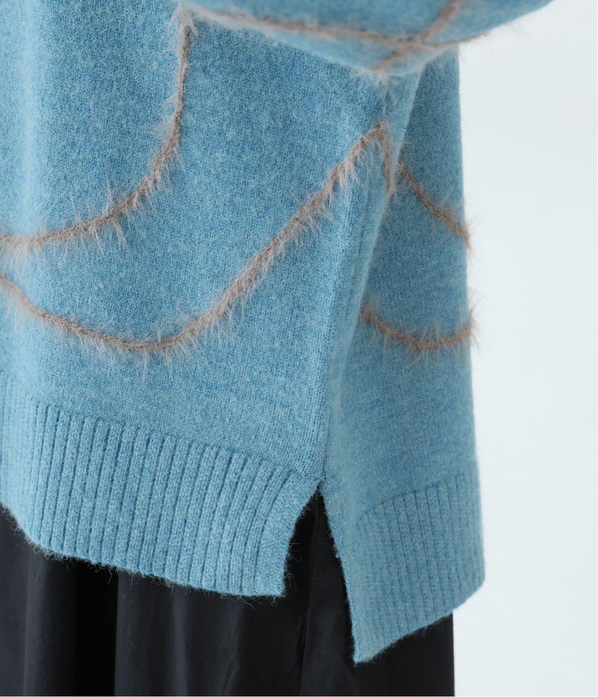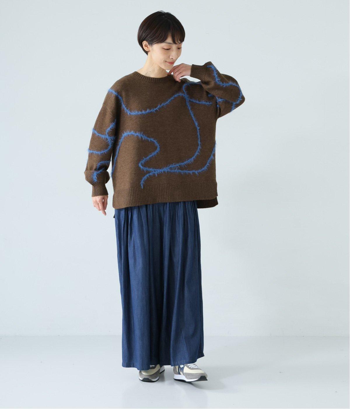 ニット全体にデザインされたラインが目を引くトップス。落ち着いた配色で、コーディネートになじみながらもほどよく存在感を放ちます。ドロップショルダーから成るゆったりとした身幅でこなれた印象に。前後差のある着丈とサイドスリットもポイントです。