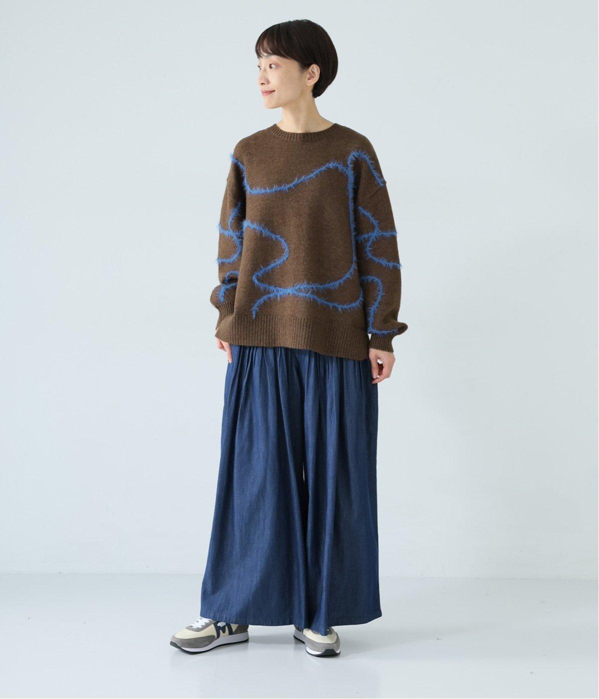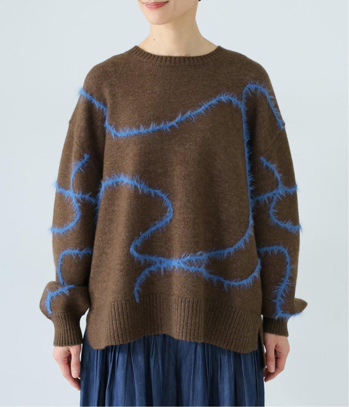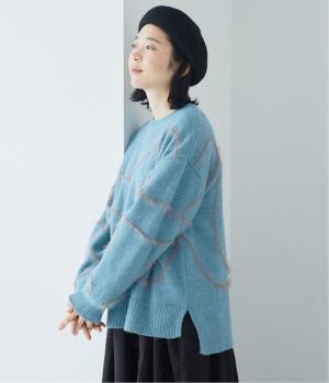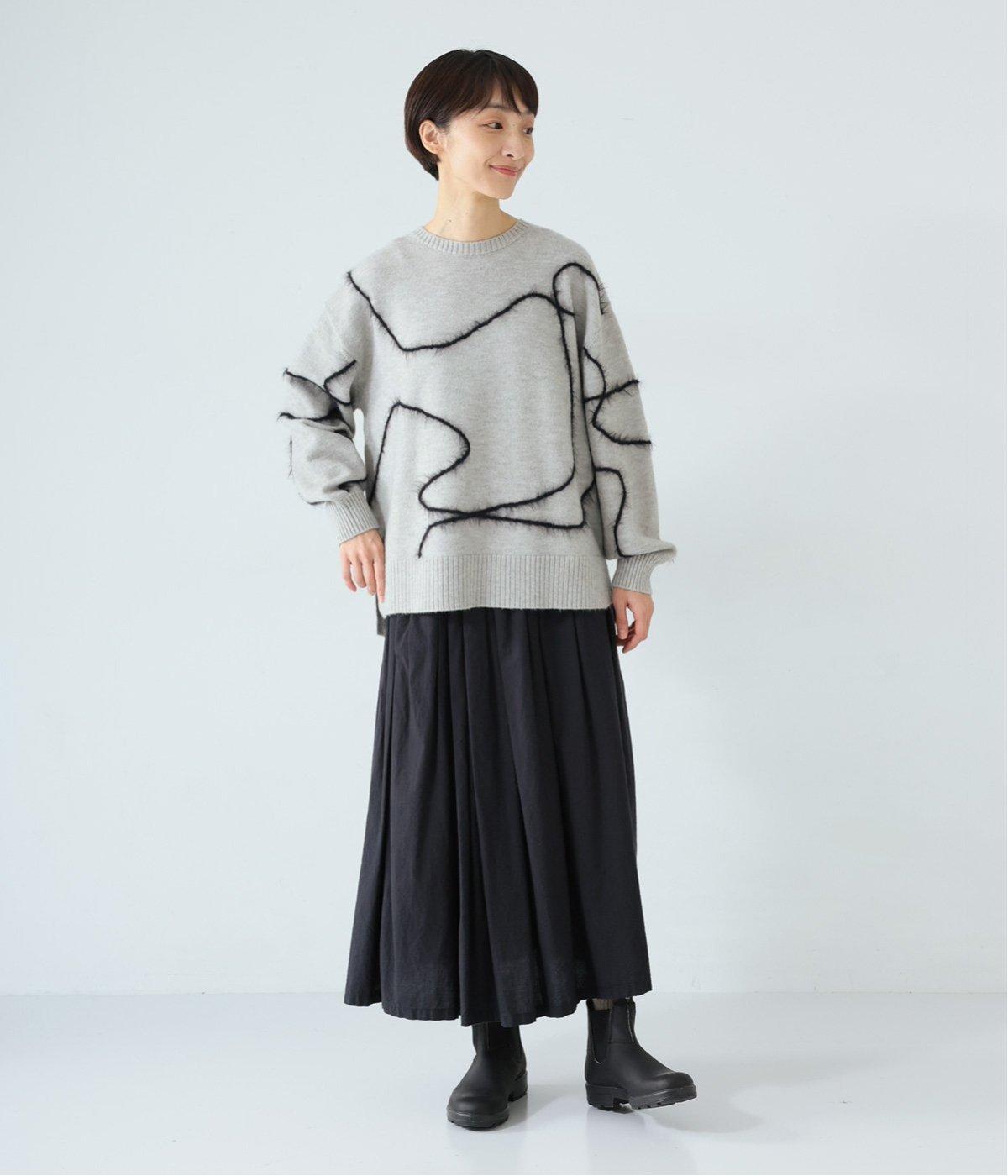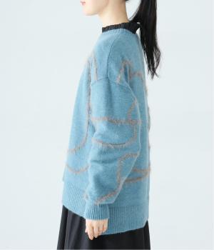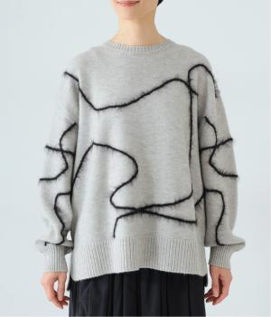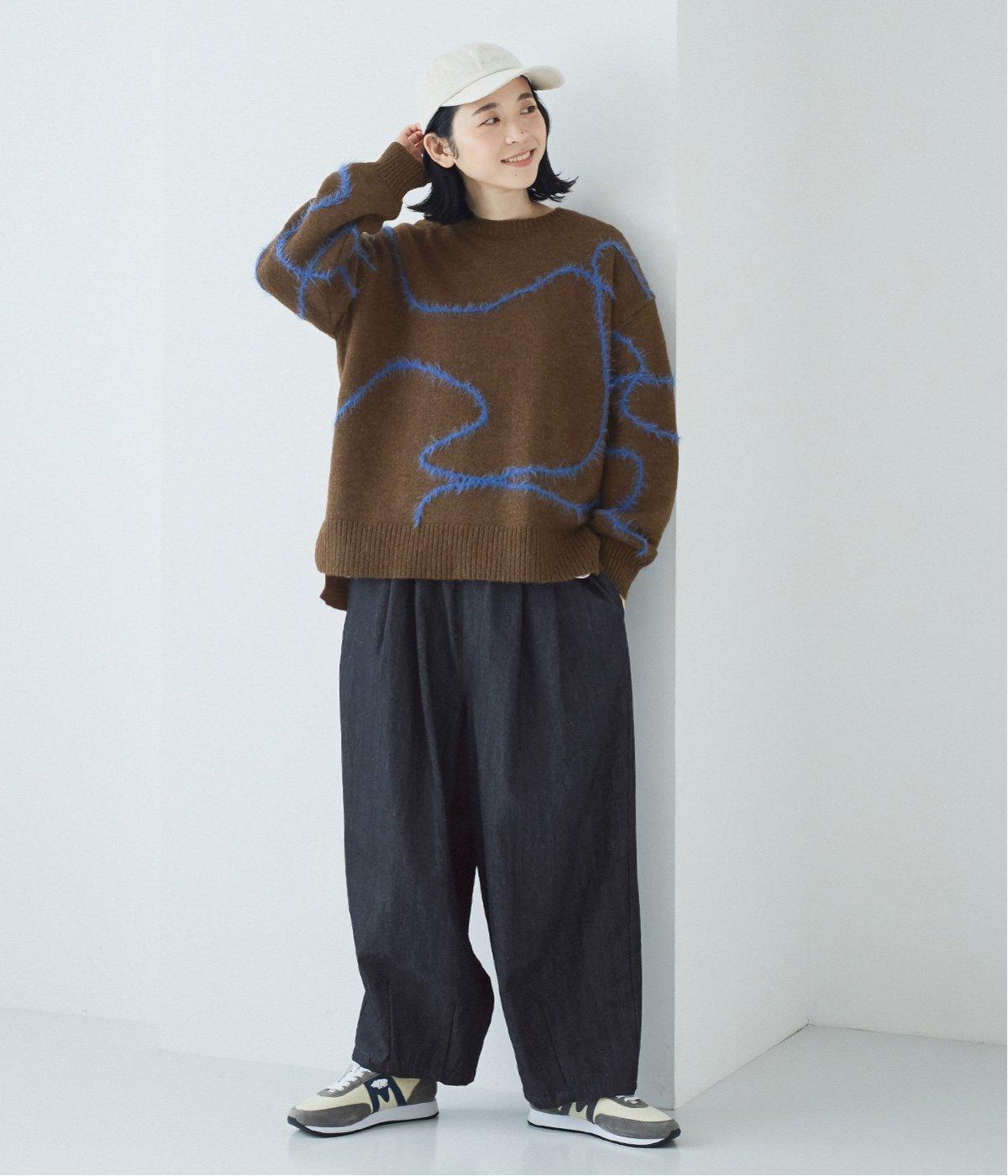 ニット全体にデザインされたラインが目を引くトップス。落ち着いた配色で、コーディネートになじみながらもほどよく存在感を放ちます。ドロップショルダーから成るゆったりとした身幅でこなれた印象に。前後差のある着丈とサイドスリットもポイントです。