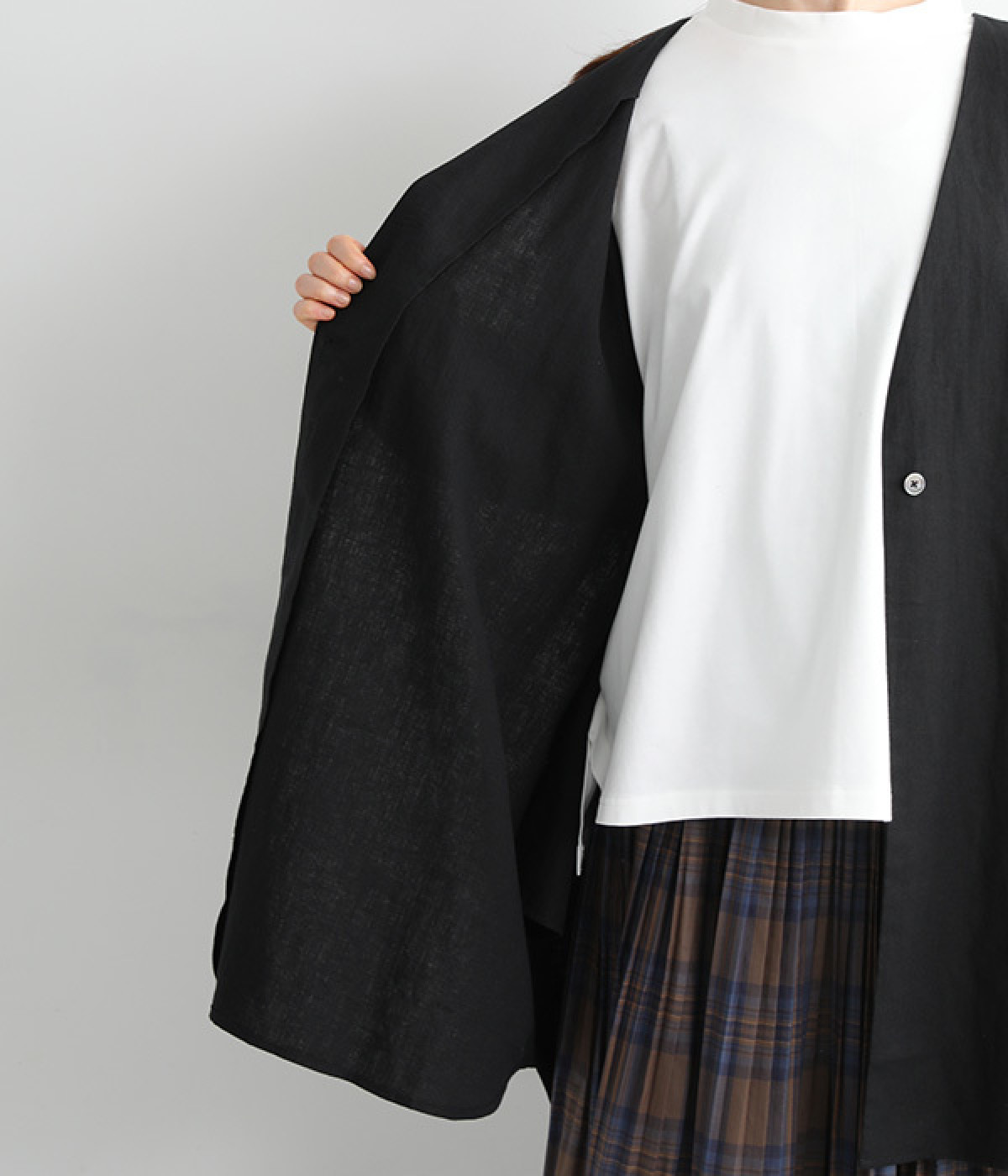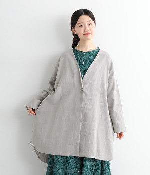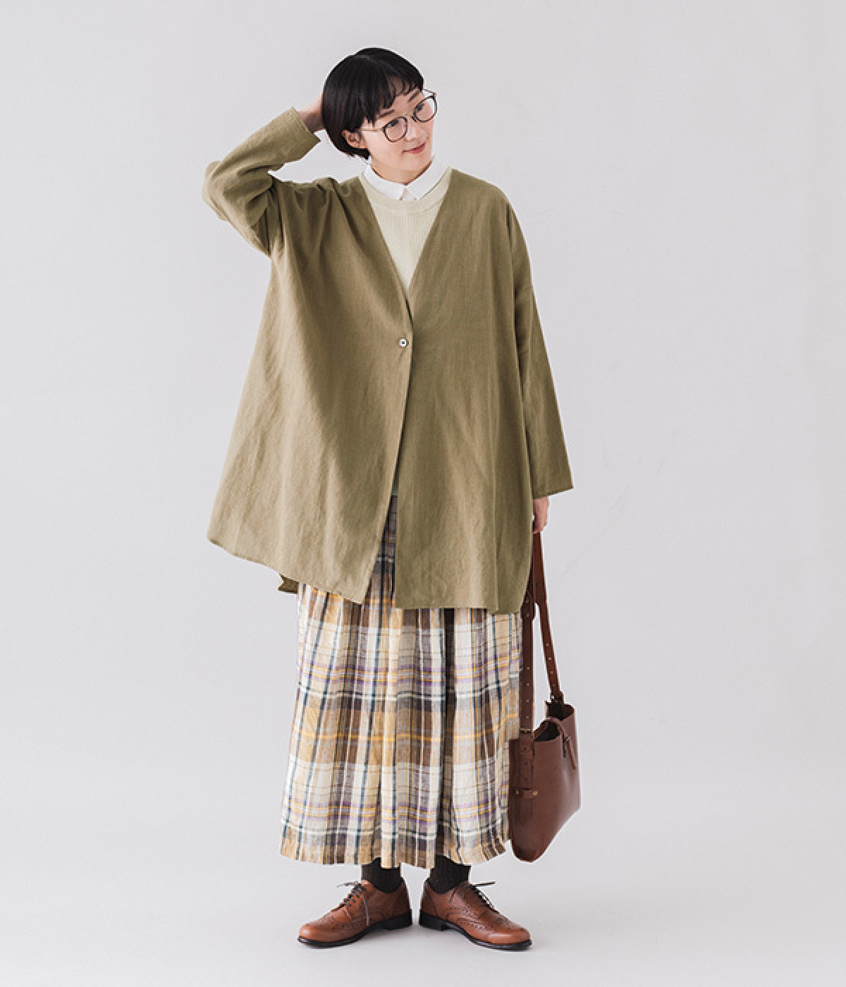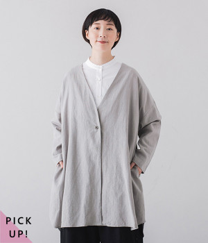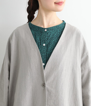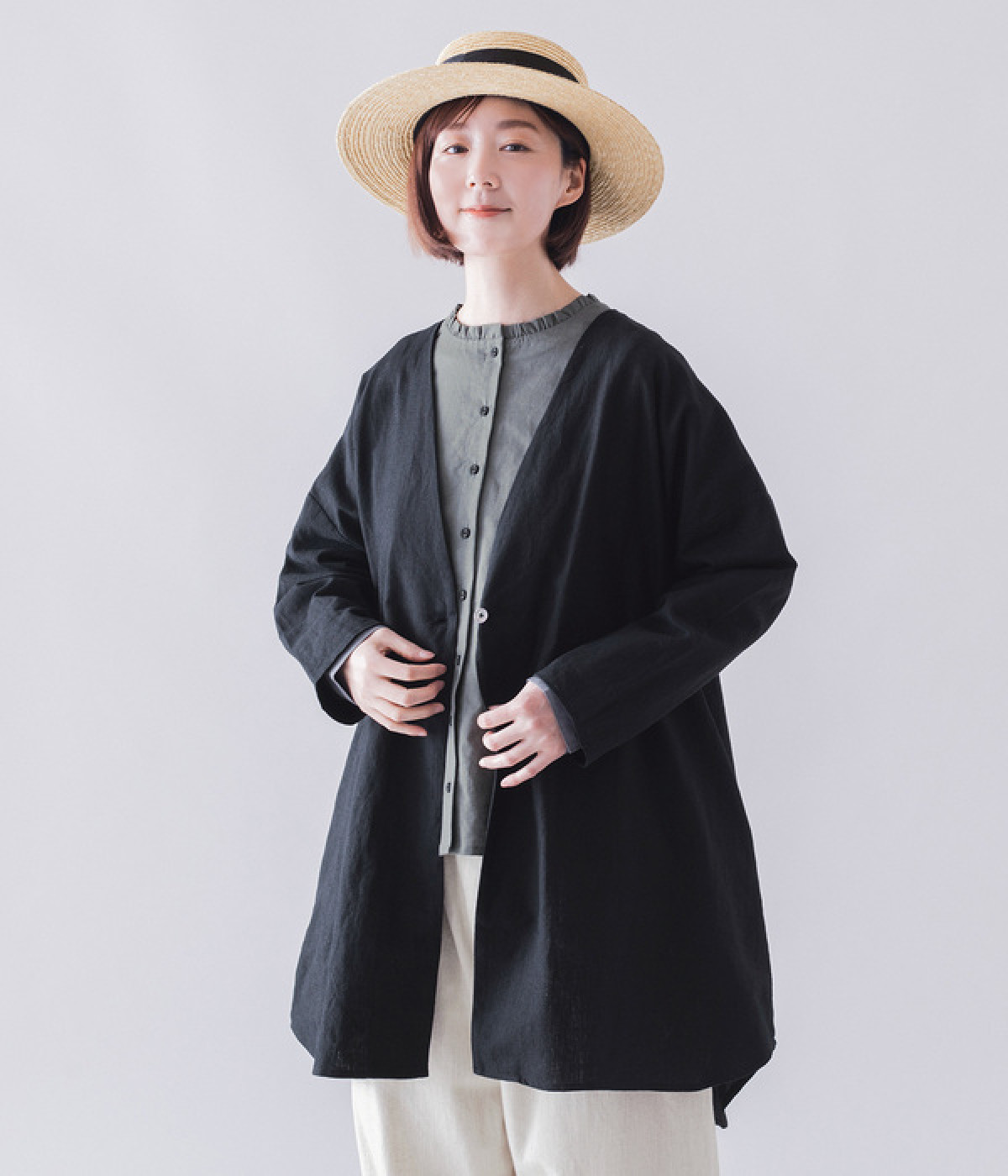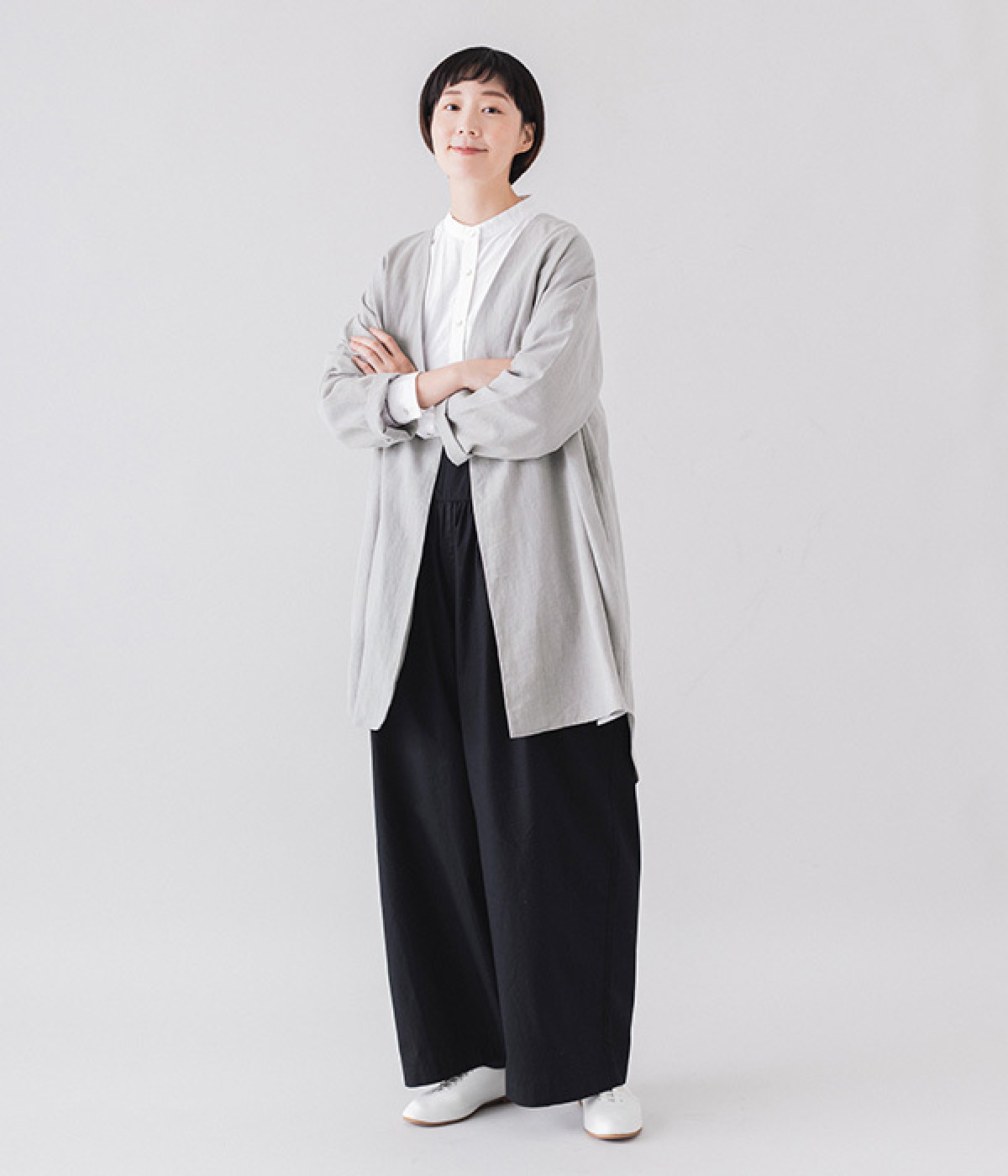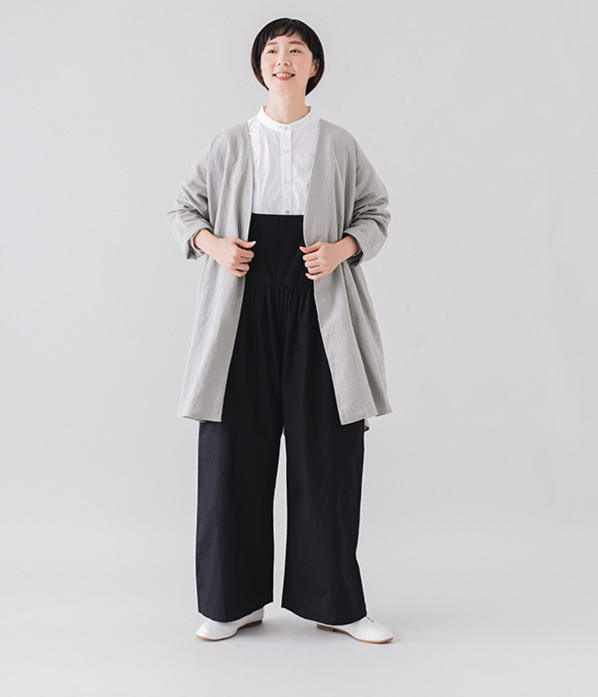 カーディガン代わりに気軽に羽織れるリネンコットンを使用。残暑厳しい時期や、朝晩の寒暖差がある季節の合間にも重宝します。