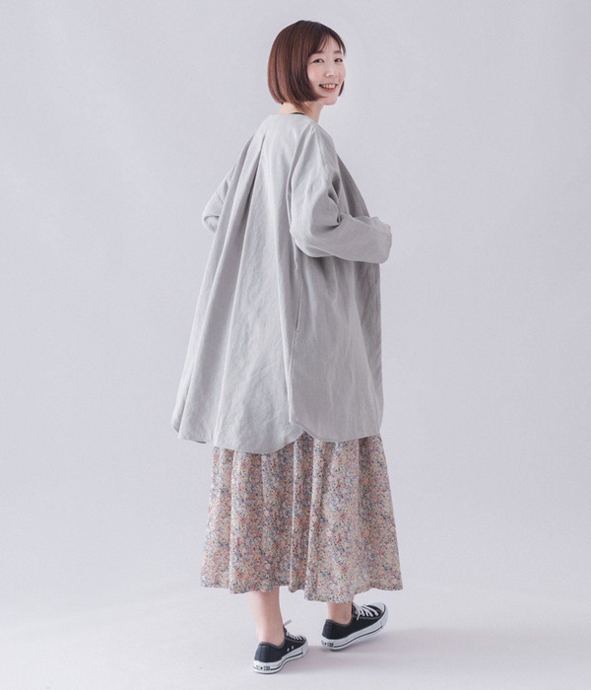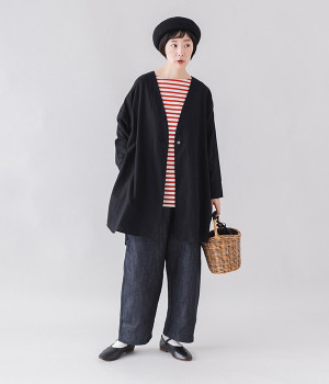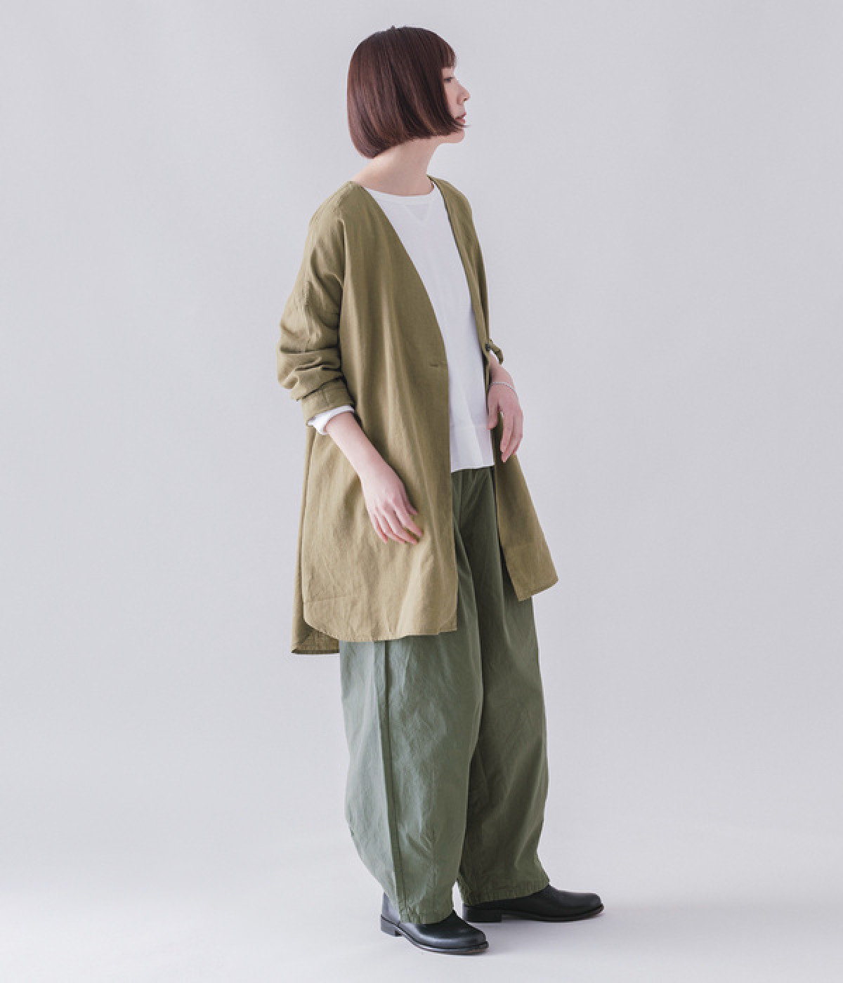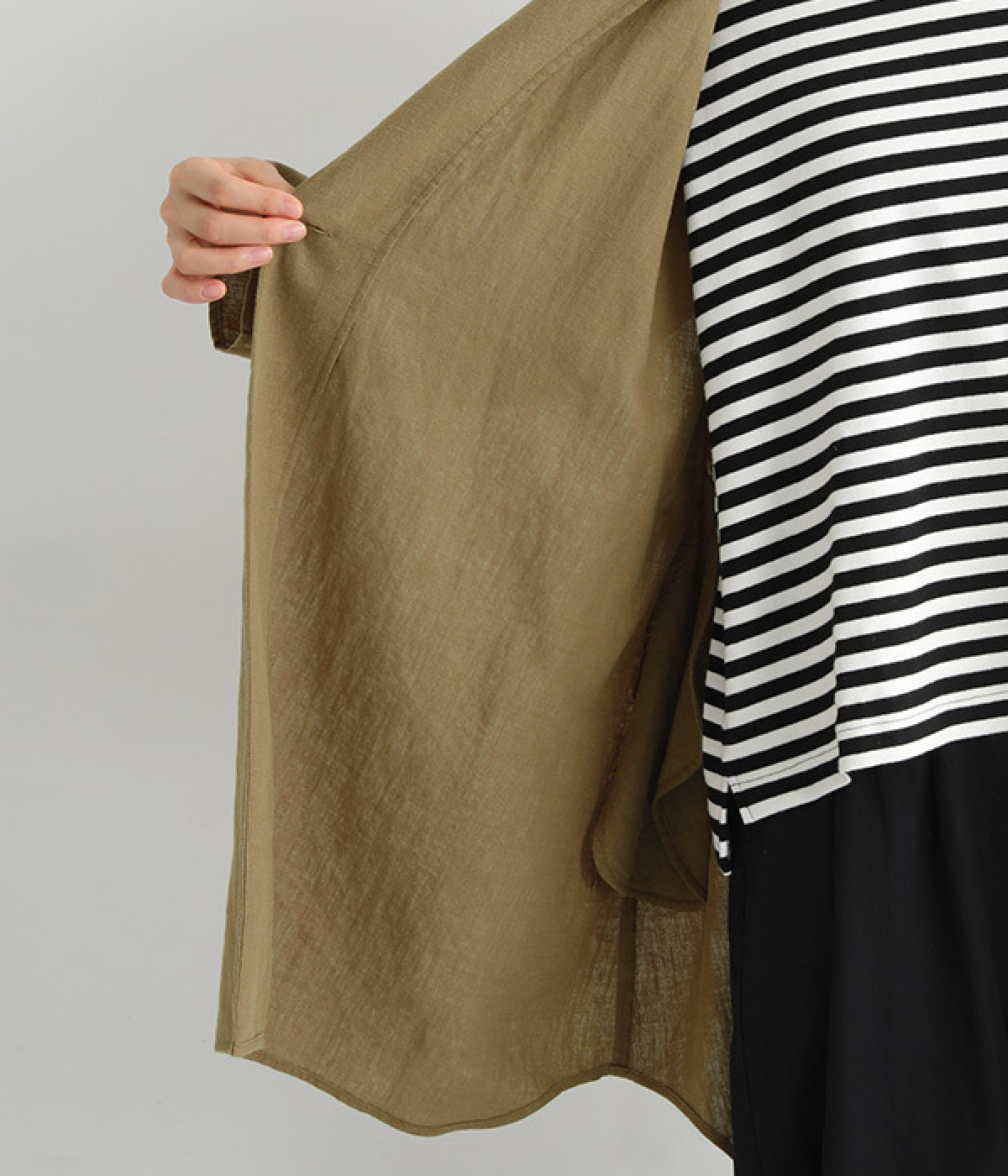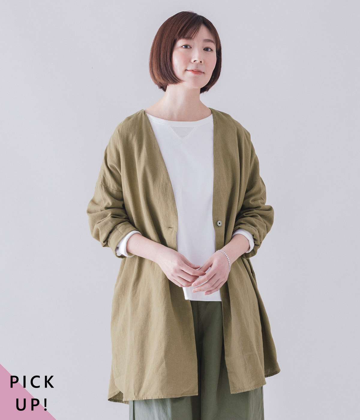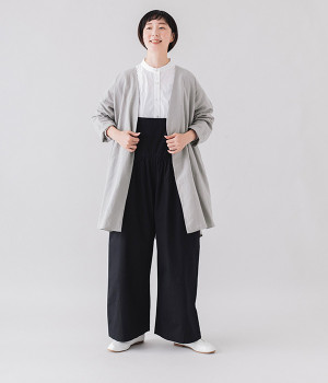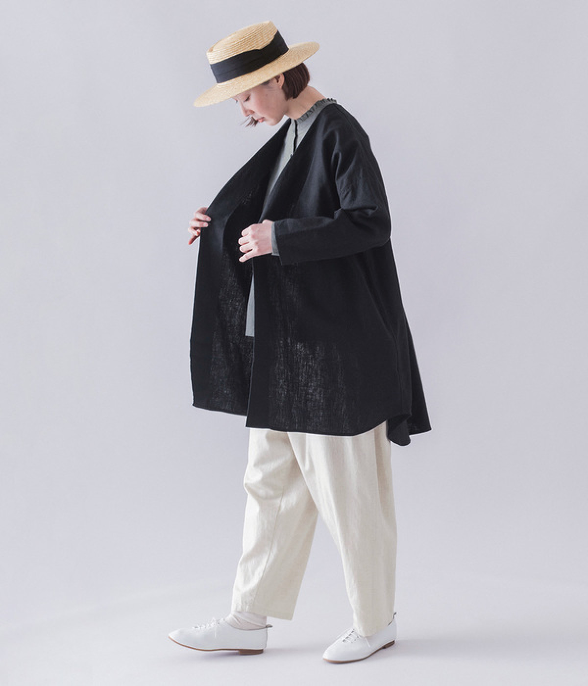 カーディガン代わりに気軽に羽織れるリネンコットンを使用。残暑厳しい時期や、朝晩の寒暖差がある季節の合間にも重宝します。