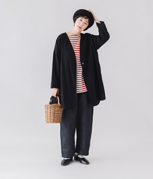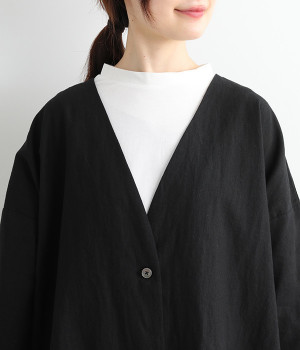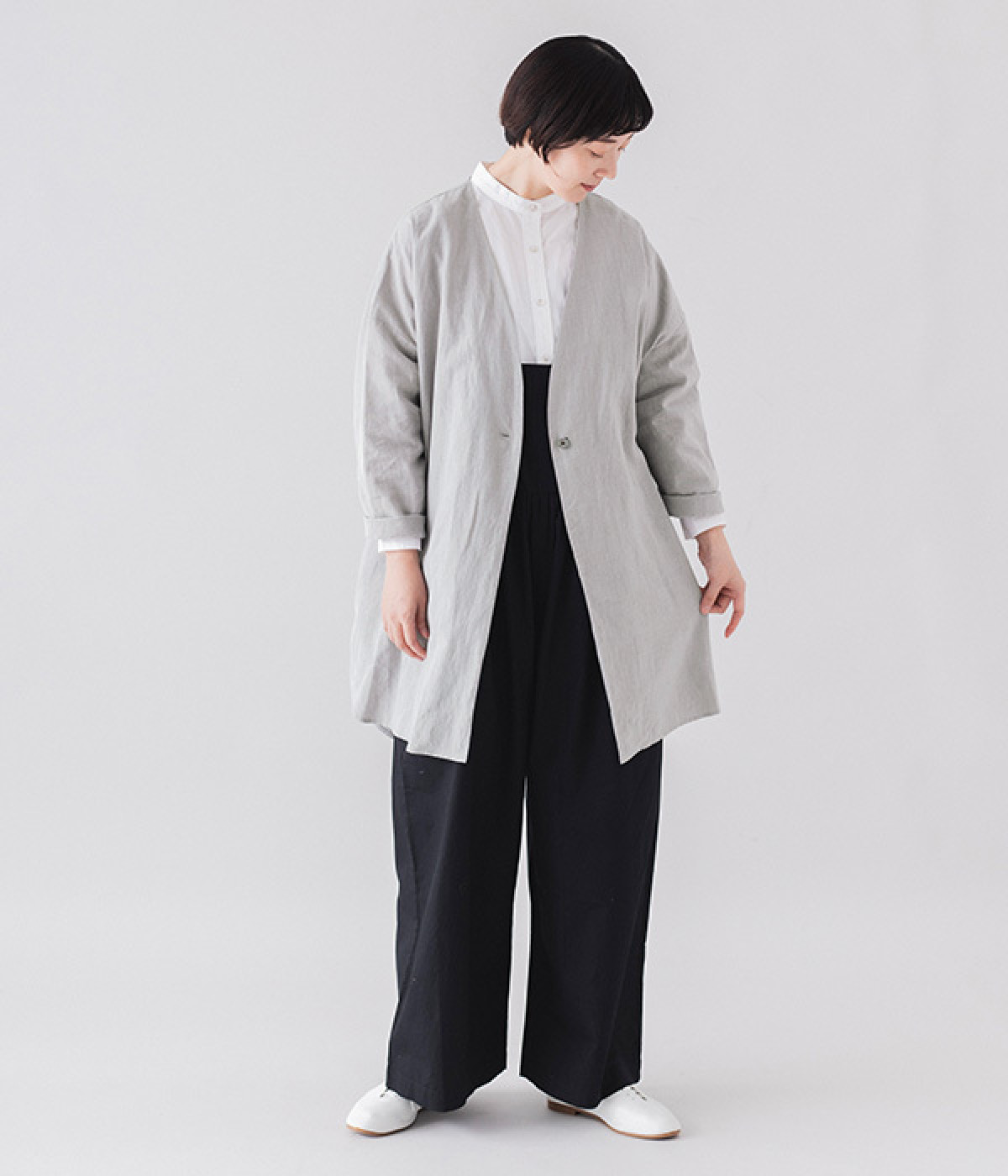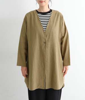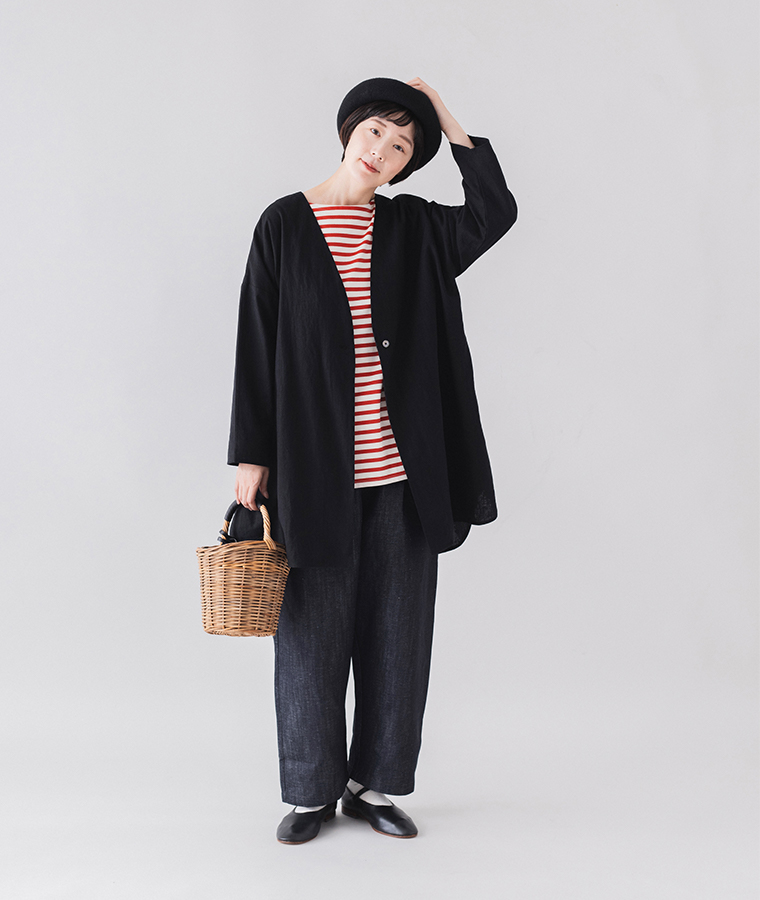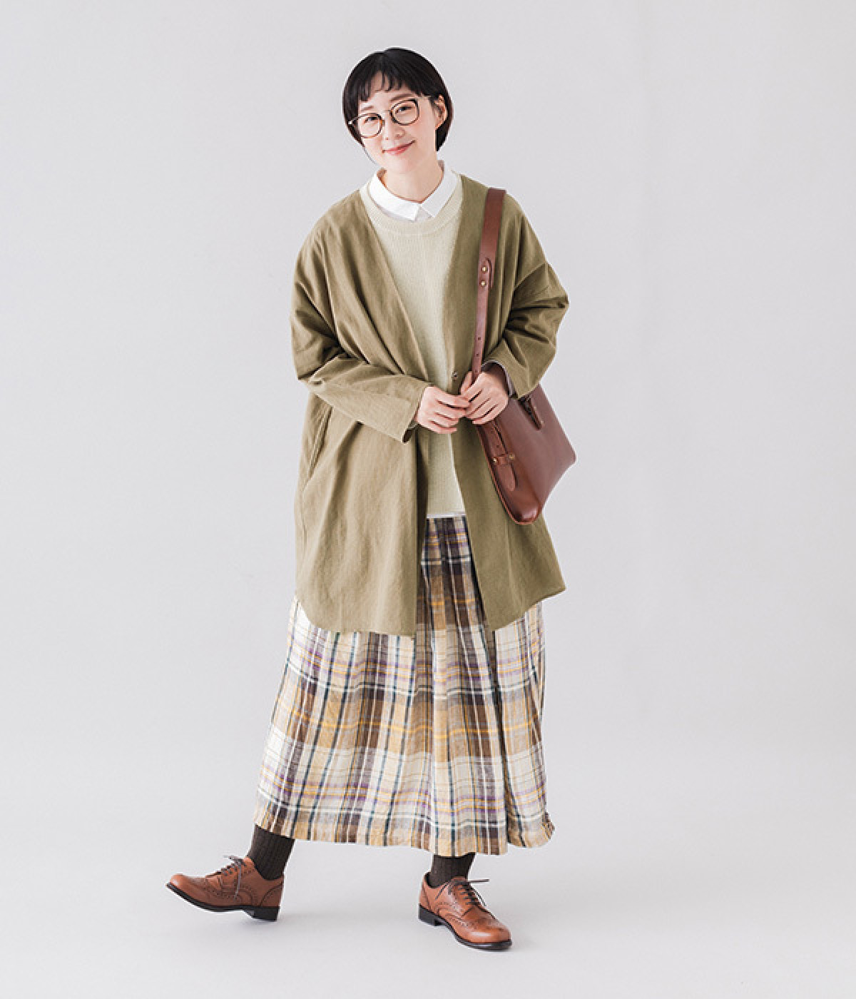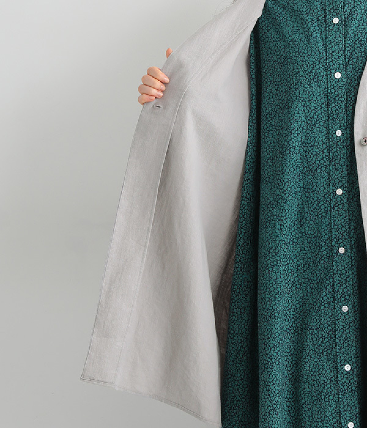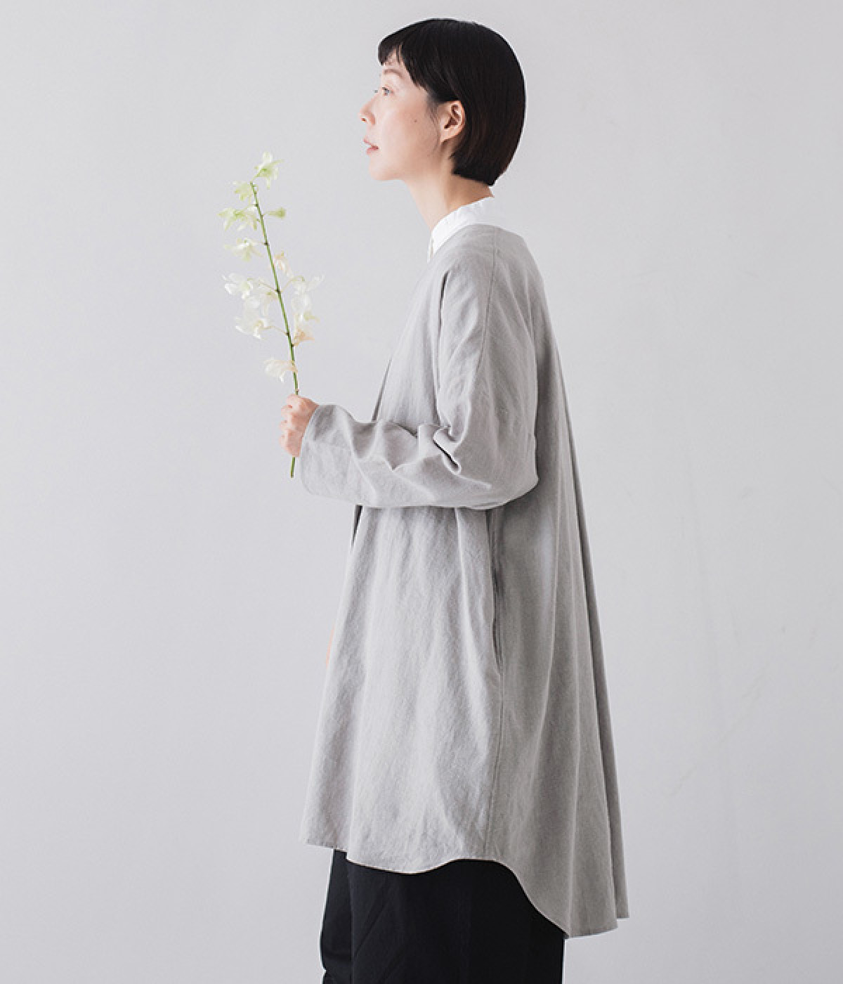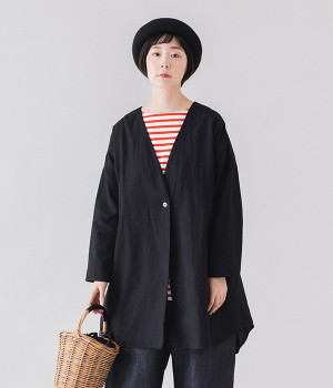 カーディガン代わりに気軽に羽織れるリネンコットンを使用。残暑厳しい時期や、朝晩の寒暖差がある季節の合間にも重宝します。