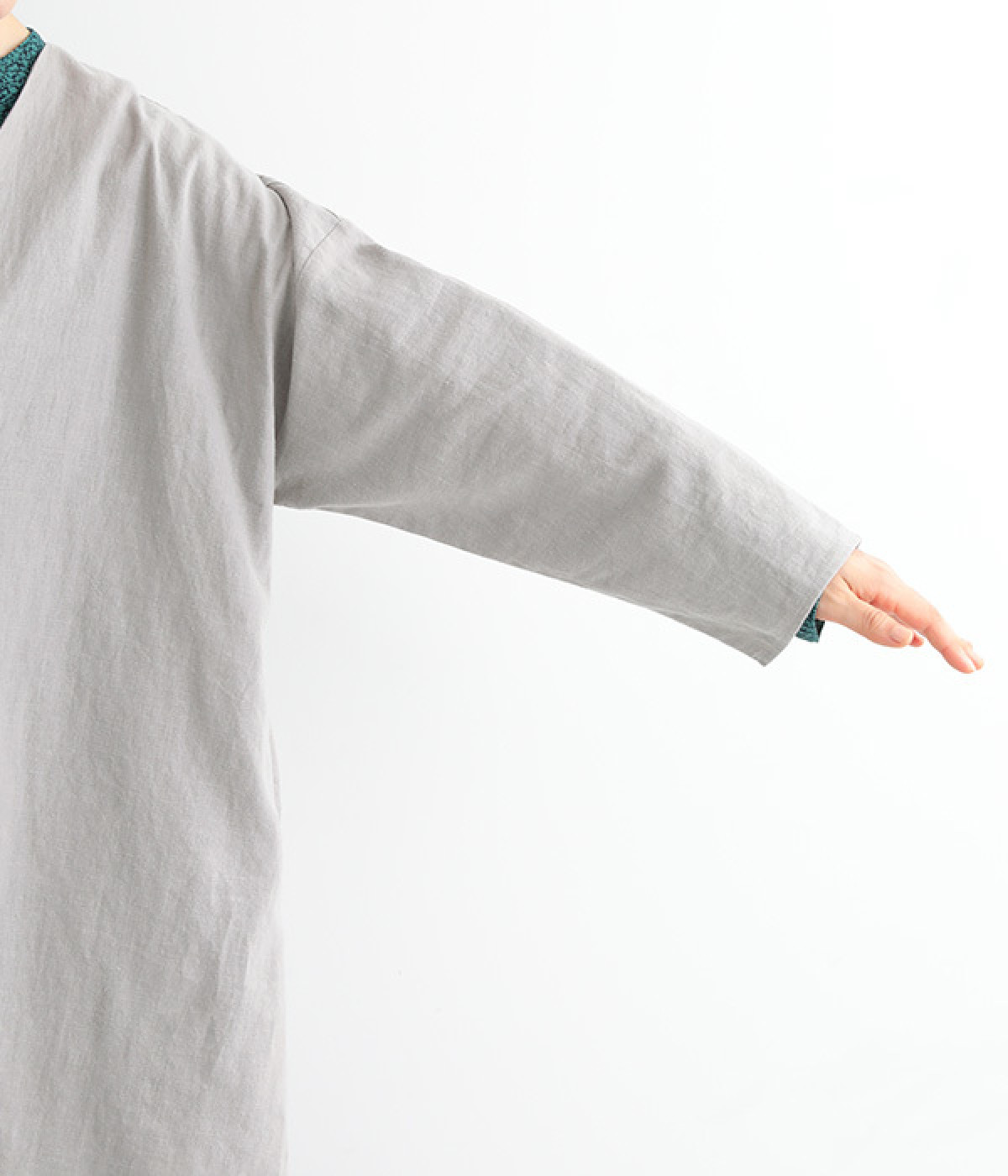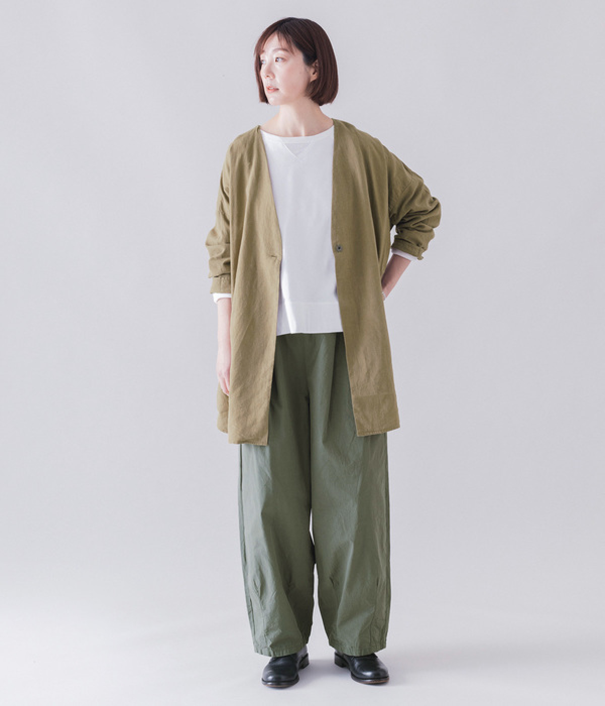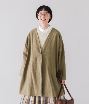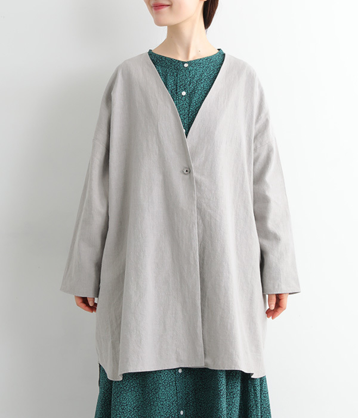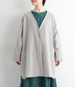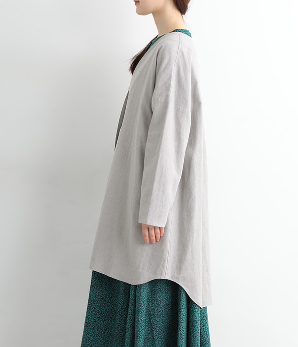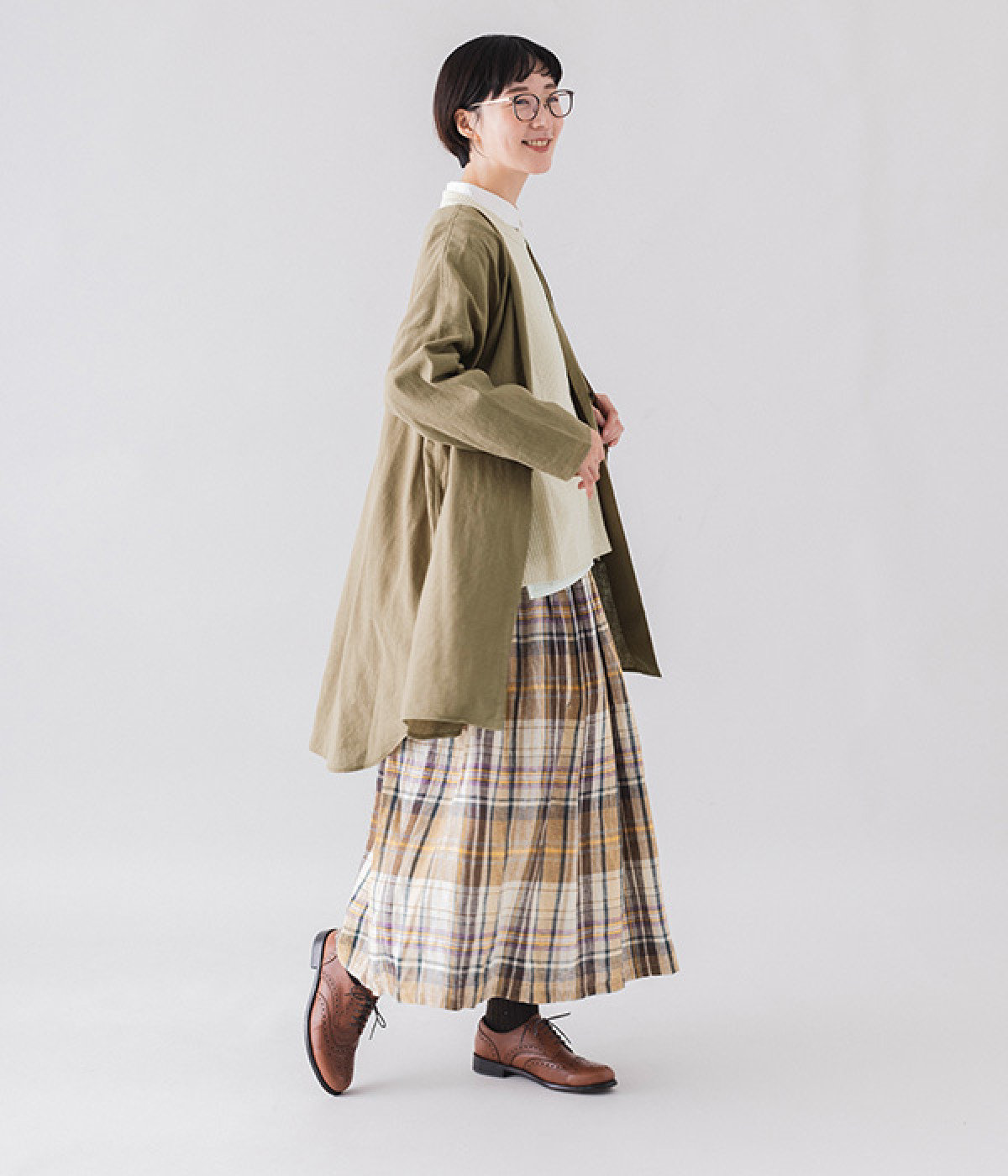 カーディガン代わりに気軽に羽織れるリネンコットンを使用。残暑厳しい時期や、朝晩の寒暖差がある季節の合間にも重宝します。