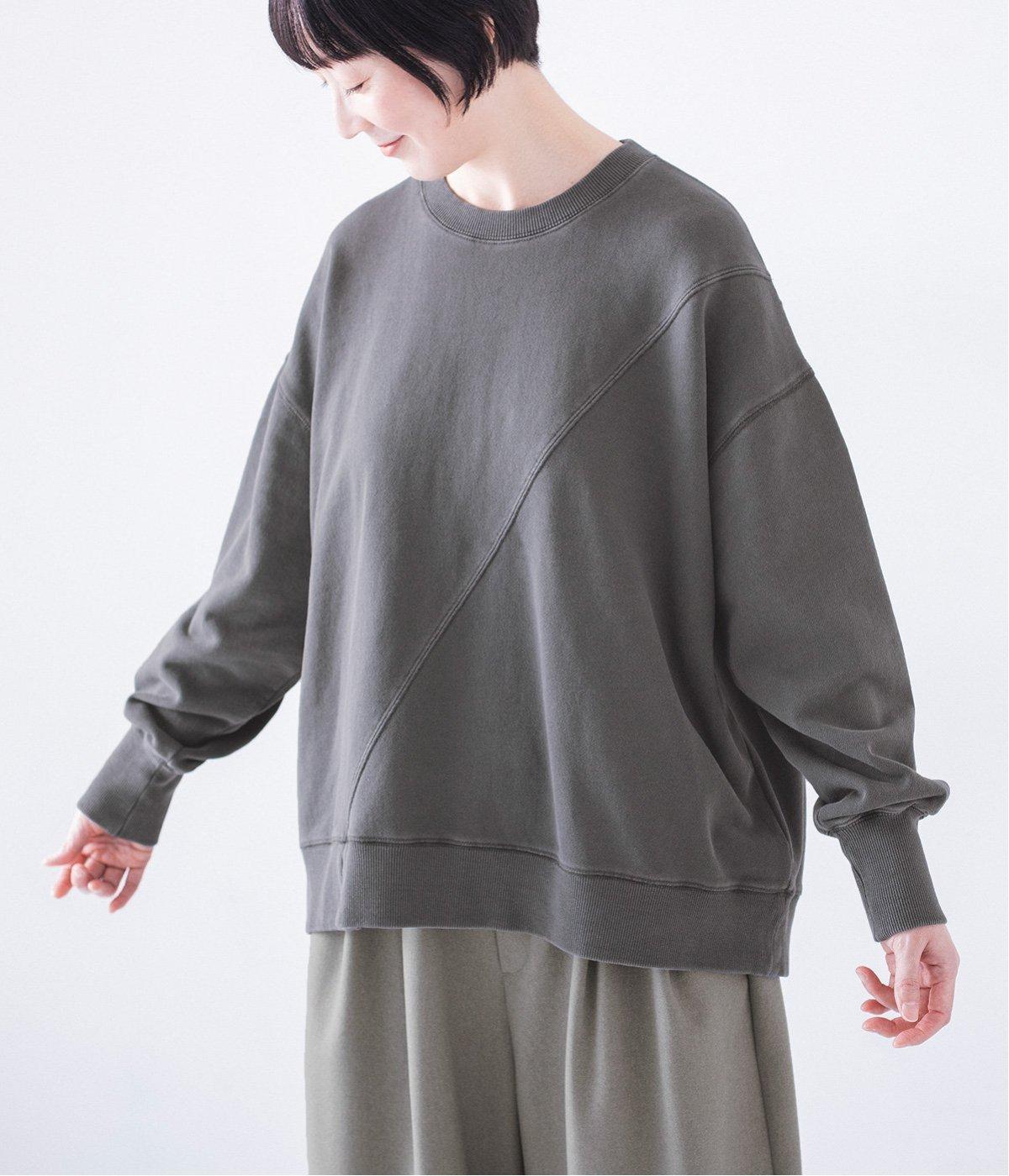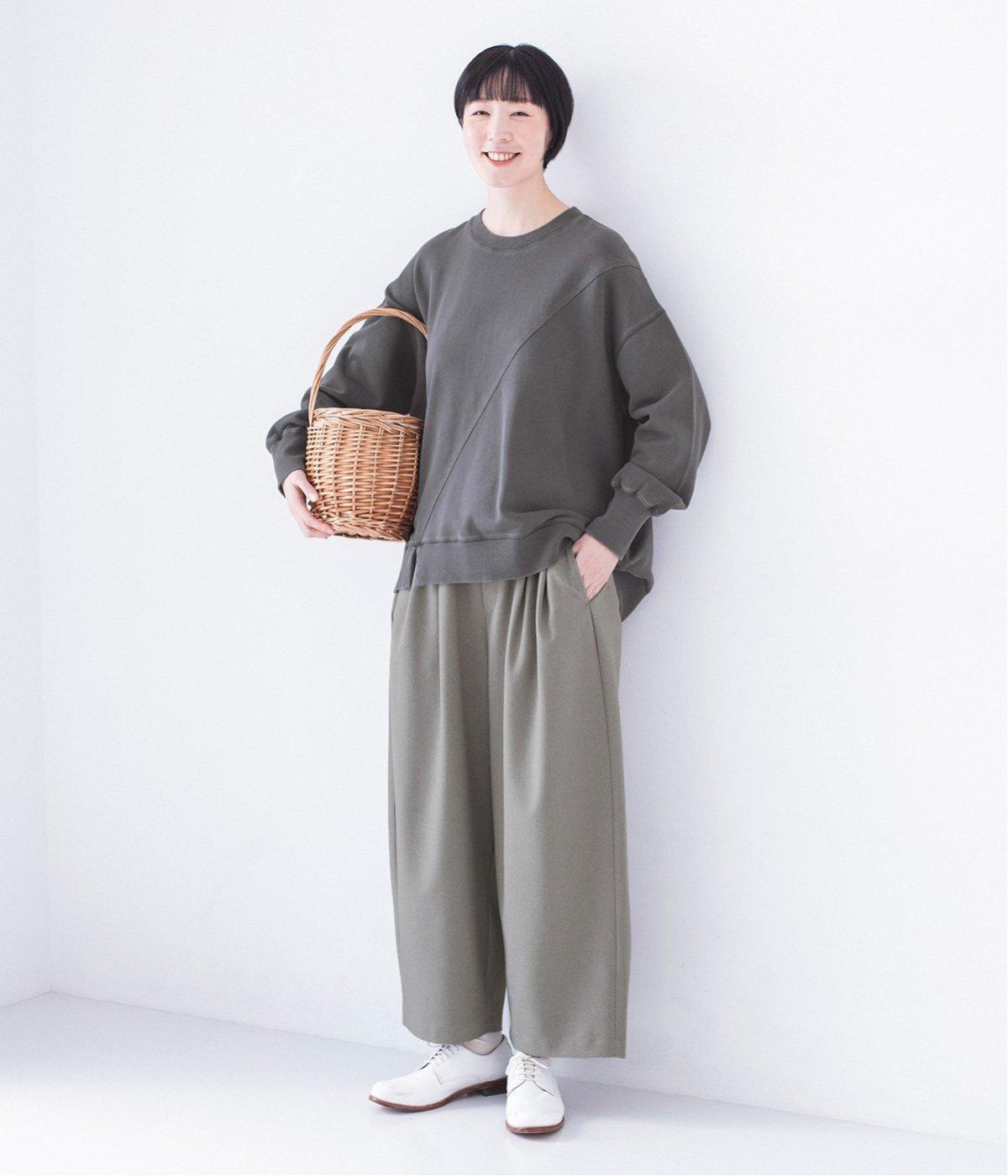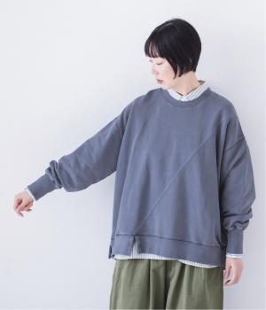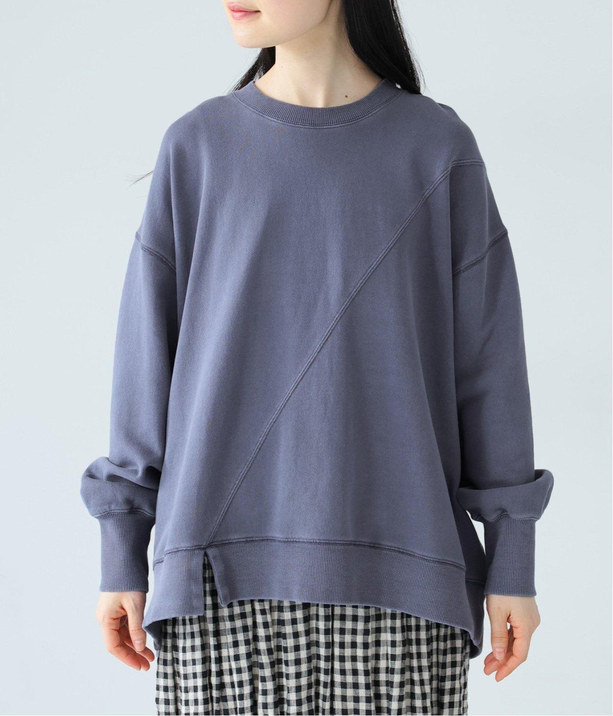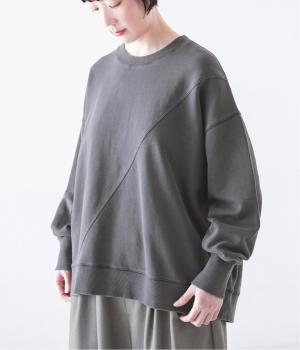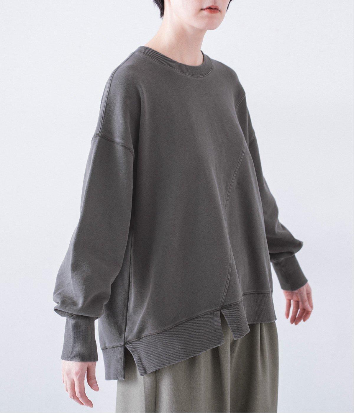 前身頃に大胆な斜め切り替えと裾スリットを施した、デザイン性の高い裏毛プルオーバー。ゆったりとしたサイズ感と長めの着丈で腰まわりをカバーします。前後差のあるシルエットがパンツにもスカートにも好相性。ほどよく膨らみのある袖が、さりげない可愛らしさを添えます。