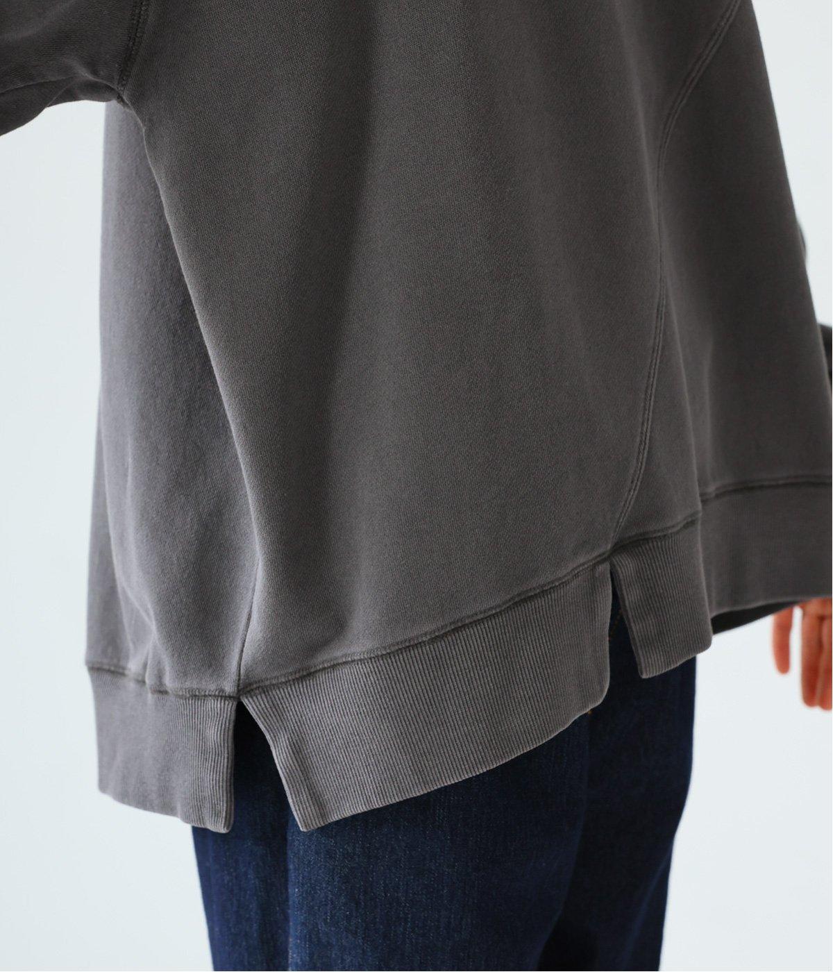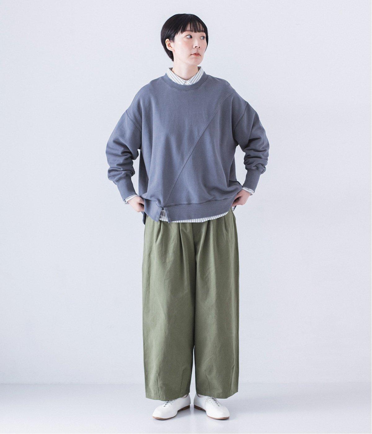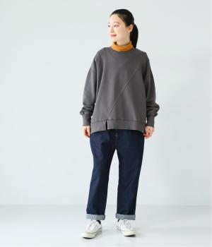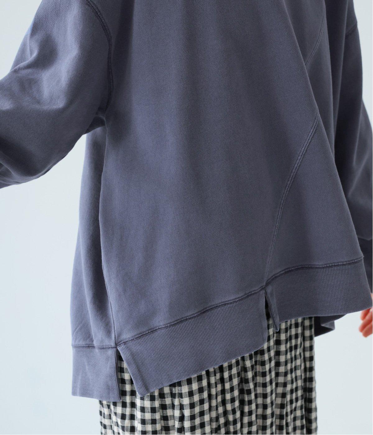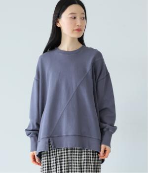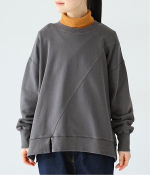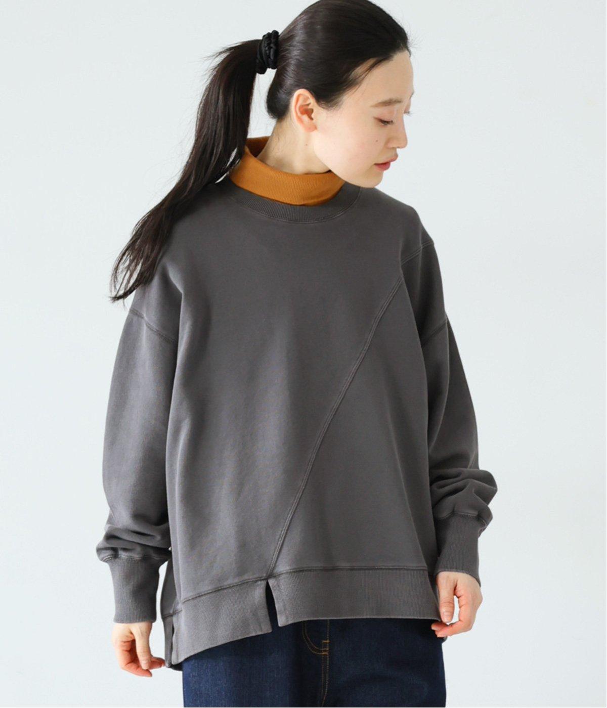 前身頃に大胆な斜め切り替えと裾スリットを施した、デザイン性の高い裏毛プルオーバー。ゆったりとしたサイズ感と長めの着丈で腰まわりをカバーします。前後差のあるシルエットがパンツにもスカートにも好相性。ほどよく膨らみのある袖が、さりげない可愛らしさを添えます。