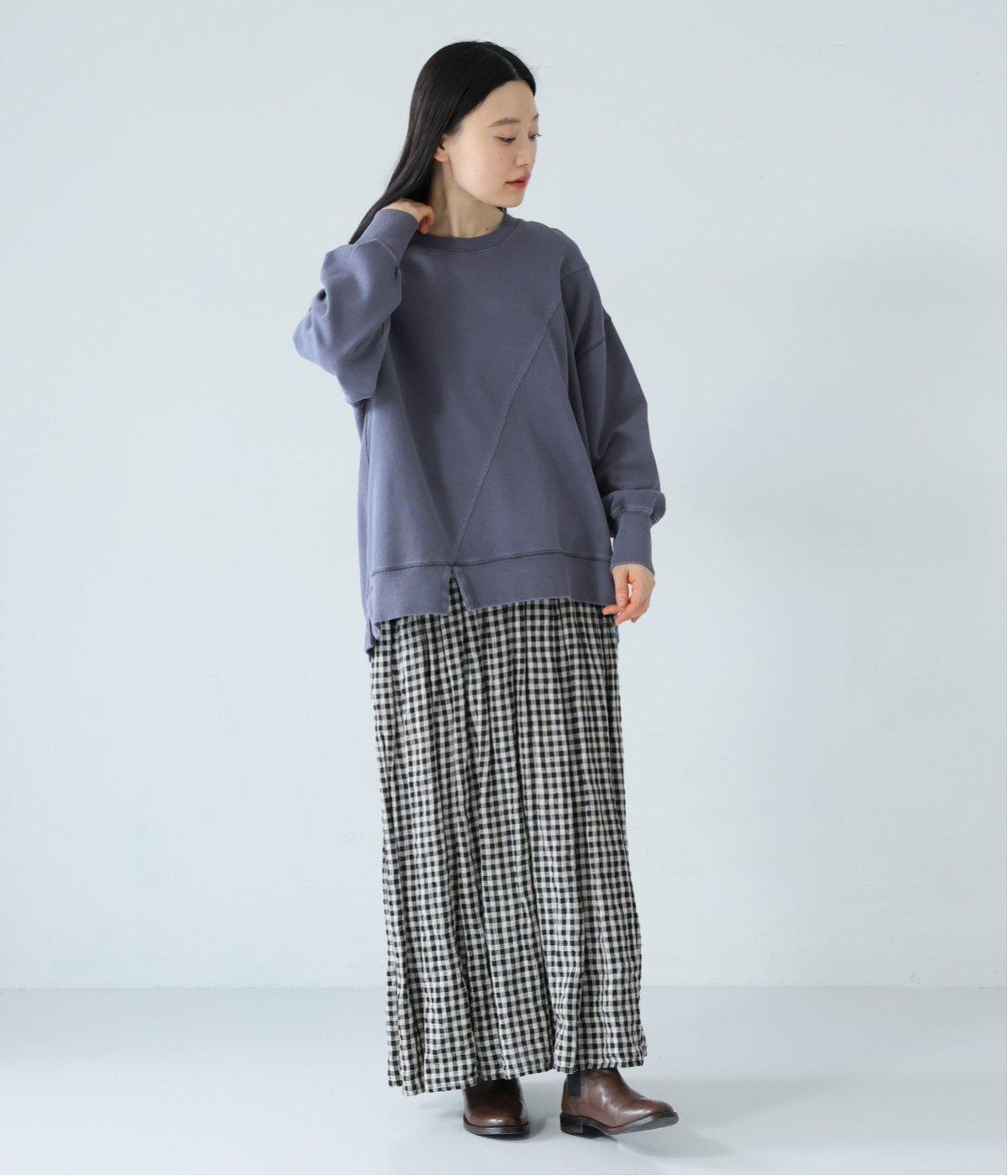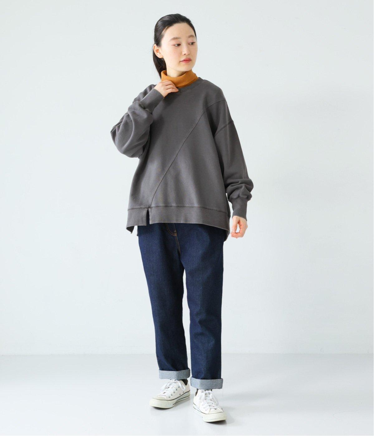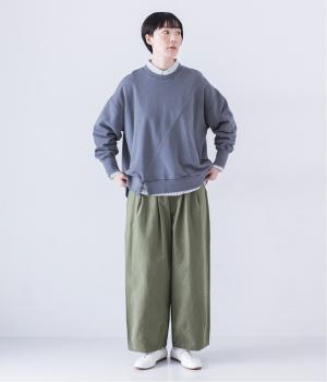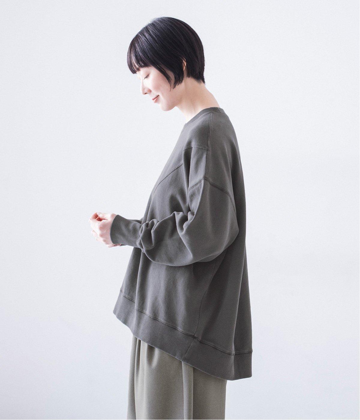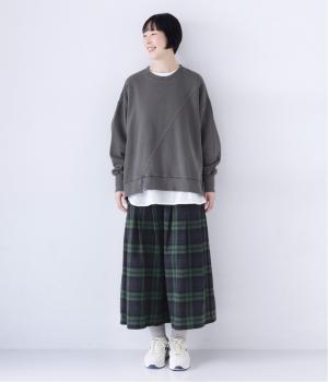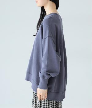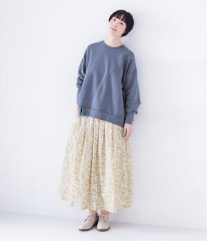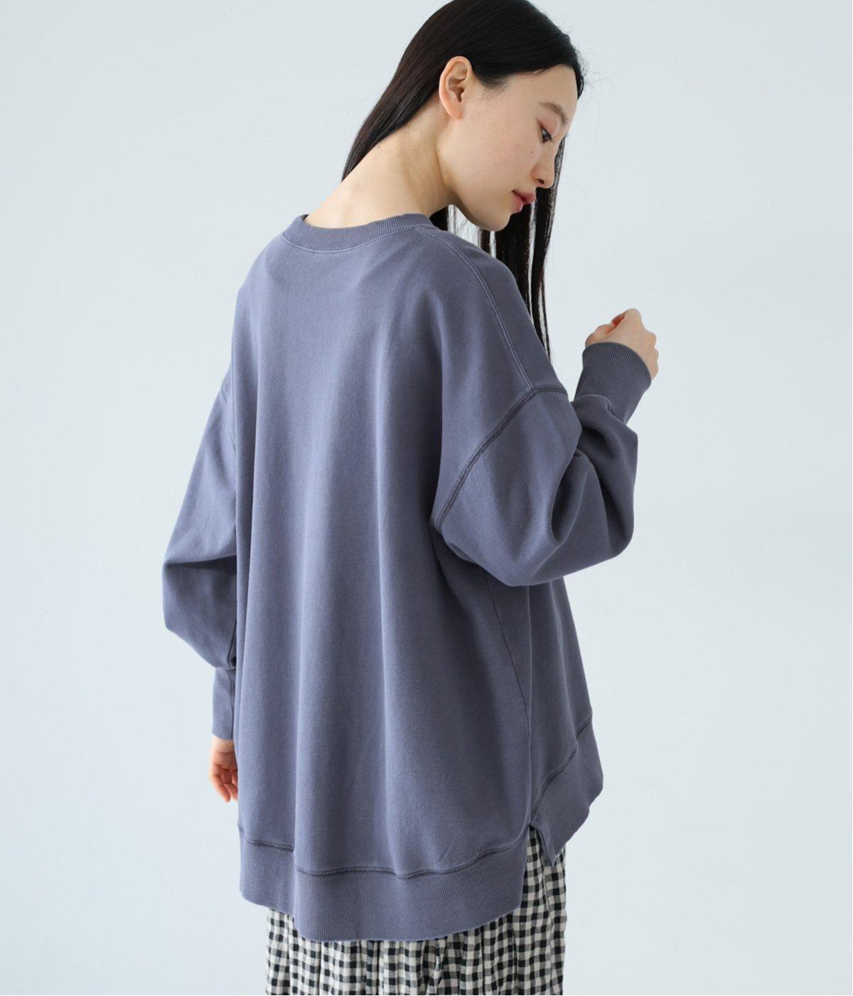 前身頃に大胆な斜め切り替えと裾スリットを施した、デザイン性の高い裏毛プルオーバー。ゆったりとしたサイズ感と長めの着丈で腰まわりをカバーします。前後差のあるシルエットがパンツにもスカートにも好相性。ほどよく膨らみのある袖が、さりげない可愛らしさを添えます。