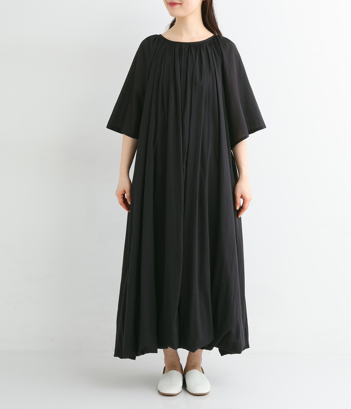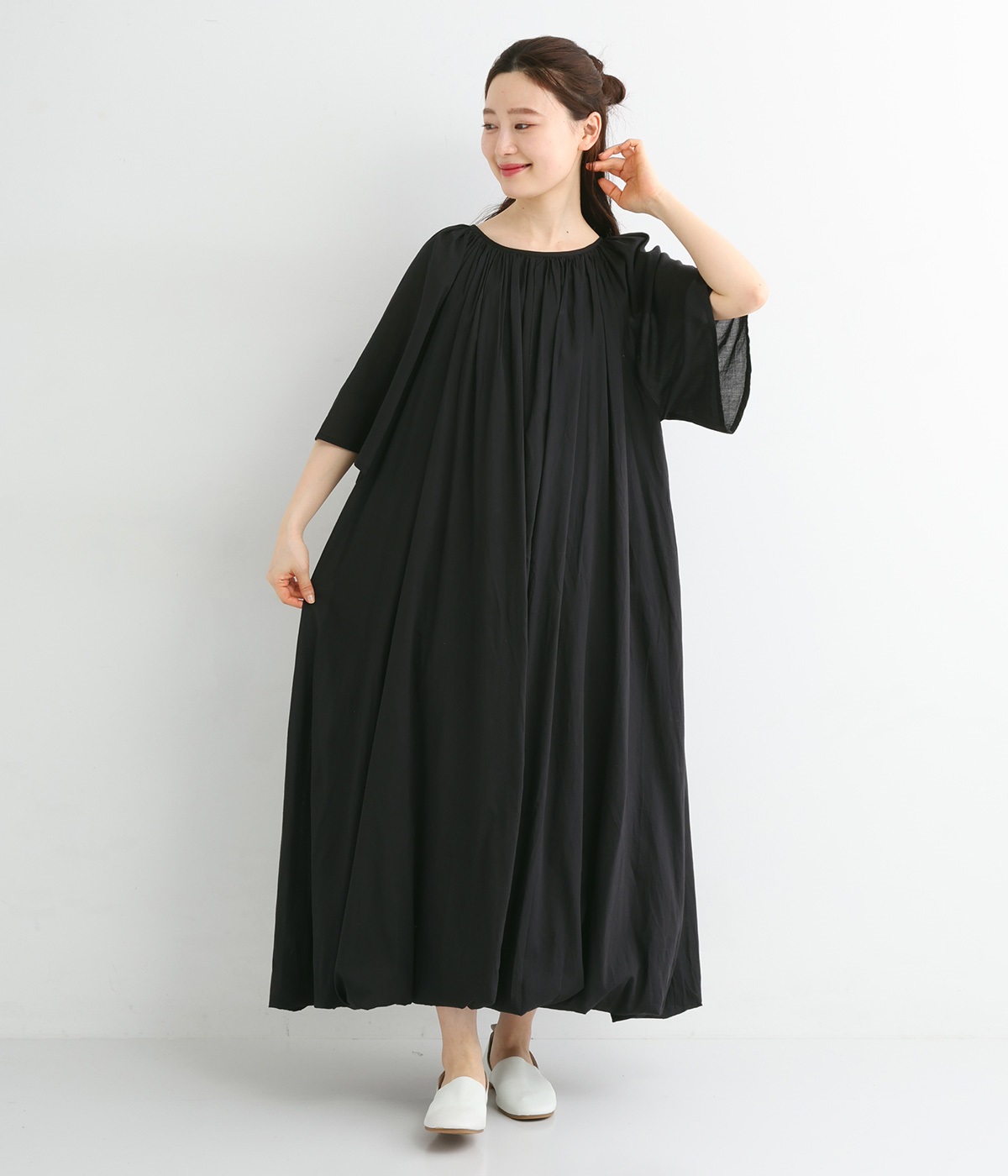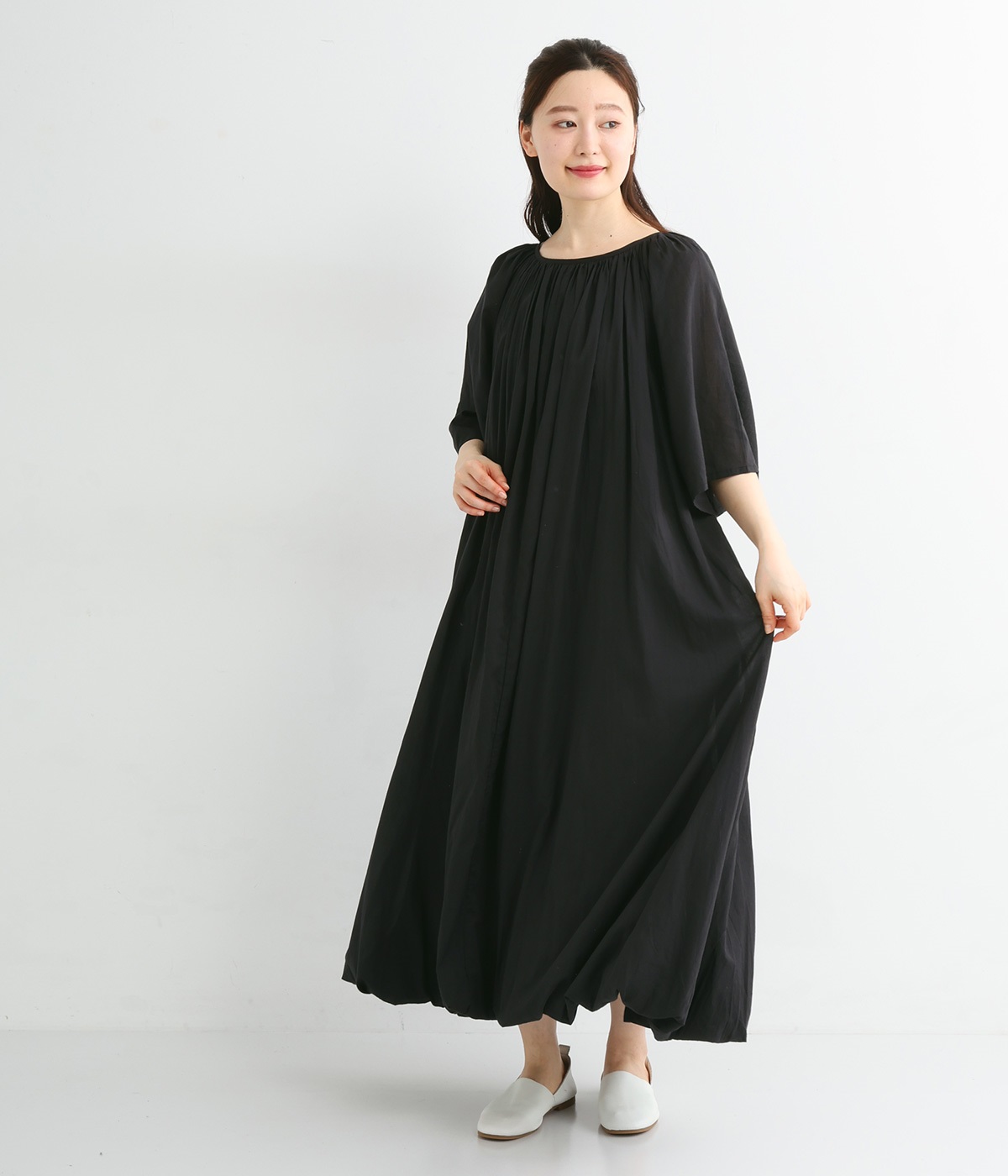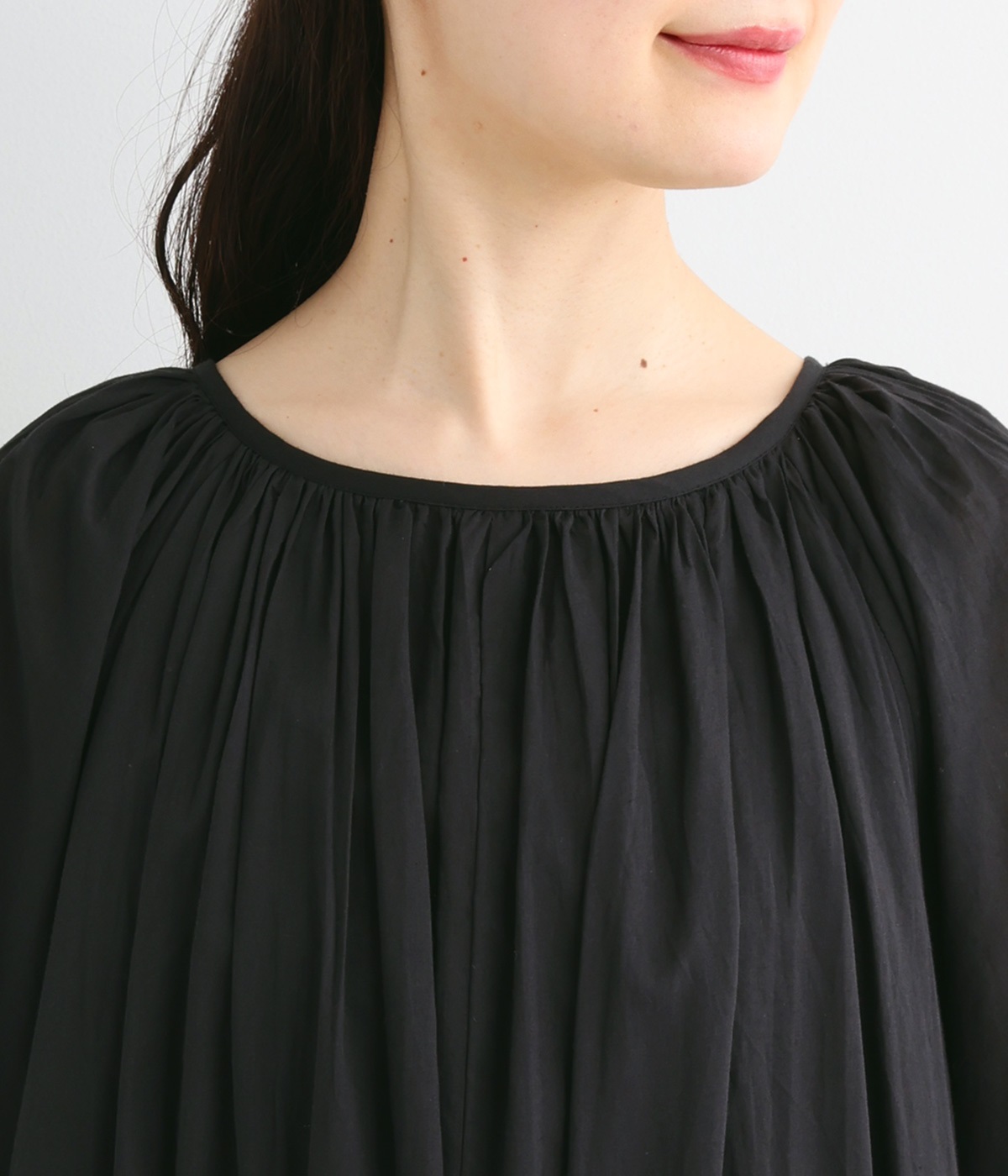 軽さのあるコットン素材をなめらかな手触りにした、上品な雰囲気を放つ生地に仕立てました。ボリューミーなシルエットでも適度な落ち感があるので、広がり過ぎないのが◎。