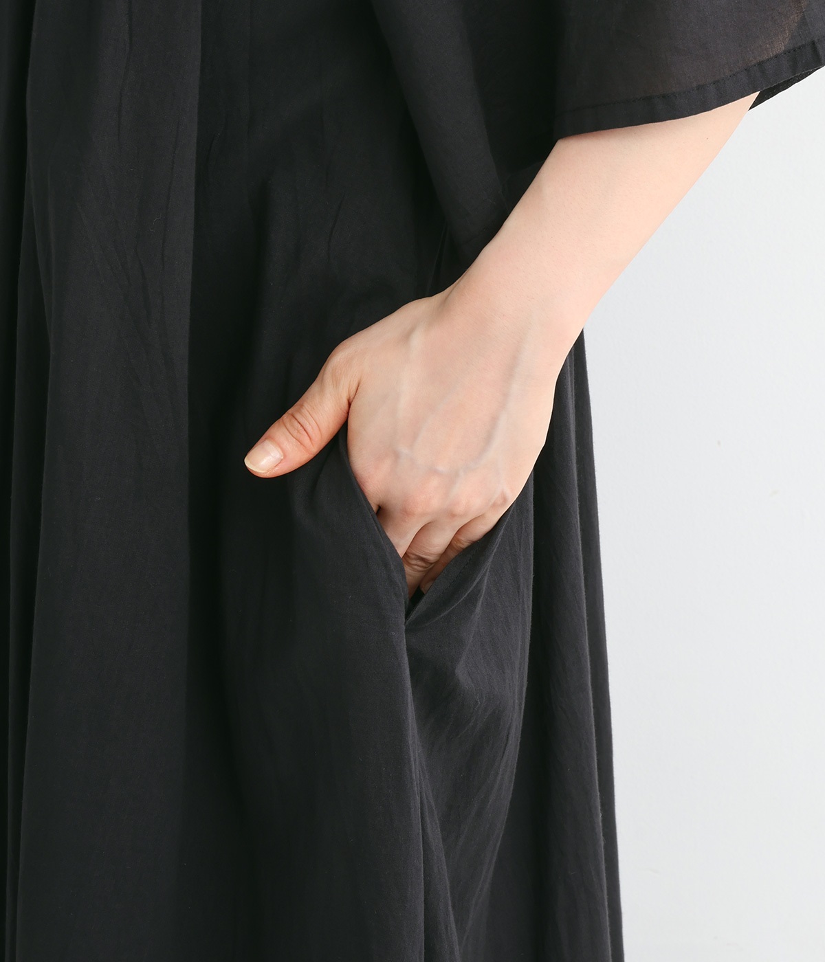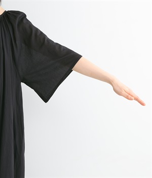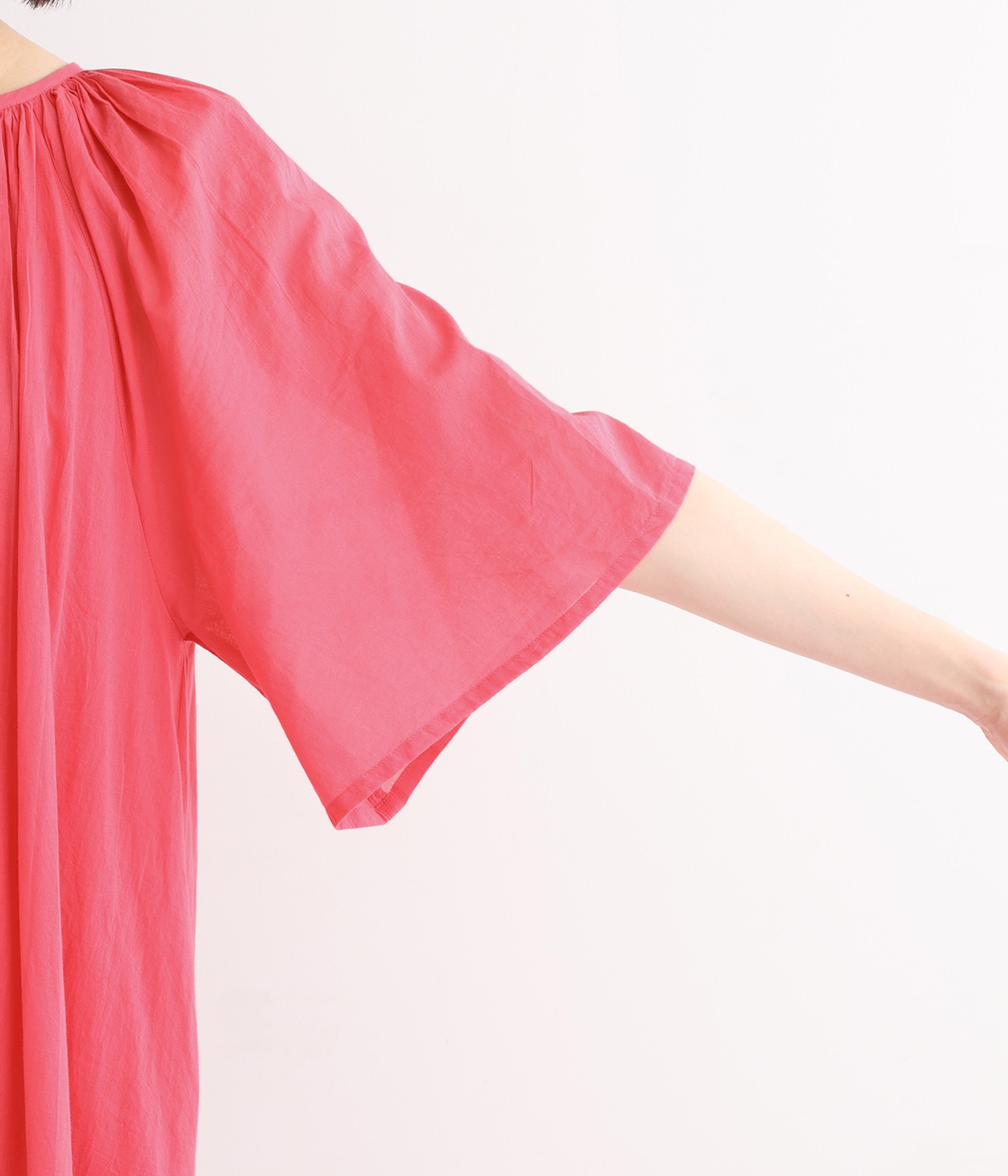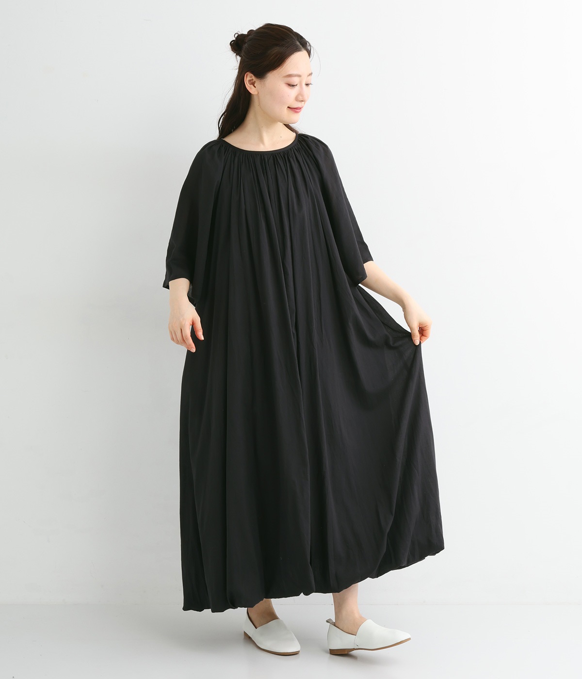 軽さのあるコットン素材をなめらかな手触りにした、上品な雰囲気を放つ生地に仕立てました。ボリューミーなシルエットでも適度な落ち感があるので、広がり過ぎないのが◎。