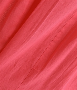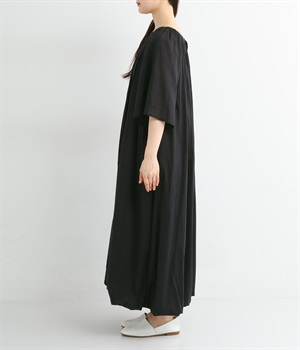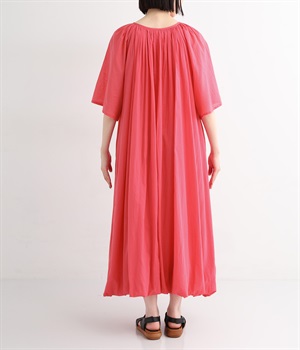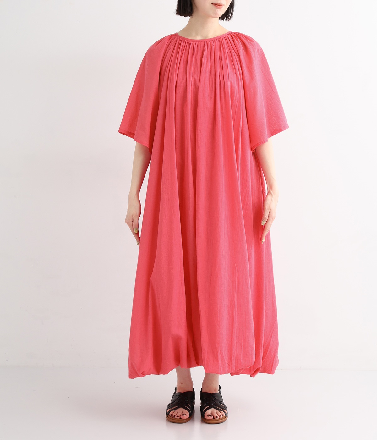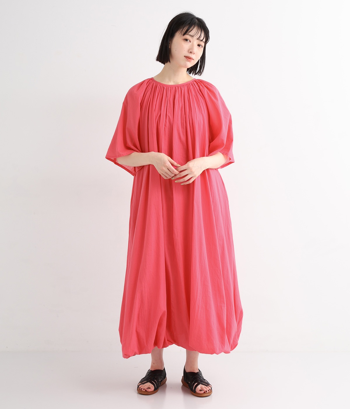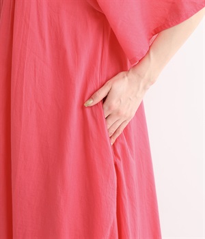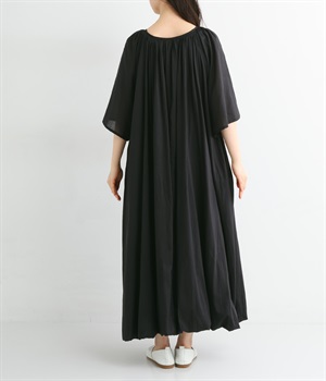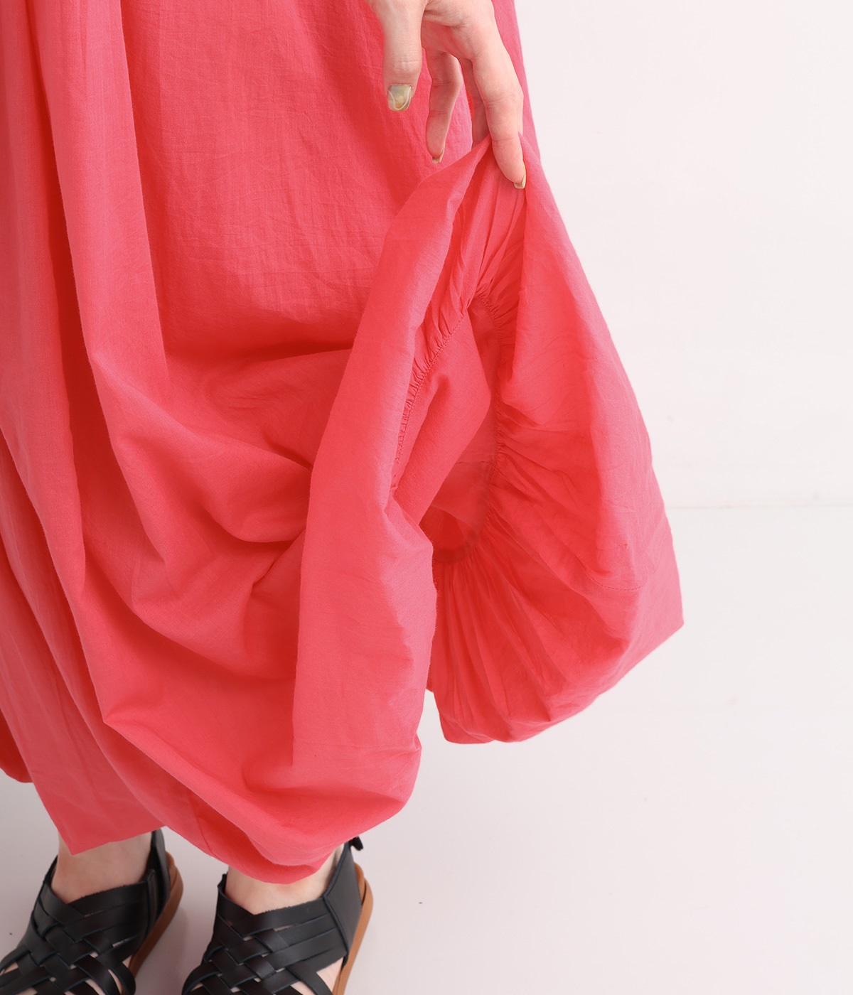 軽さのあるコットン素材をなめらかな手触りにした、上品な雰囲気を放つ生地に仕立てました。ボリューミーなシルエットでも適度な落ち感があるので、広がり過ぎないのが◎。