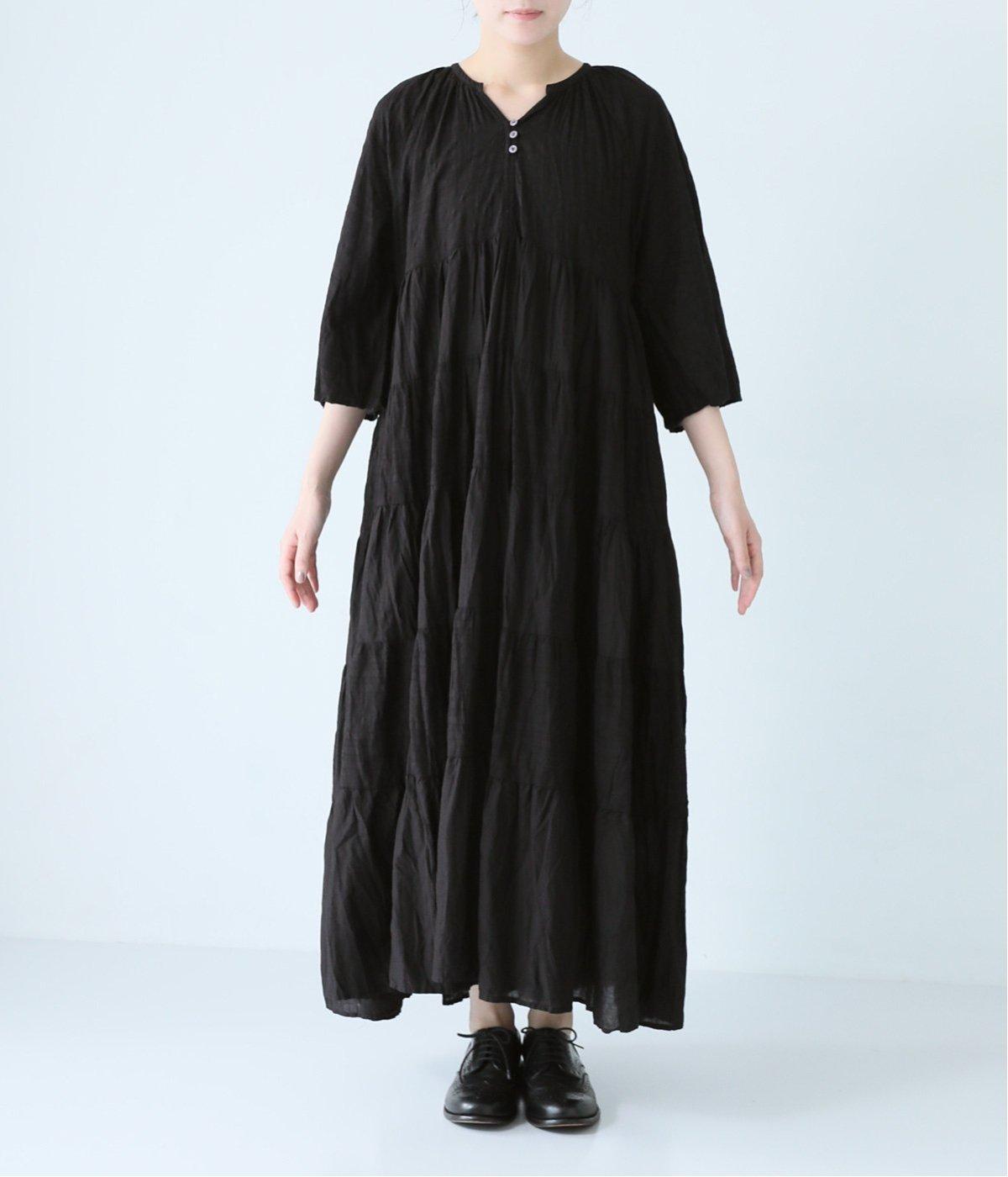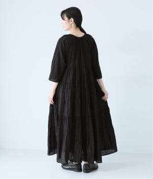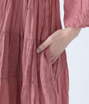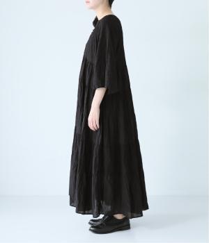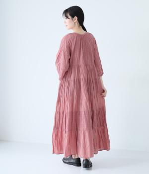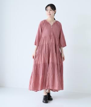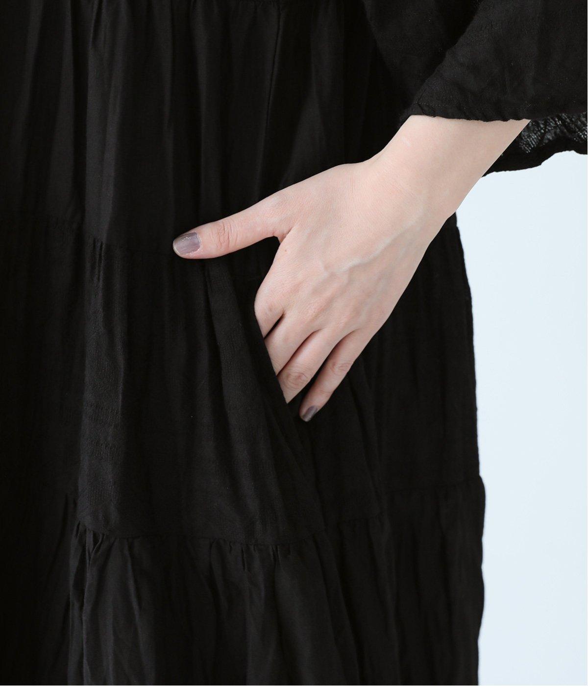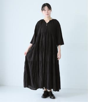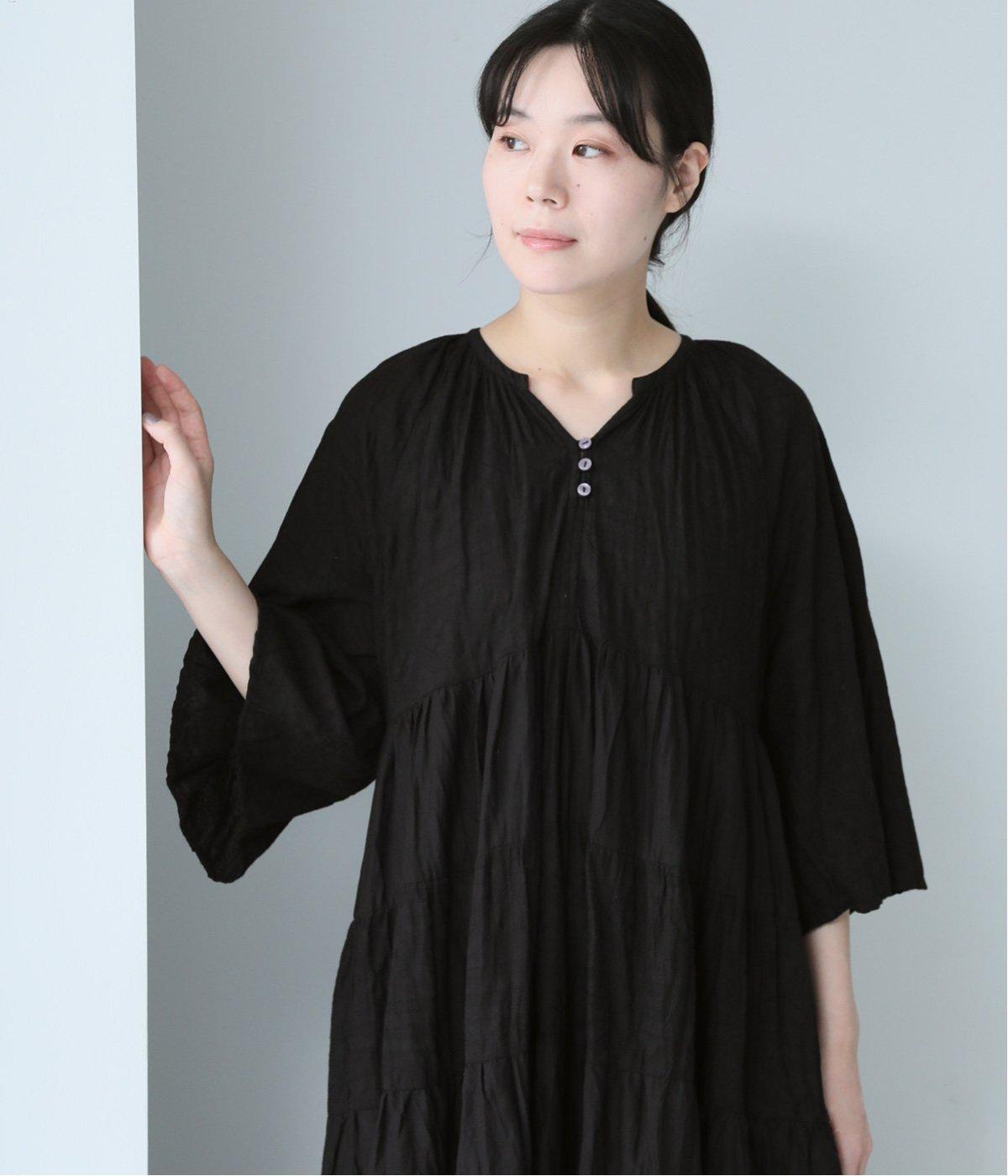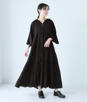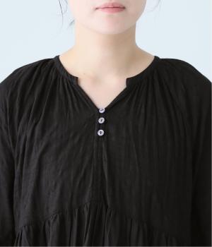 無地とさりげない刺しゅう生地を組み合わせたティアードデザイン。身幅にゆとりを持たせつつ、Aラインのシルエットがすっきり見えを叶えてくれます。抜け感のあるV字の襟元にはボタンをあしらってアクセントに。夏場は1枚で、肌寒い時期にはタートルネックなどと合わせてロングシーズンたのしめます。