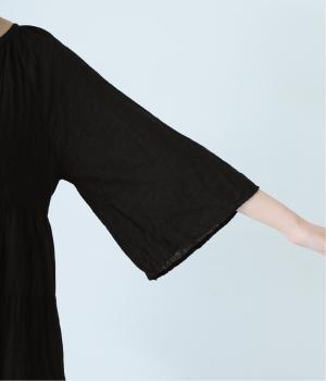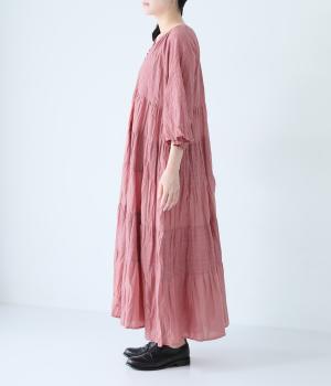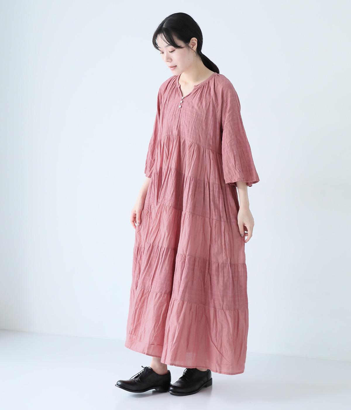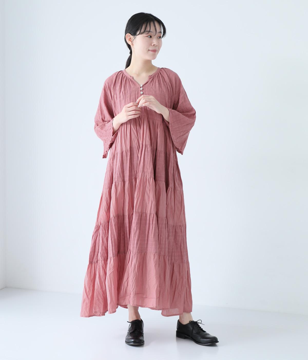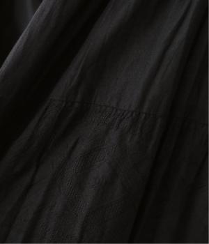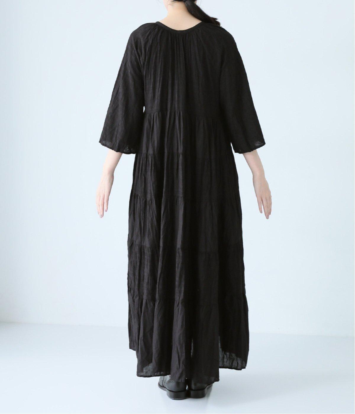 無地とさりげない刺しゅう生地を組み合わせたティアードデザイン。身幅にゆとりを持たせつつ、Aラインのシルエットがすっきり見えを叶えてくれます。抜け感のあるV字の襟元にはボタンをあしらってアクセントに。夏場は1枚で、肌寒い時期にはタートルネックなどと合わせてロングシーズンたのしめます。