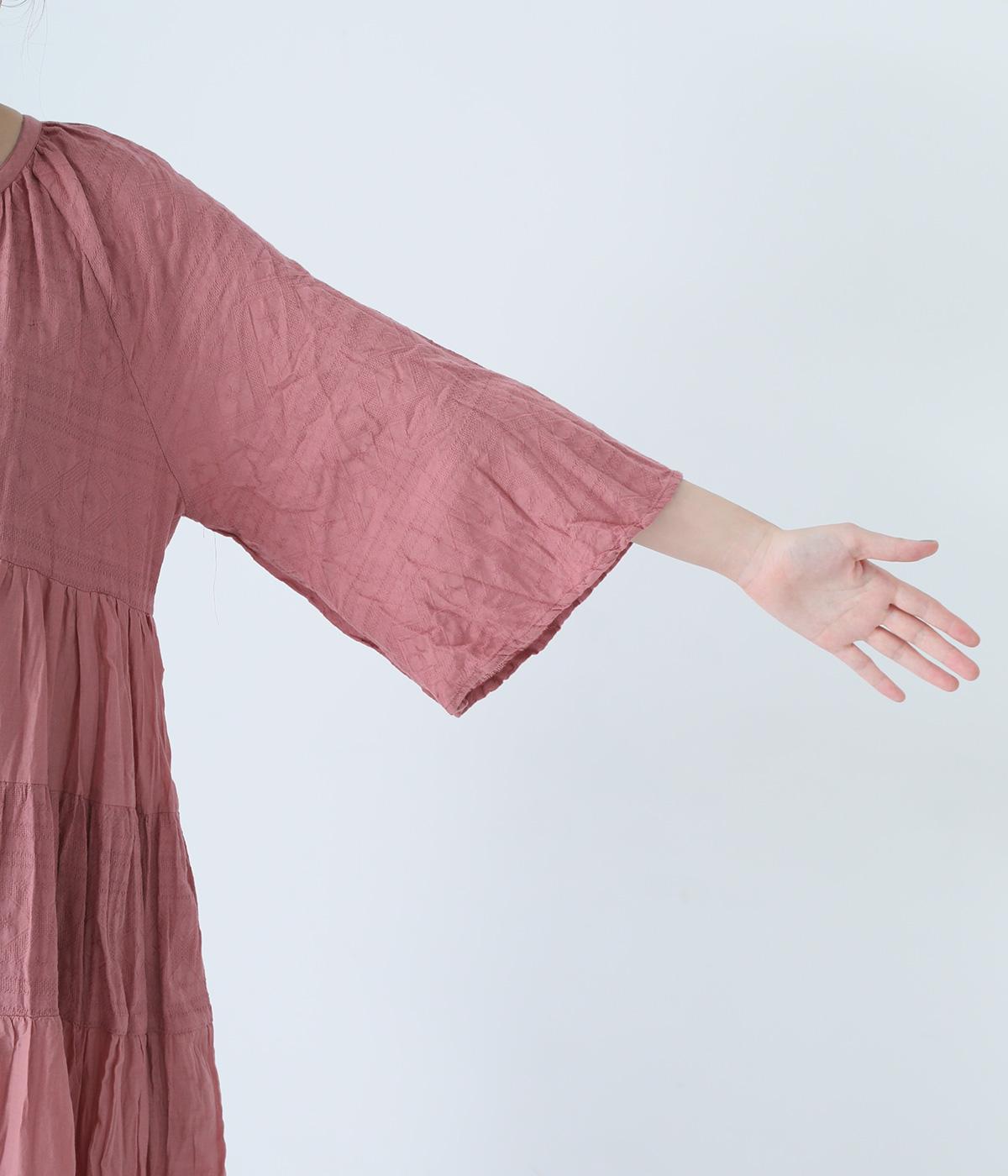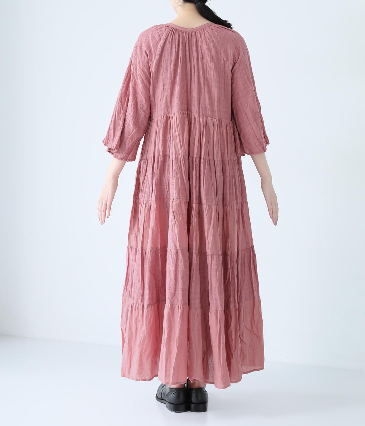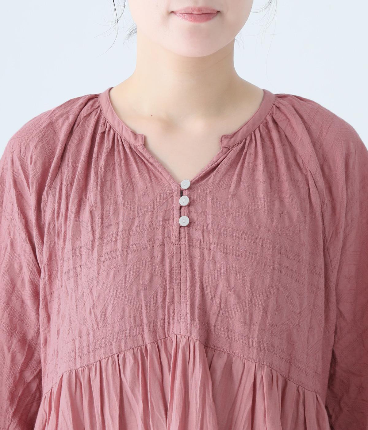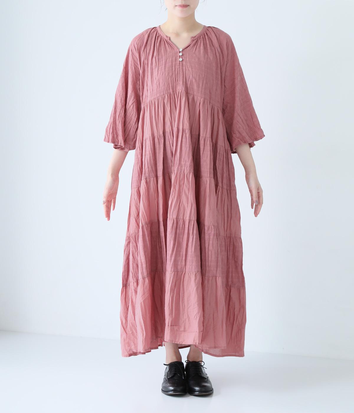 無地とさりげない刺しゅう生地を組み合わせたティアードデザイン。身幅にゆとりを持たせつつ、Aラインのシルエットがすっきり見えを叶えてくれます。抜け感のあるV字の襟元にはボタンをあしらってアクセントに。夏場は1枚で、肌寒い時期にはタートルネックなどと合わせてロングシーズンたのしめます。