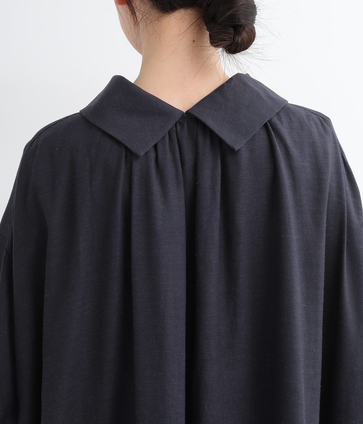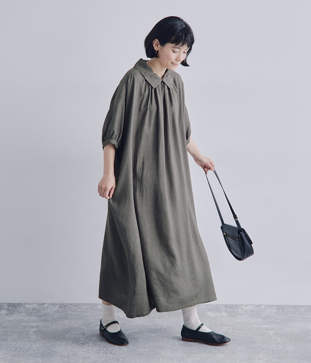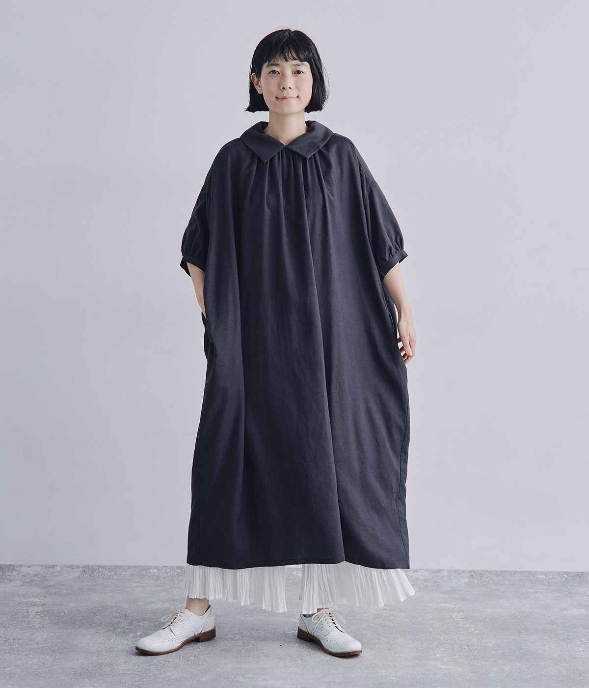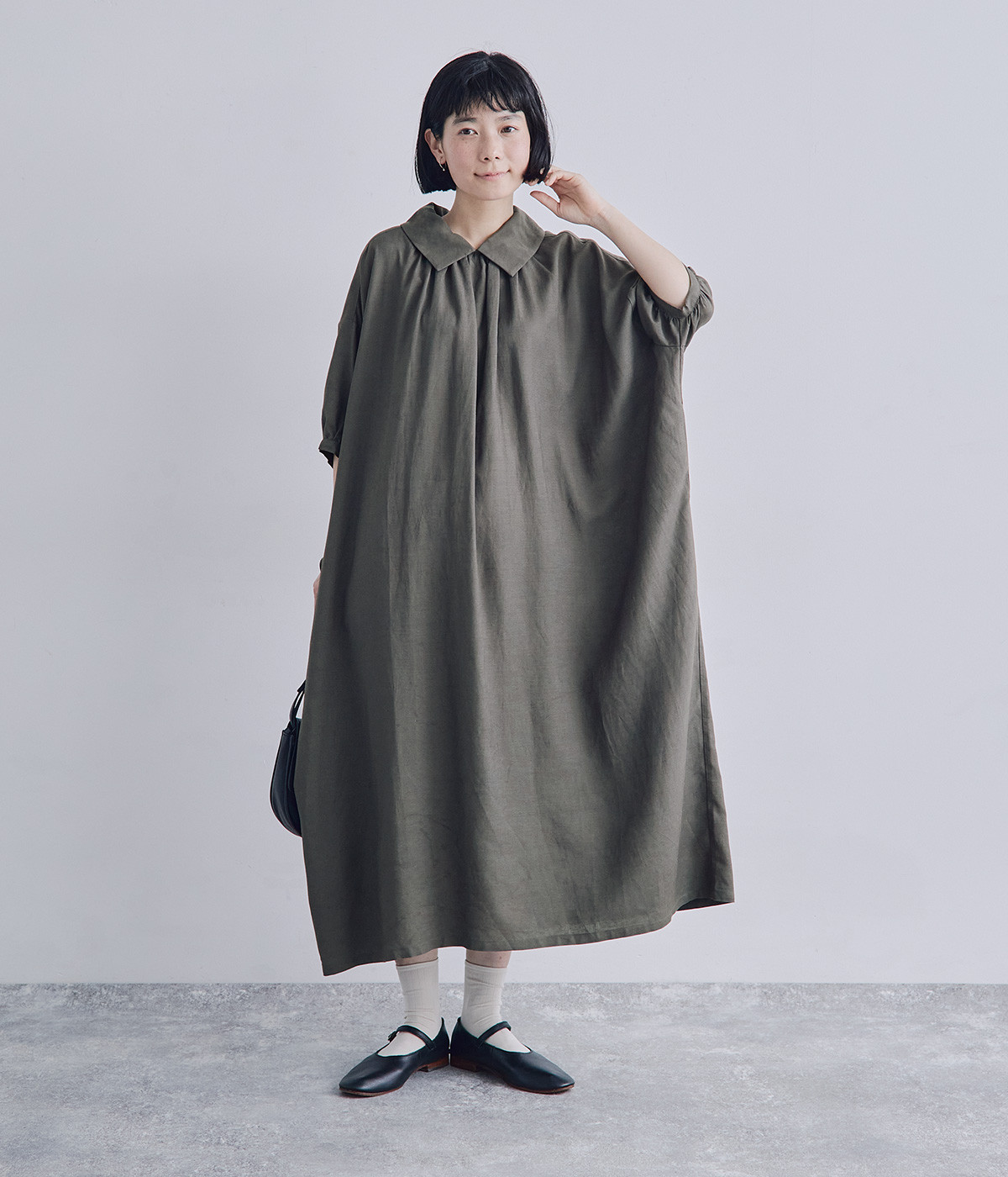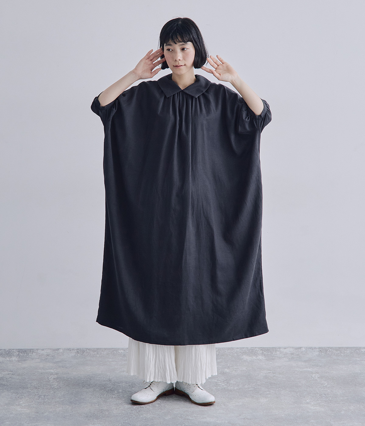着回し力の高い前後2way仕様。ゆったりとしたサイズ感で体型を拾いにくいシルエットに仕上げました。前後とも襟つきデザインですが、襟の形でニュアンスの違いを表現しています。襟や袖口にギャザーをあしらうことでシンプルになりすぎず、ふんわりとした優しい雰囲気をまとう一着に。