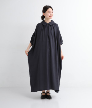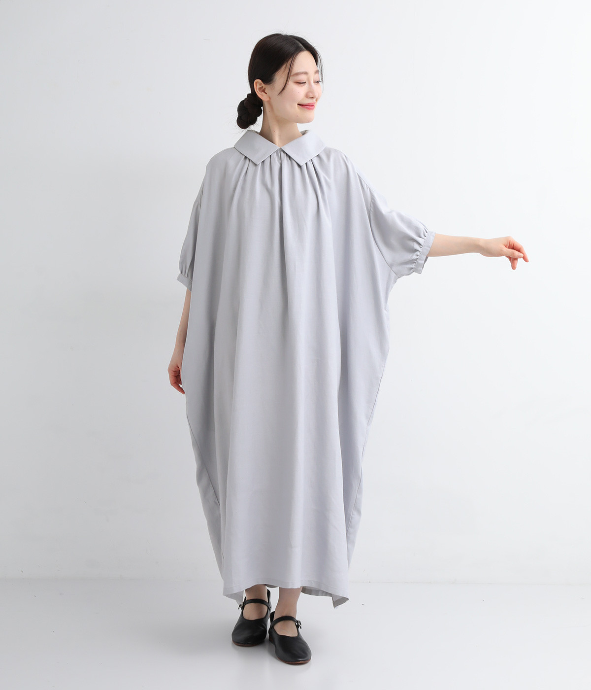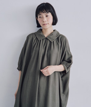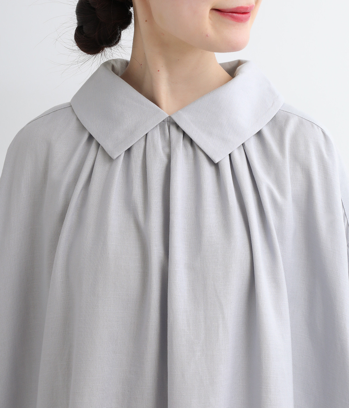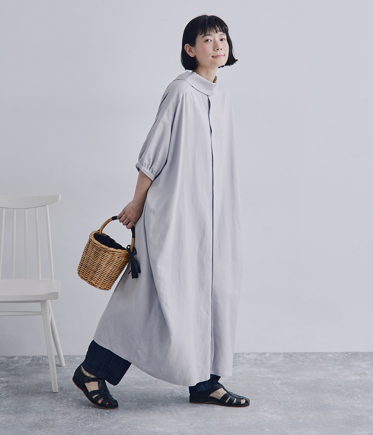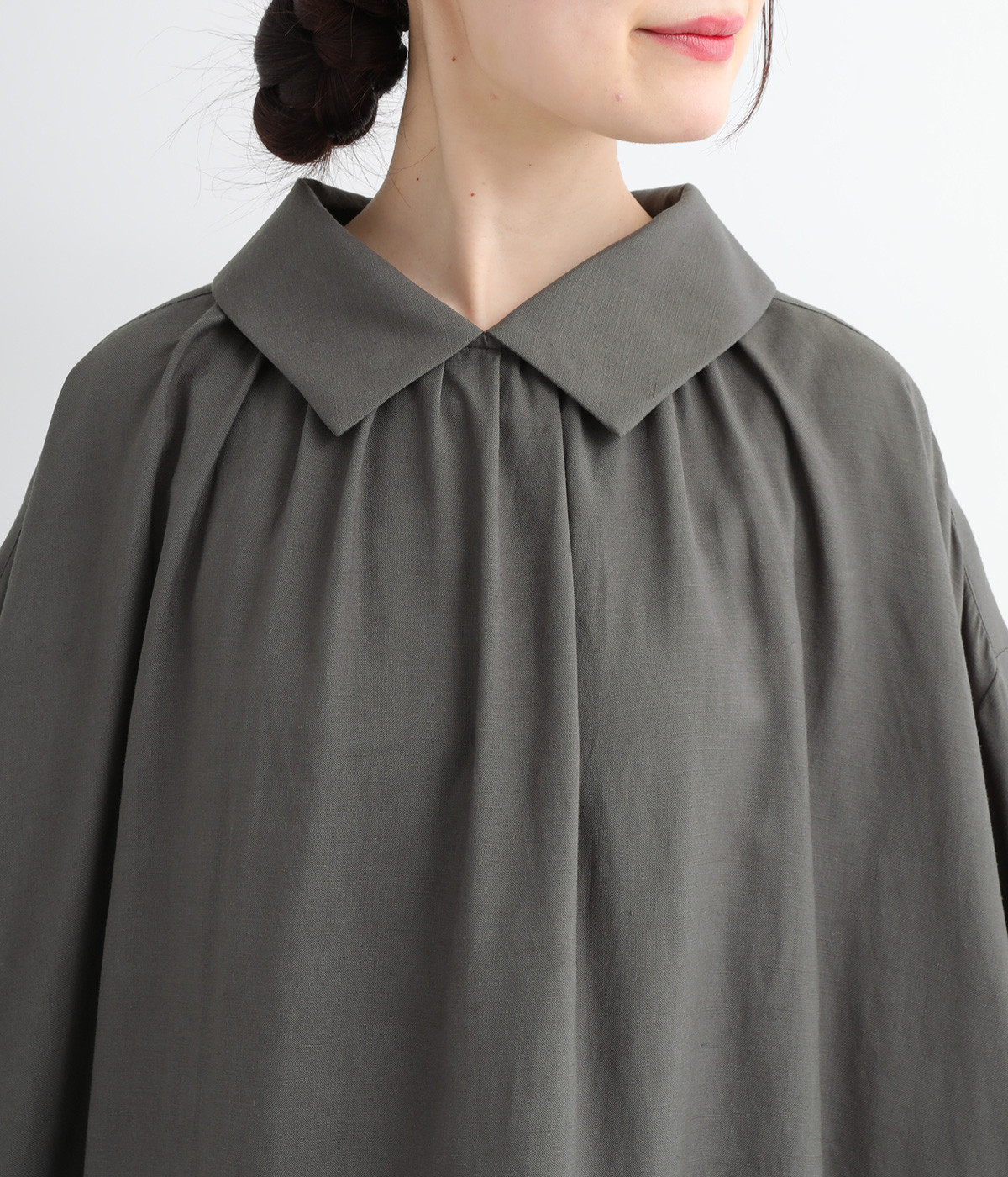 着回し力の高い前後2way仕様。ゆったりとしたサイズ感で体型を拾いにくいシルエットに仕上げました。前後とも襟つきデザインですが、襟の形でニュアンスの違いを表現しています。襟や袖口にギャザーをあしらうことでシンプルになりすぎず、ふんわりとした優しい雰囲気をまとう一着に。