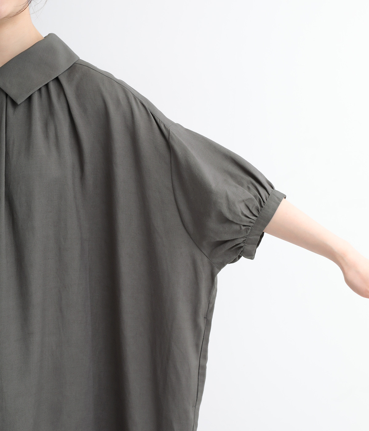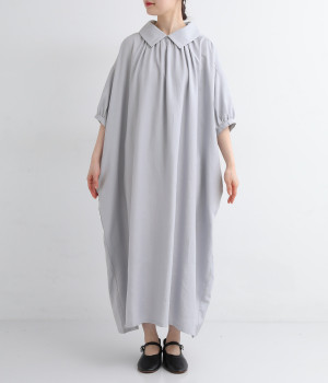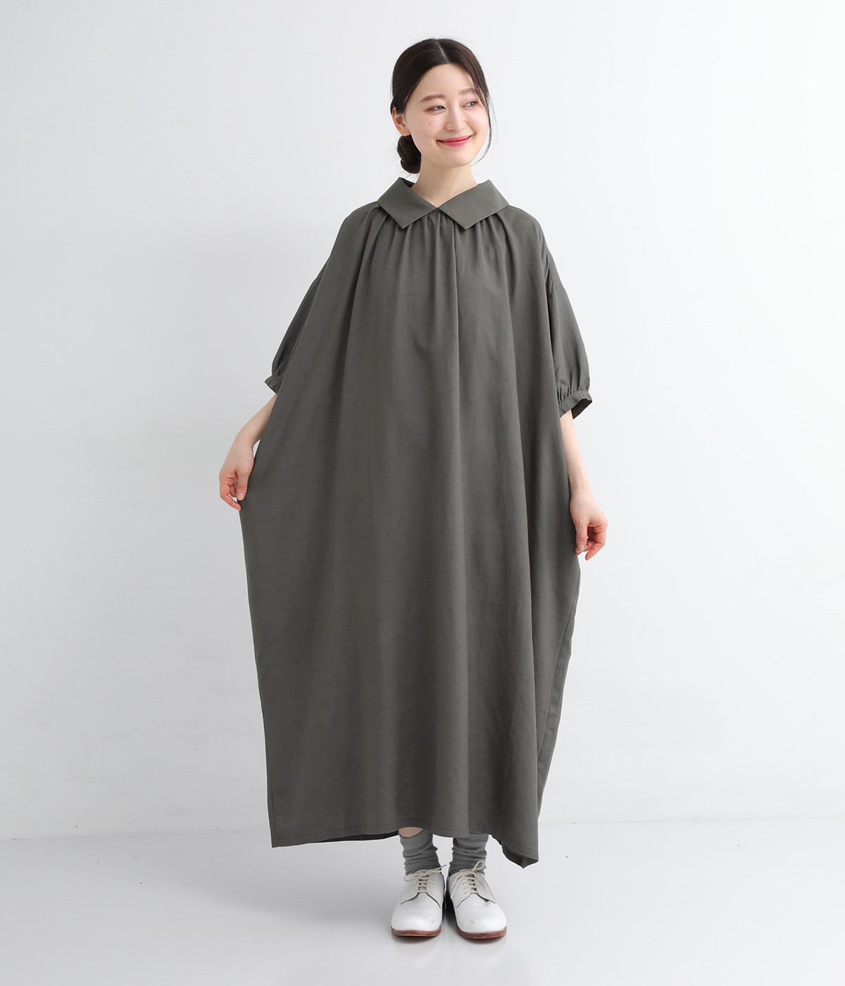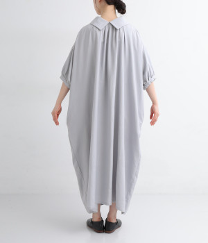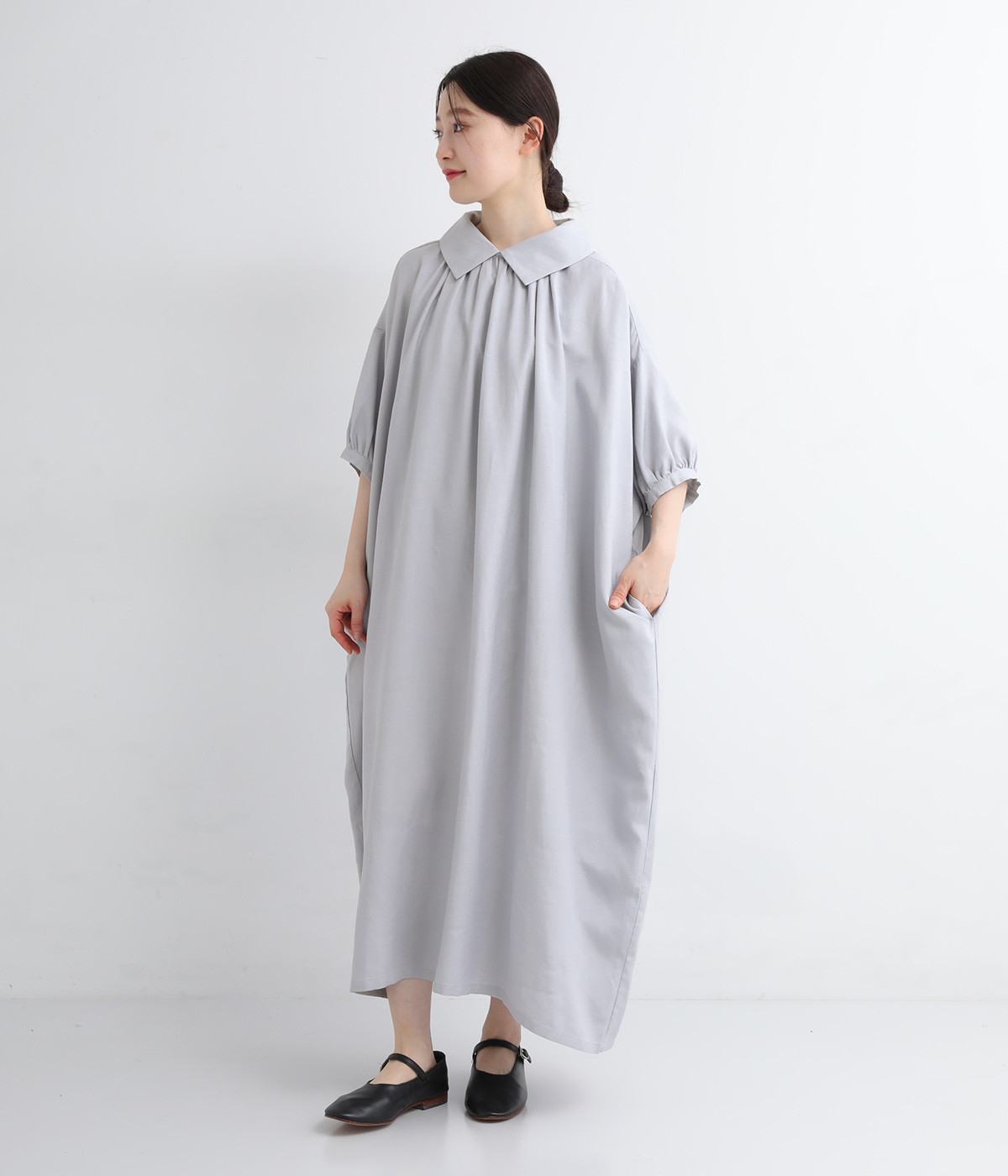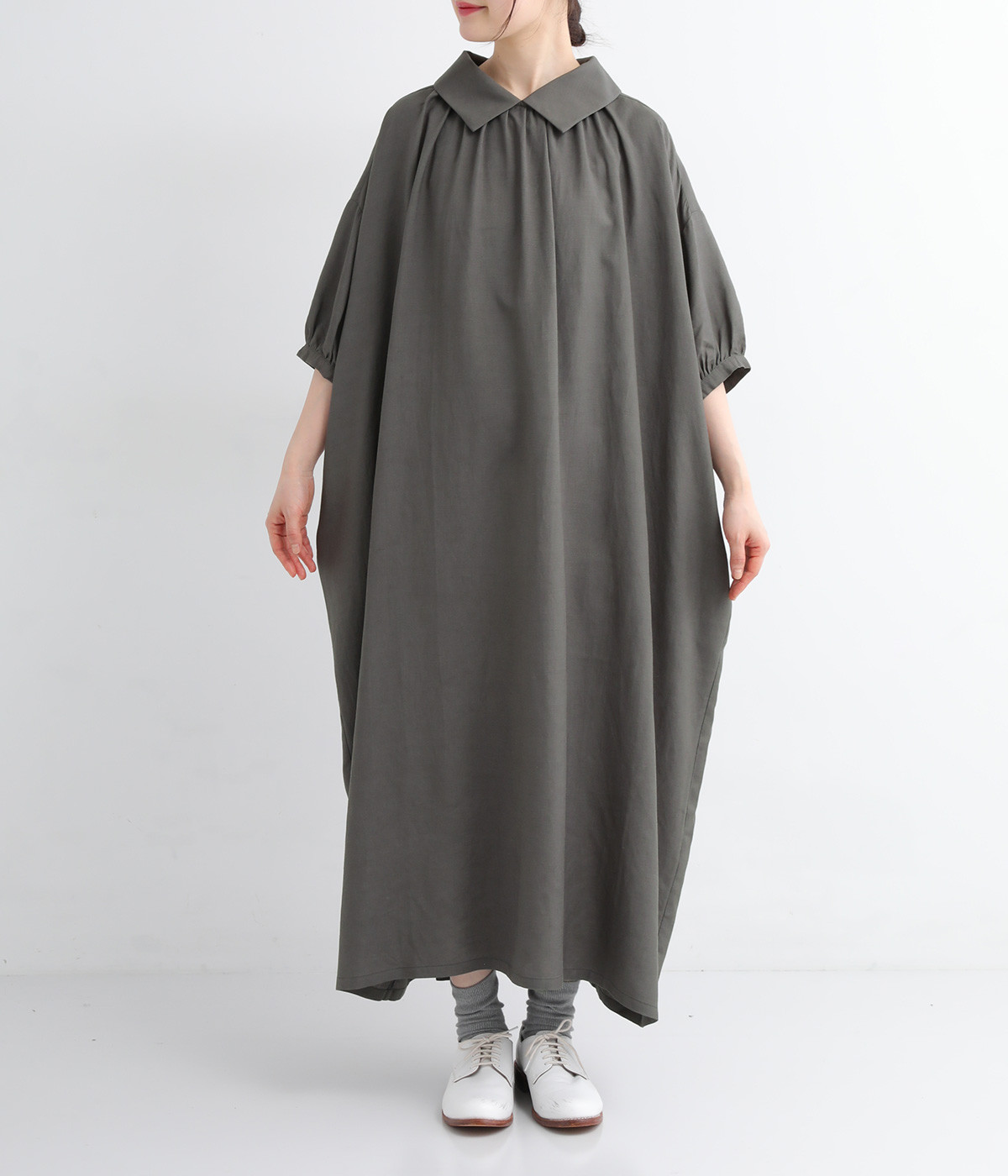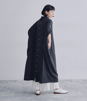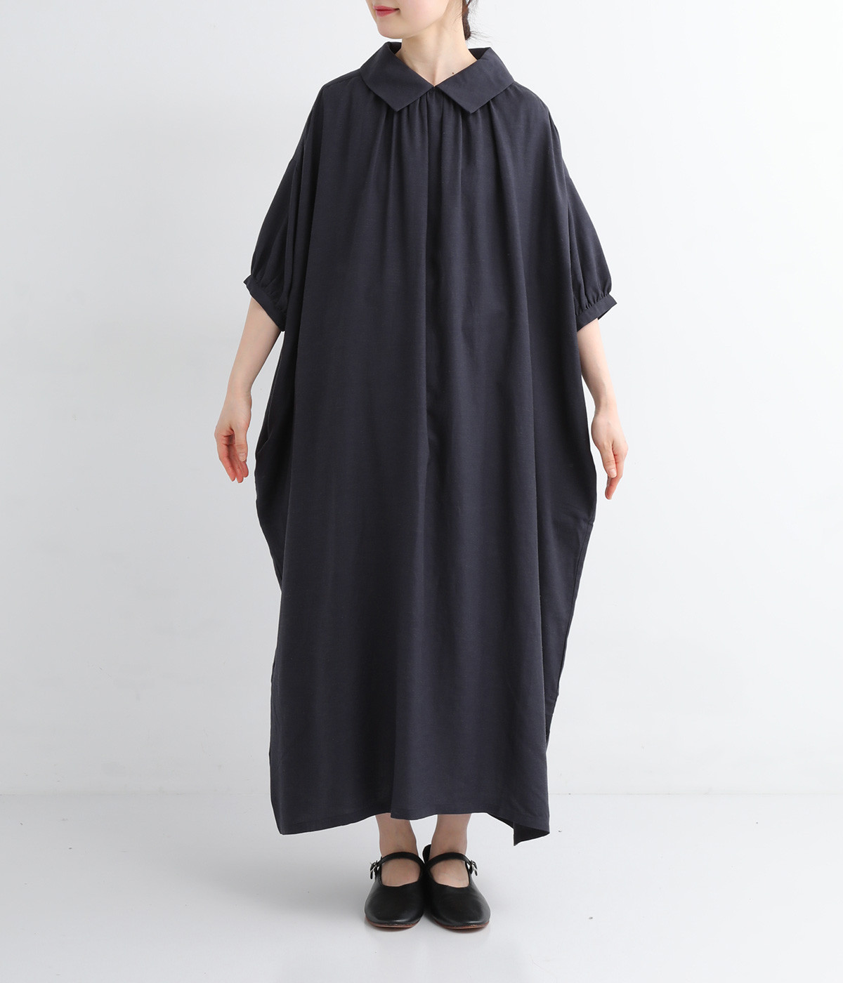 着回し力の高い前後2way仕様。ゆったりとしたサイズ感で体型を拾いにくいシルエットに仕上げました。前後とも襟つきデザインですが、襟の形でニュアンスの違いを表現しています。襟や袖口にギャザーをあしらうことでシンプルになりすぎず、ふんわりとした優しい雰囲気をまとう一着に。