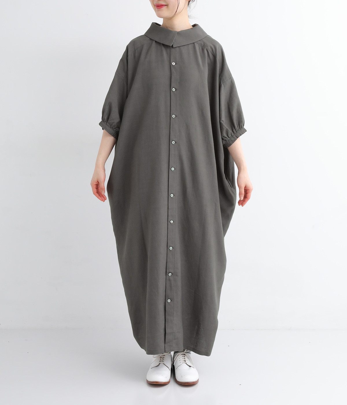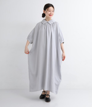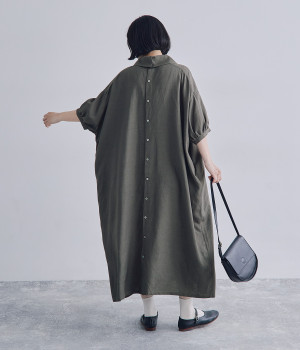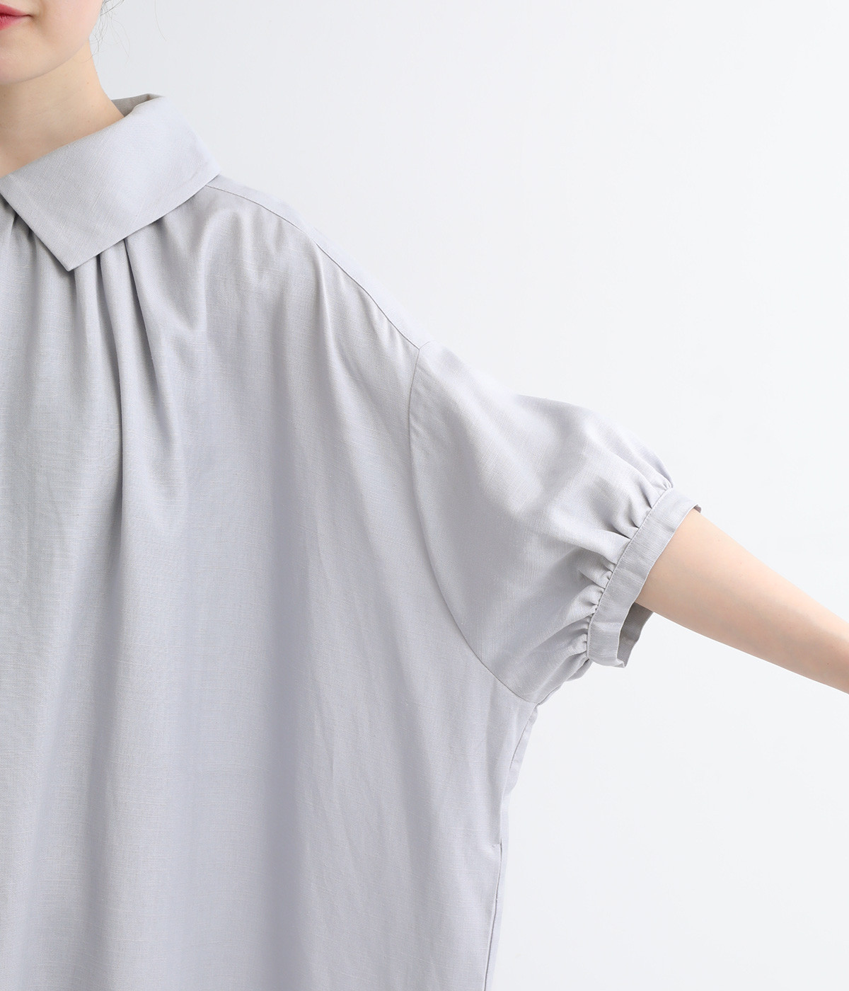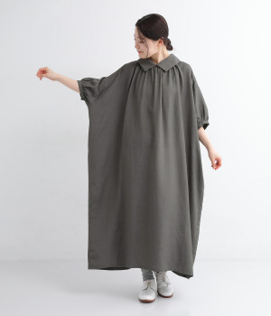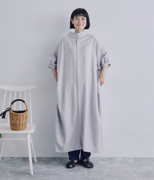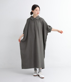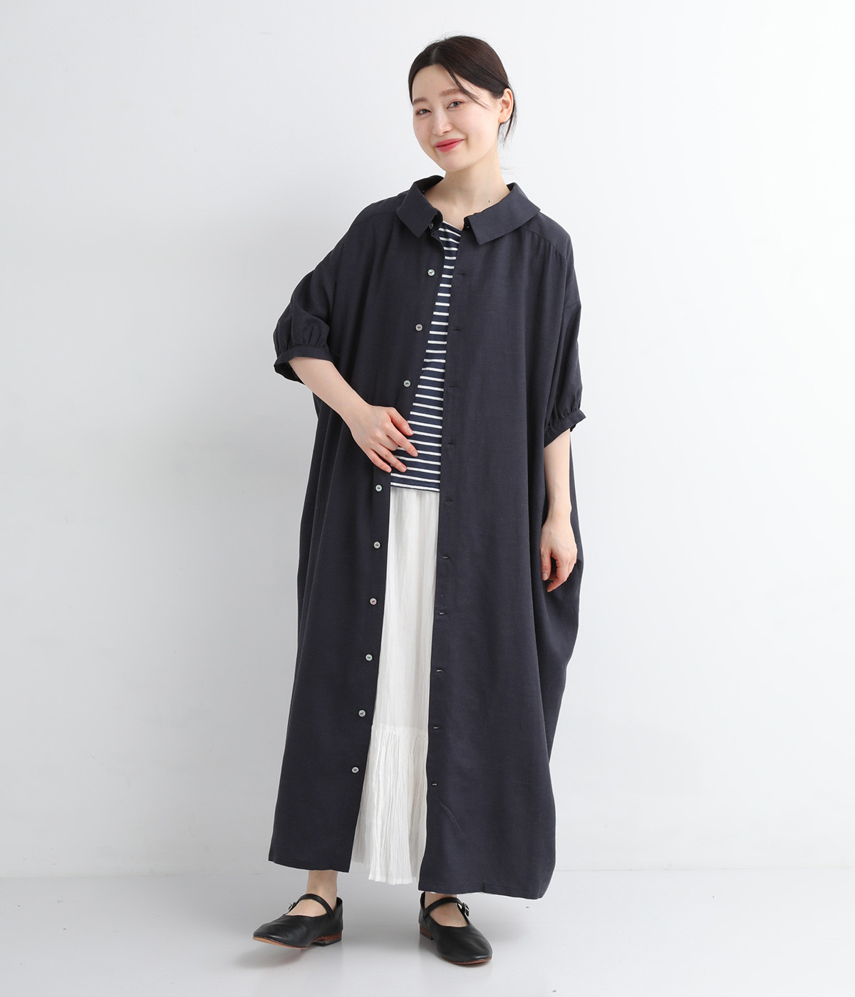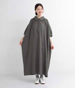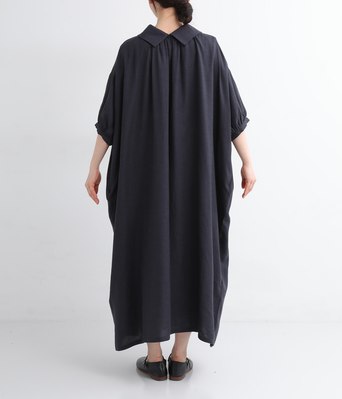 着回し力の高い前後2way仕様。ゆったりとしたサイズ感で体型を拾いにくいシルエットに仕上げました。前後とも襟つきデザインですが、襟の形でニュアンスの違いを表現しています。襟や袖口にギャザーをあしらうことでシンプルになりすぎず、ふんわりとした優しい雰囲気をまとう一着に。