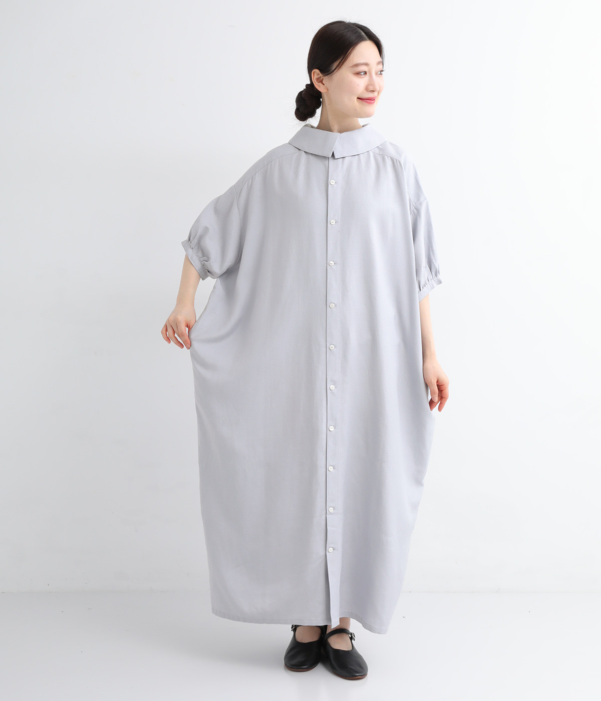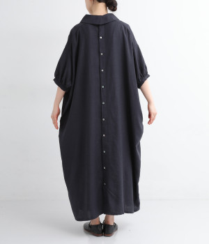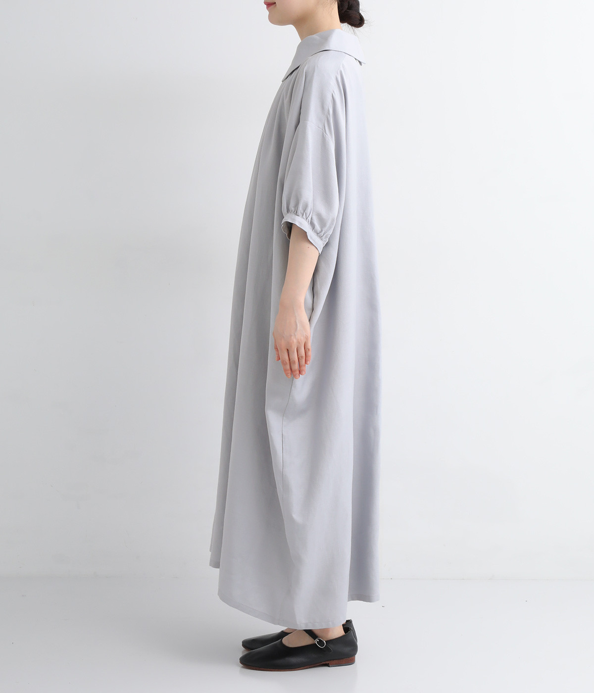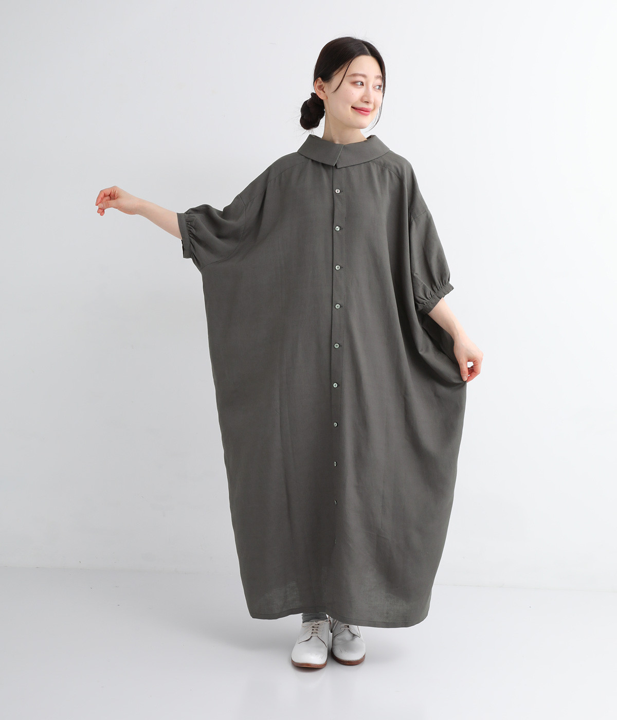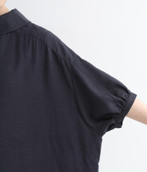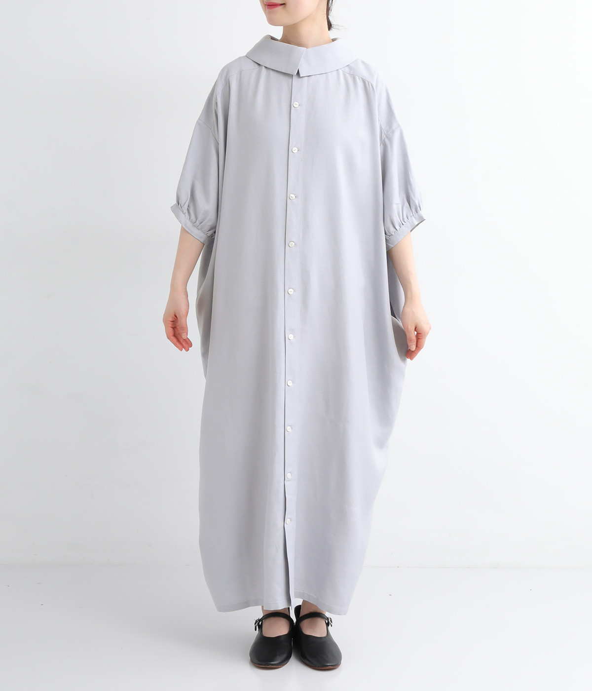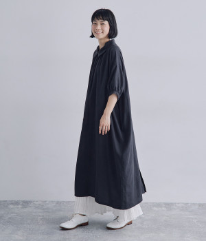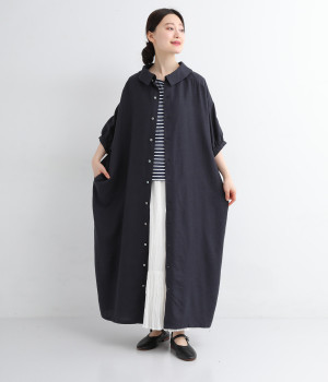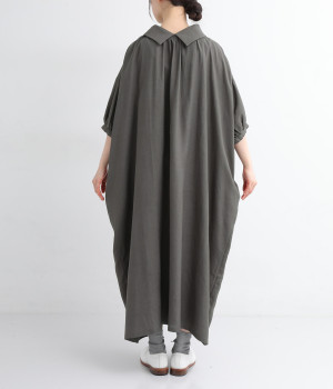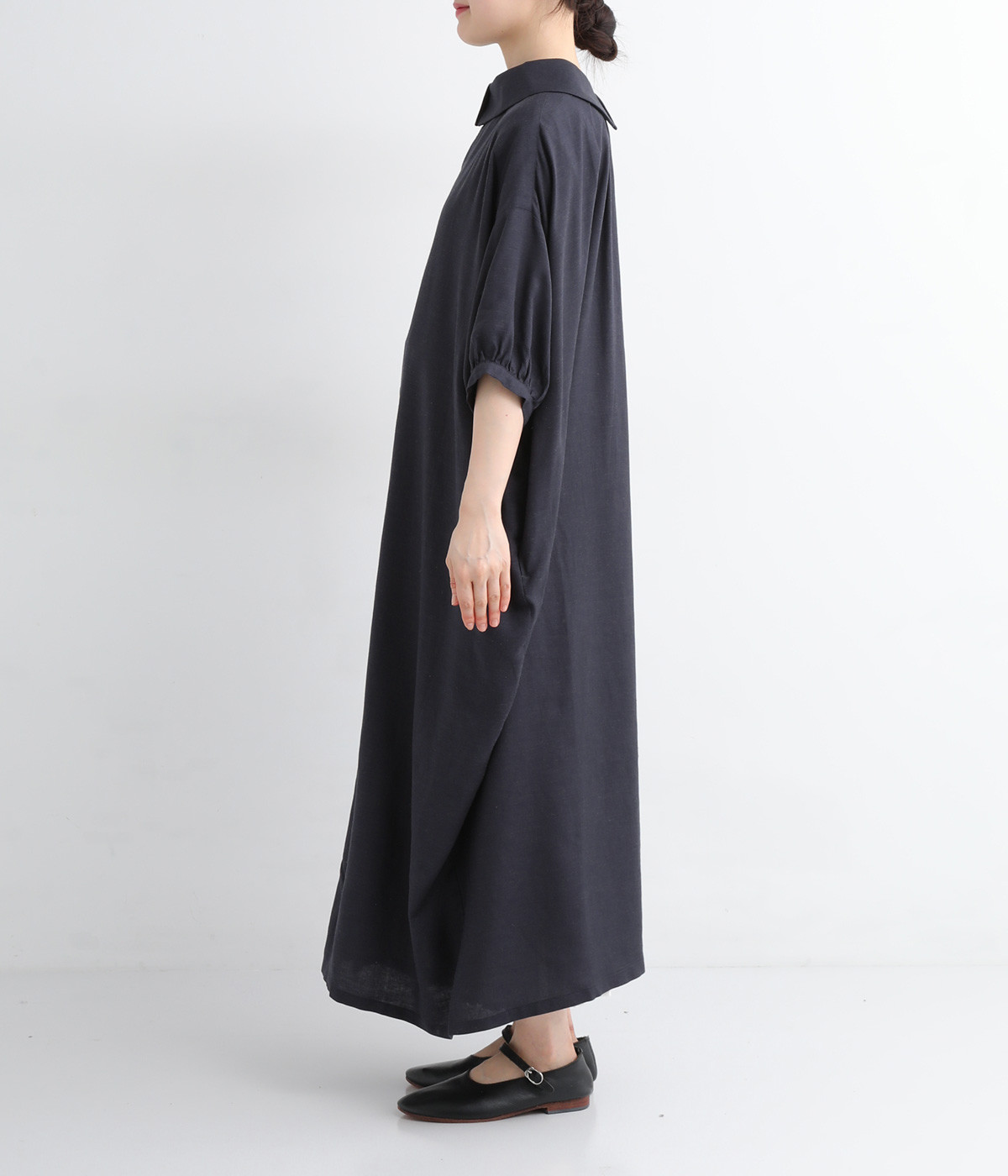 着回し力の高い前後2way仕様。ゆったりとしたサイズ感で体型を拾いにくいシルエットに仕上げました。前後とも襟つきデザインですが、襟の形でニュアンスの違いを表現しています。襟や袖口にギャザーをあしらうことでシンプルになりすぎず、ふんわりとした優しい雰囲気をまとう一着に。