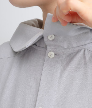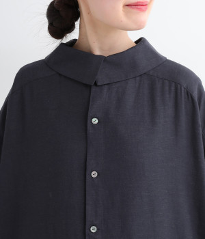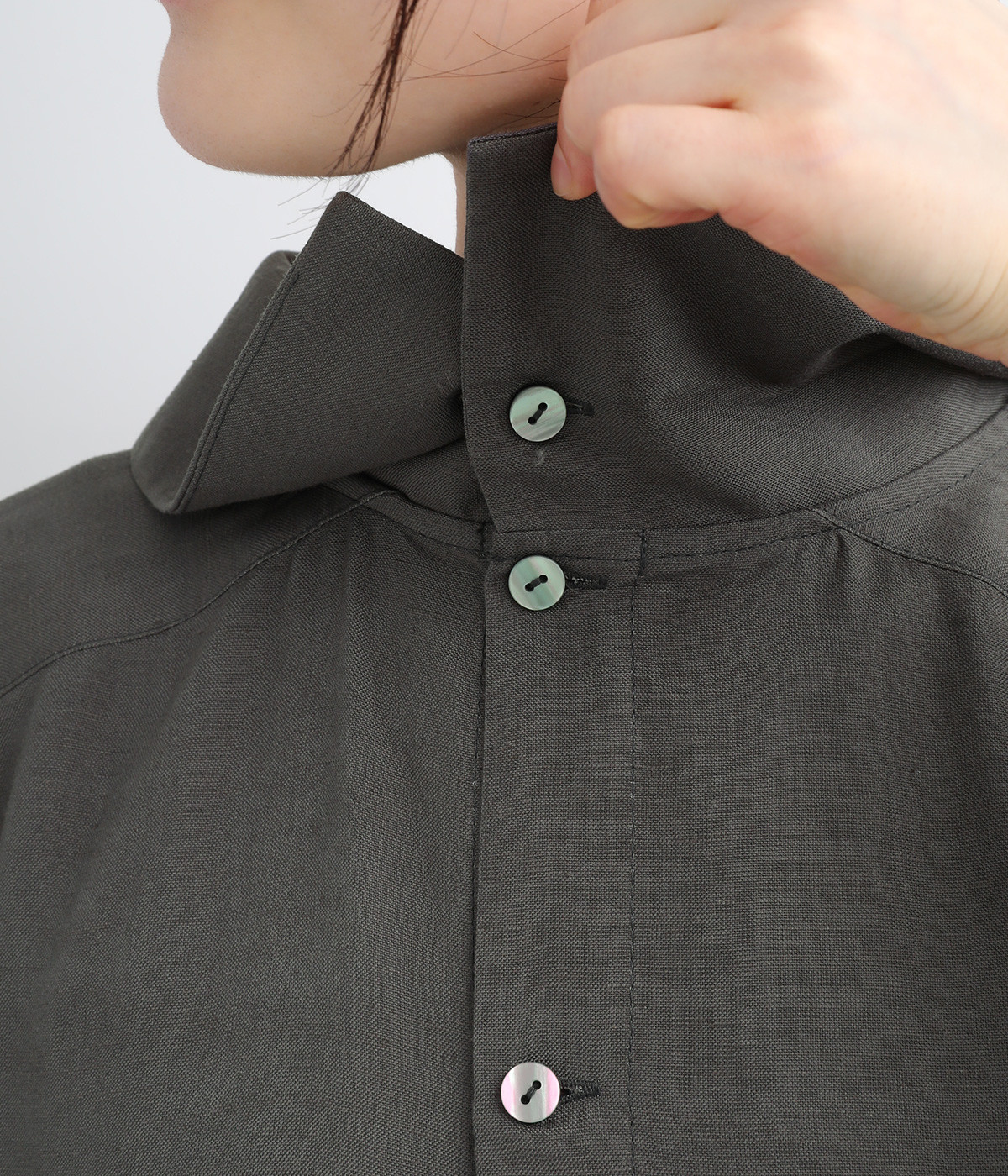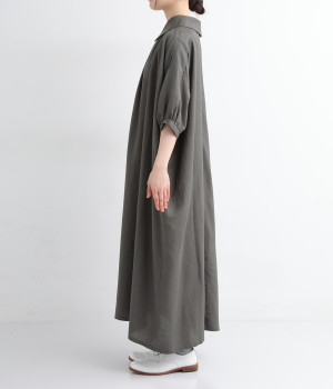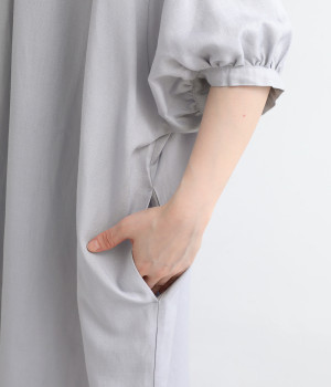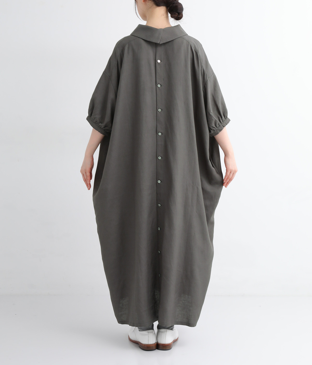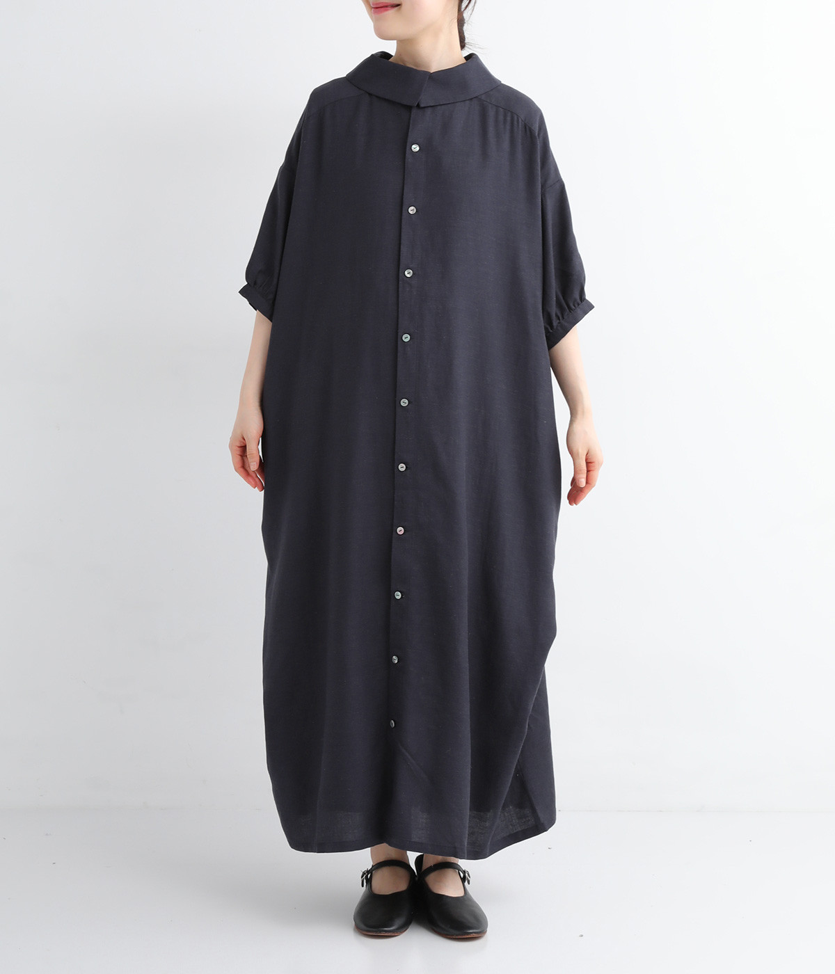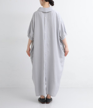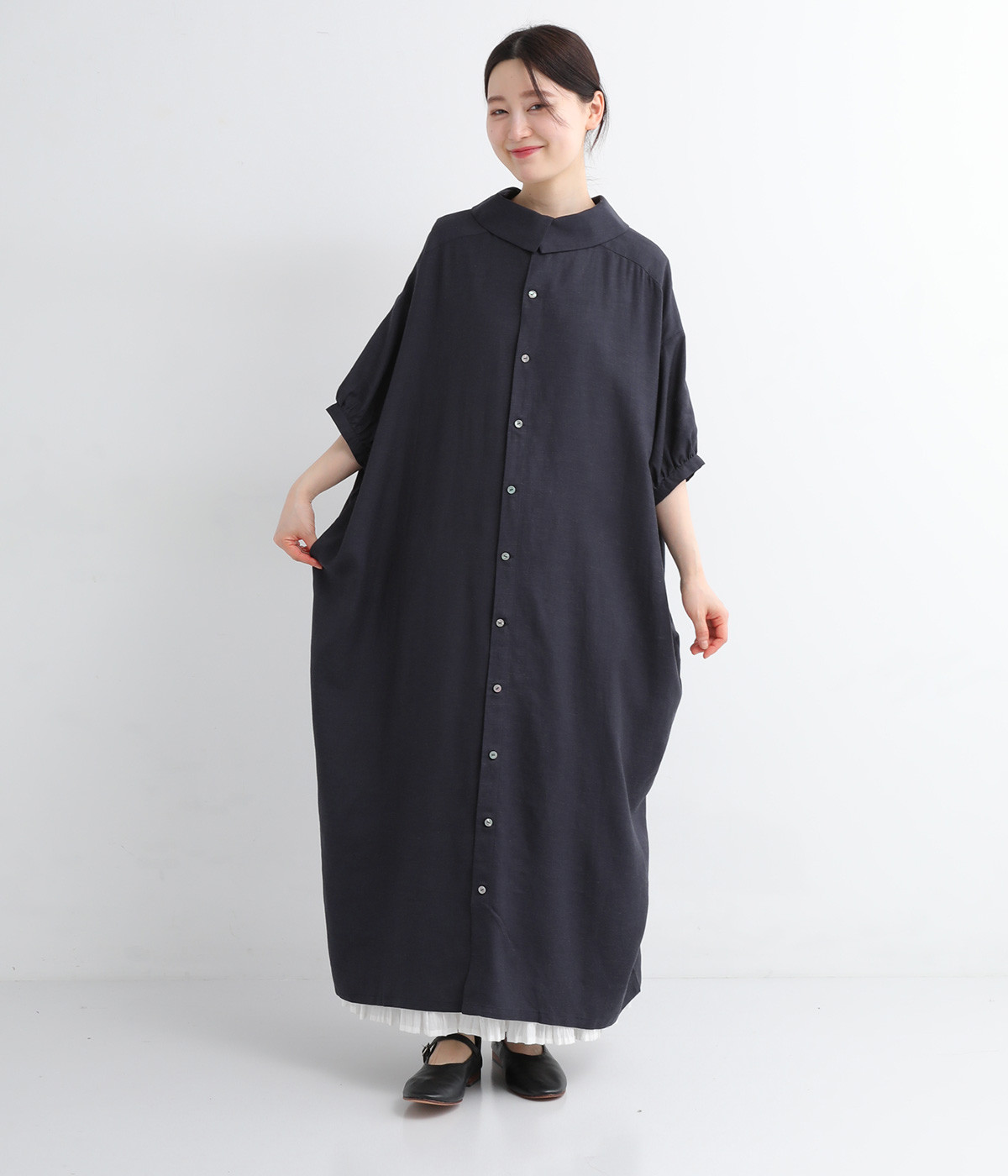 着回し力の高い前後2way仕様。ゆったりとしたサイズ感で体型を拾いにくいシルエットに仕上げました。前後とも襟つきデザインですが、襟の形でニュアンスの違いを表現しています。襟や袖口にギャザーをあしらうことでシンプルになりすぎず、ふんわりとした優しい雰囲気をまとう一着に。