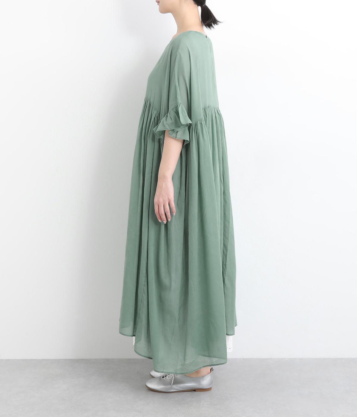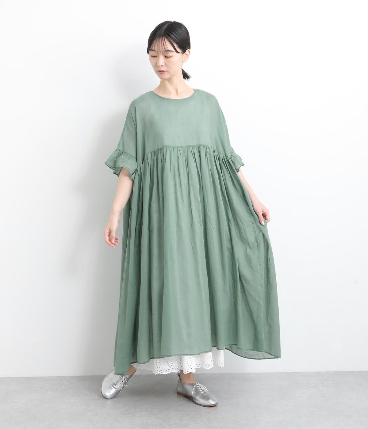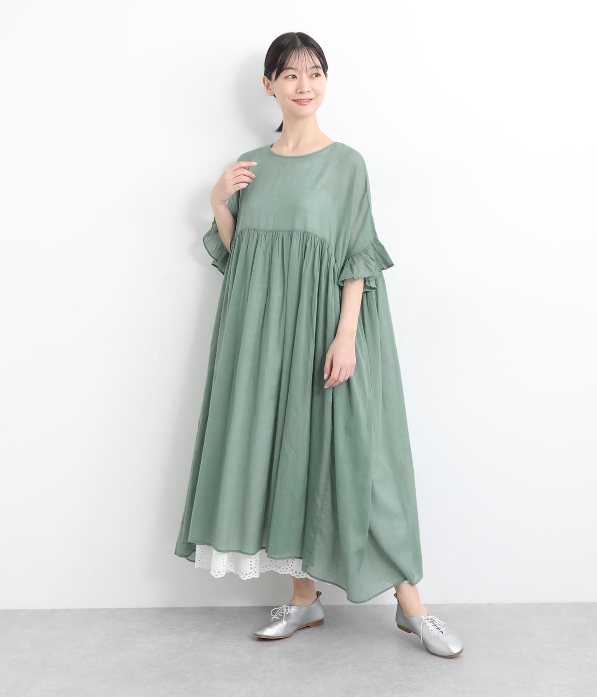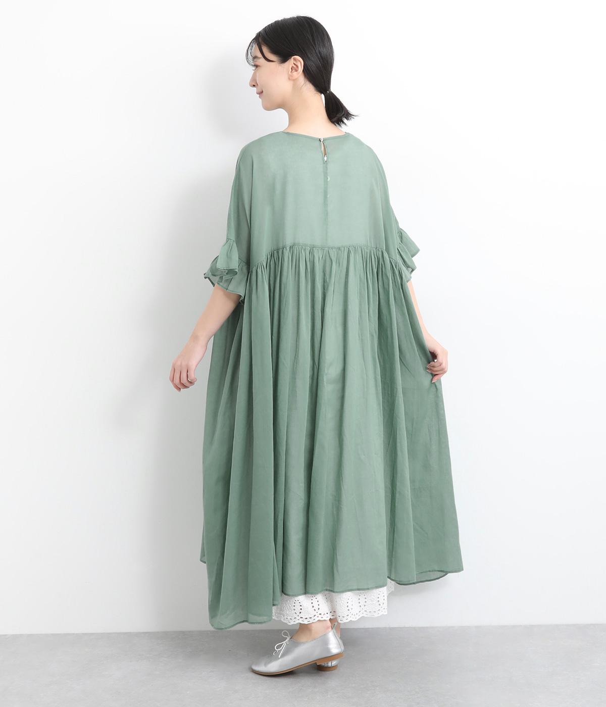 袖口のフリルや、ウエストにたっぷりとあしらったギャザーが大人かわいい装いを演出するワンピースです。着丈、身幅ともにゆとりを持たせたサイジングで様々な重ね着スタイルを楽しむのがおすすめ。
