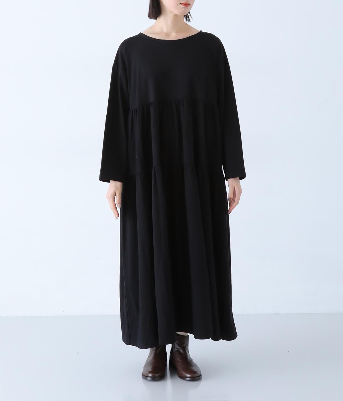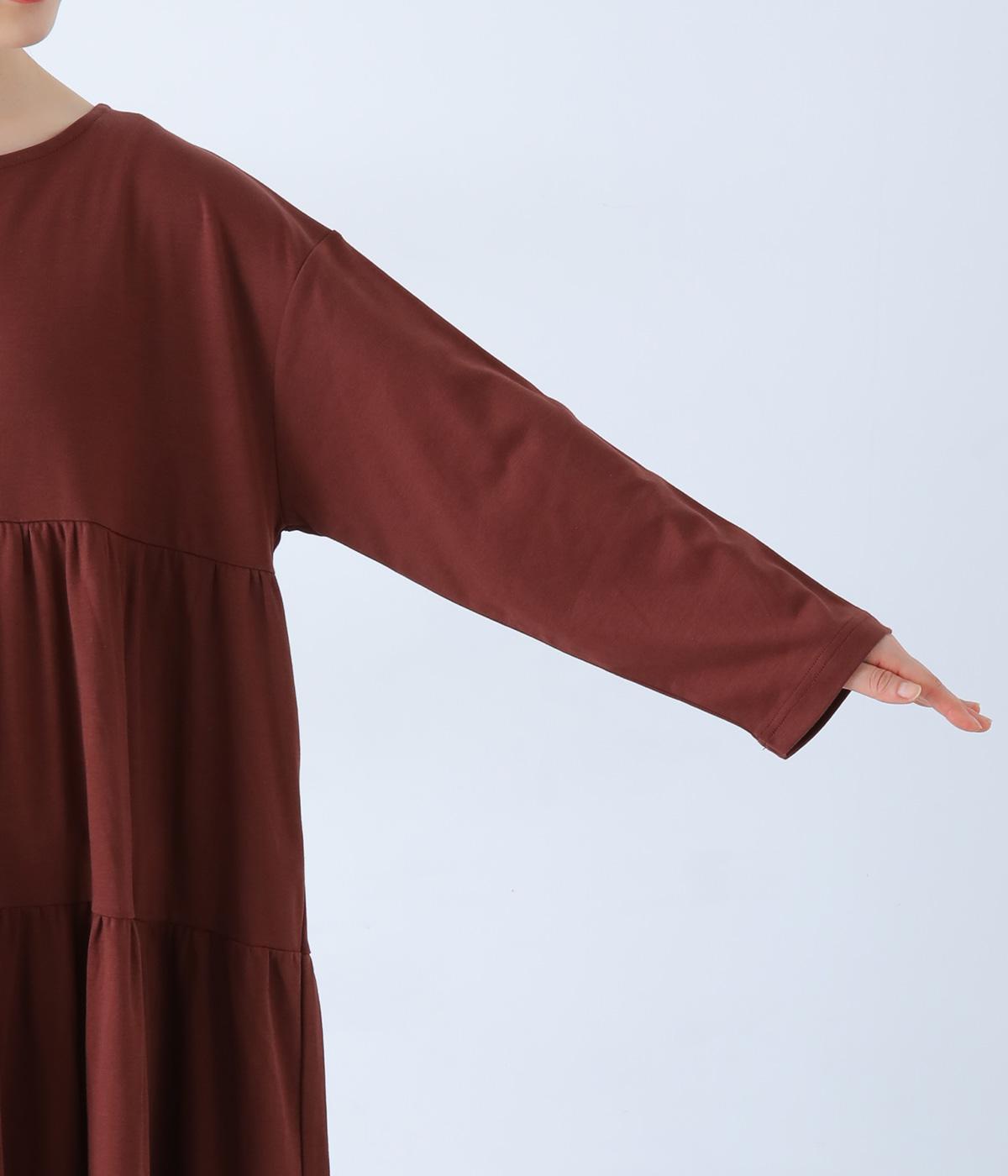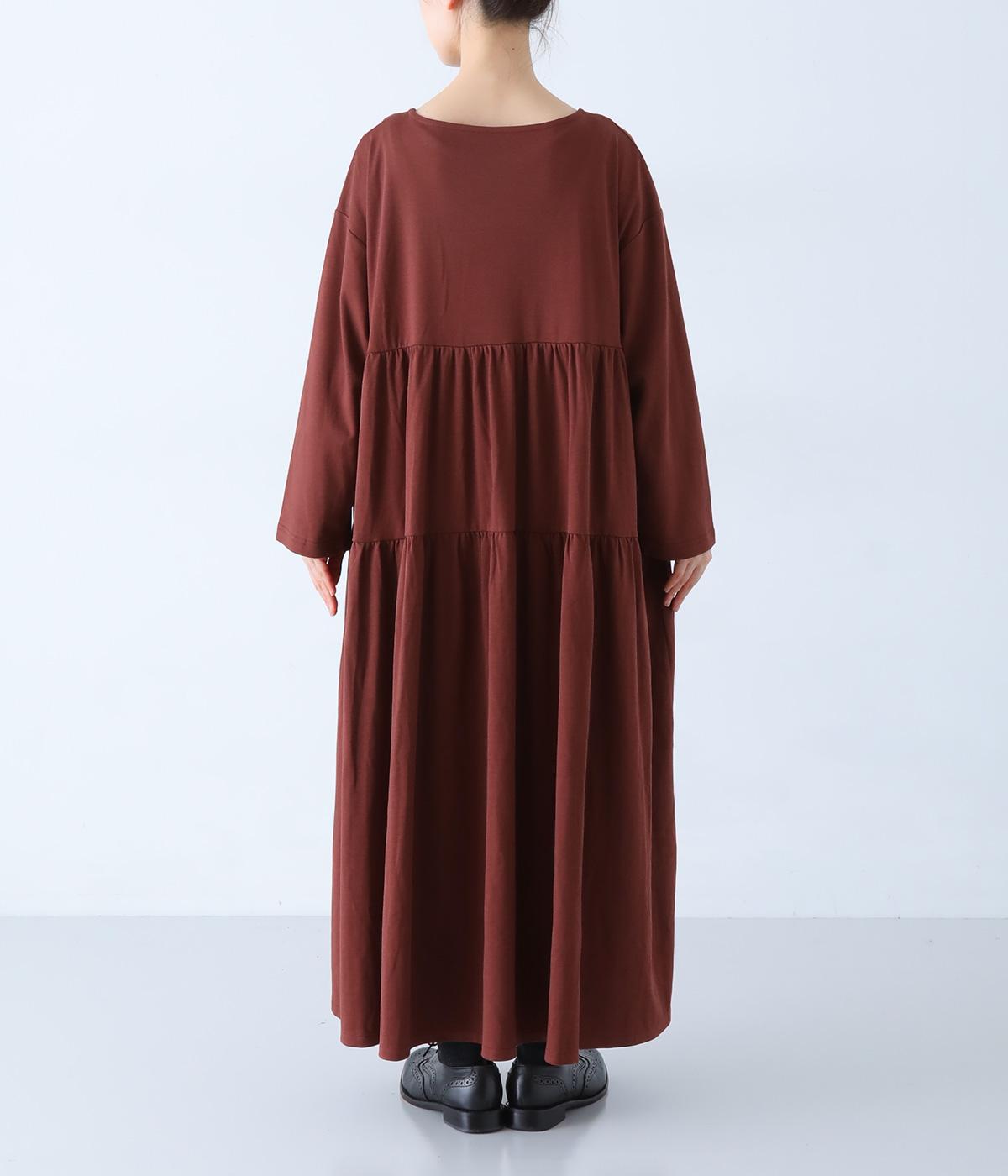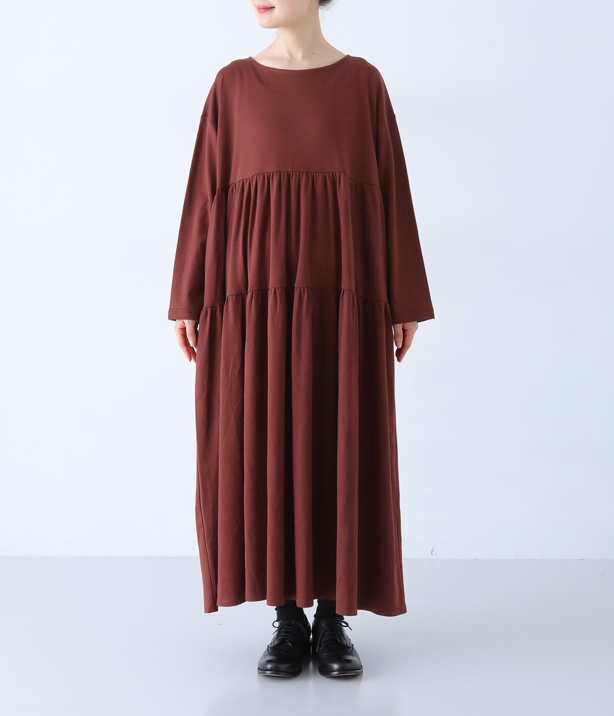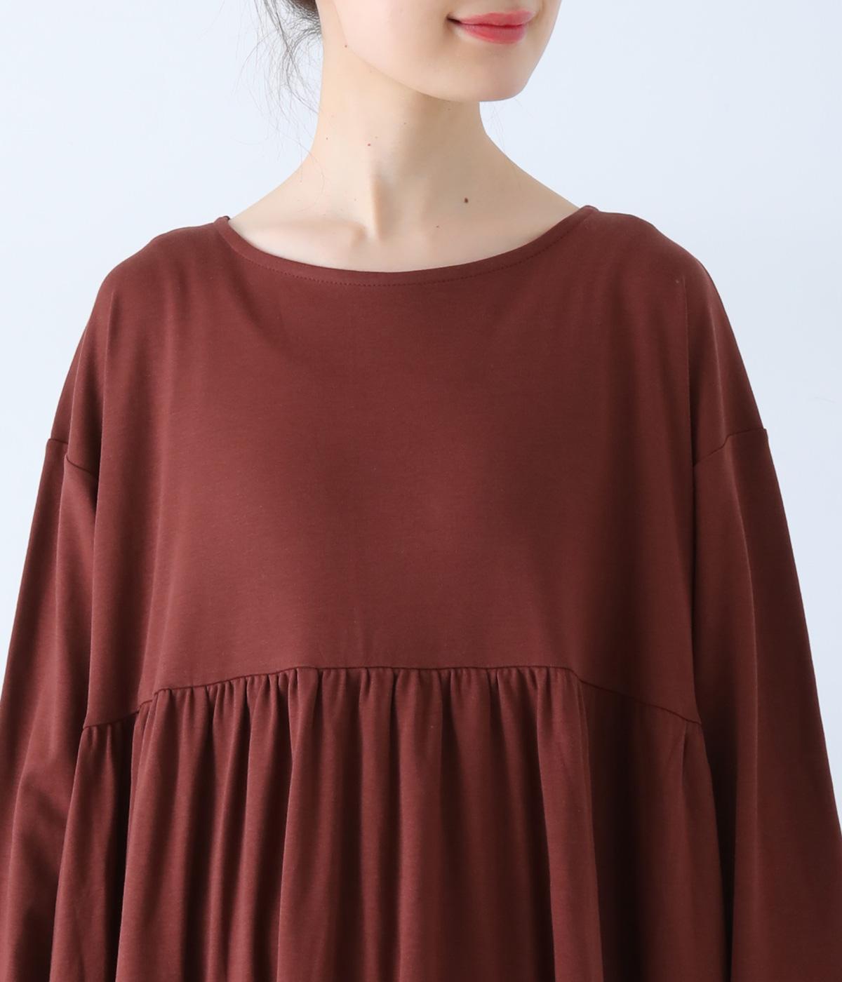 イージーに着用できるカットソーワンピース。たっぷりとギャザーを施したティアードデザインで、カジュアルな中にきれいめな印象をプラスしました。横に広めに開いたボートネックで首まわりをすっきりと印象づけ。一枚ではもちろん、上からアウターも羽織りやすくロングシーズンたのしめます。