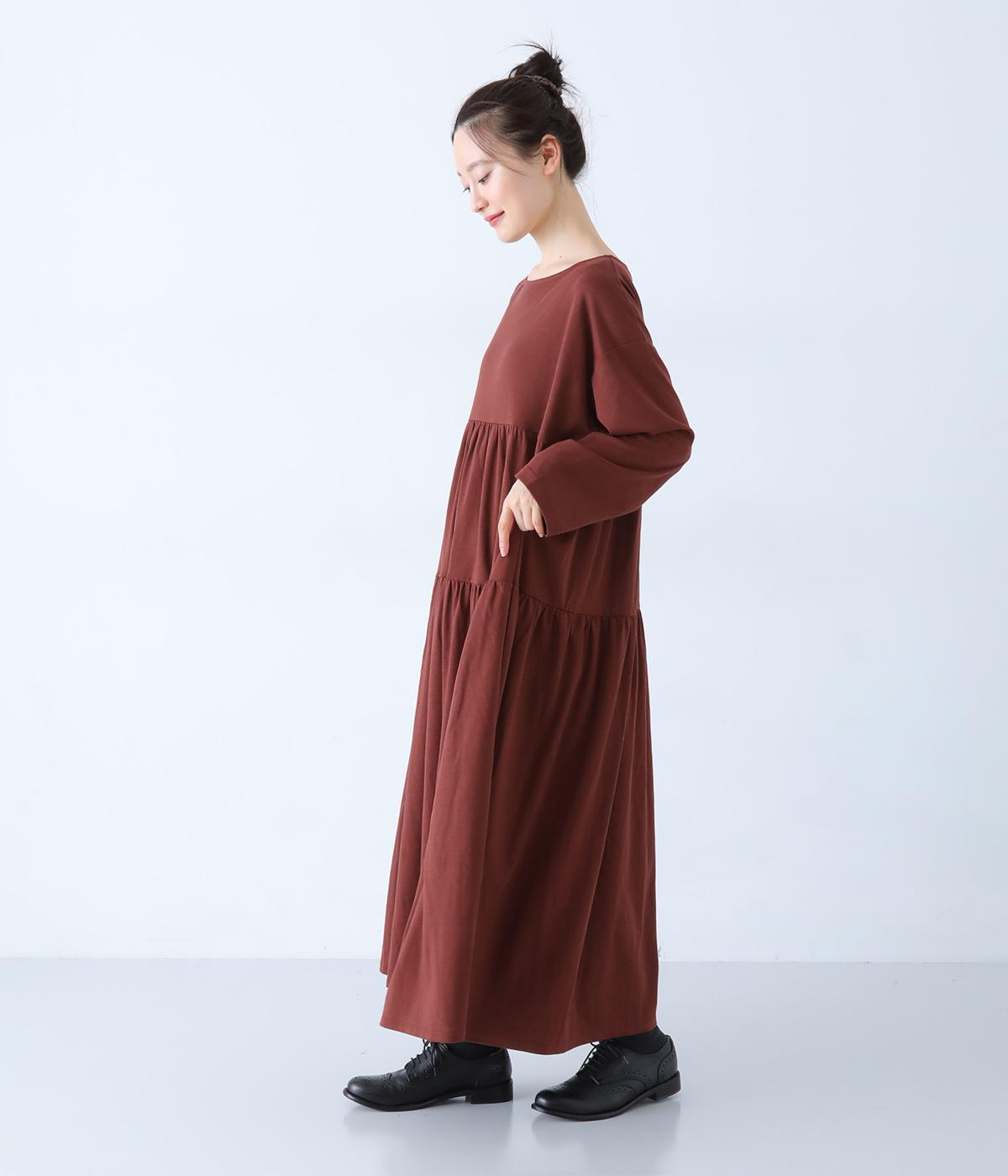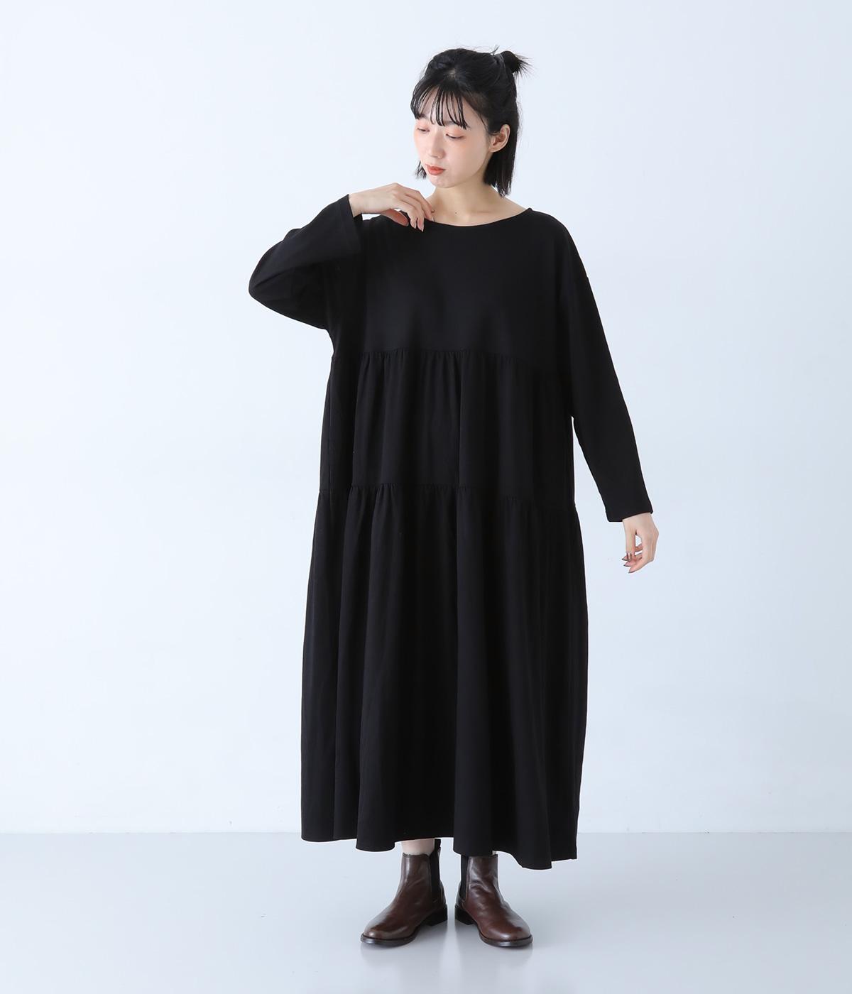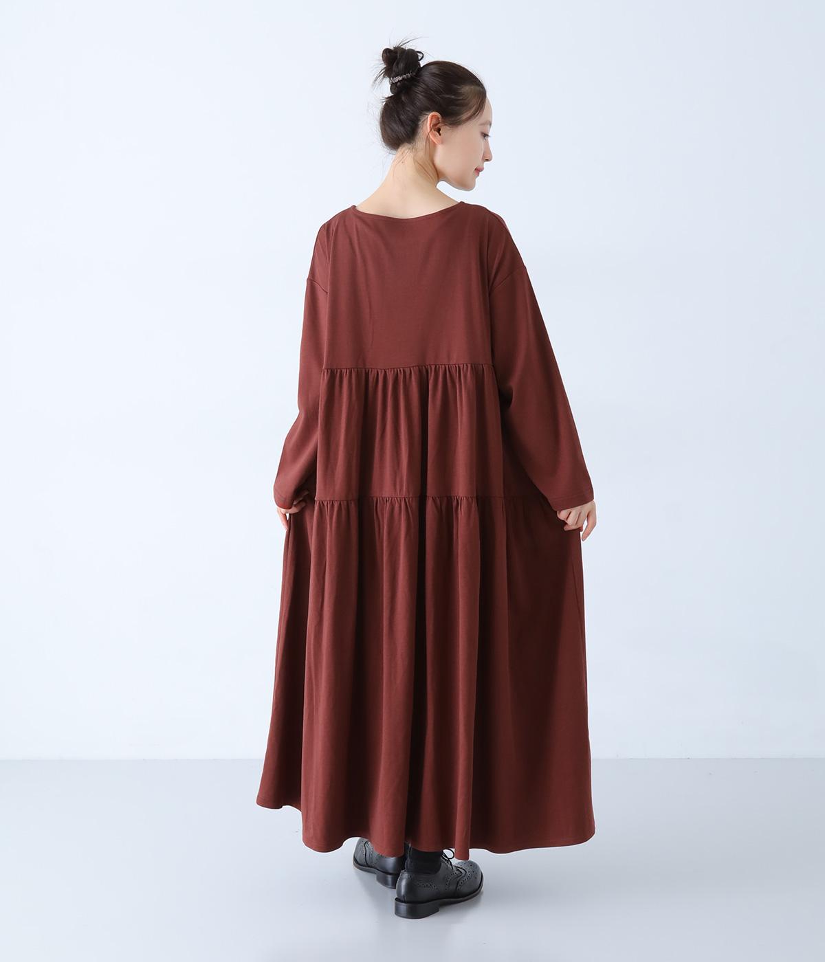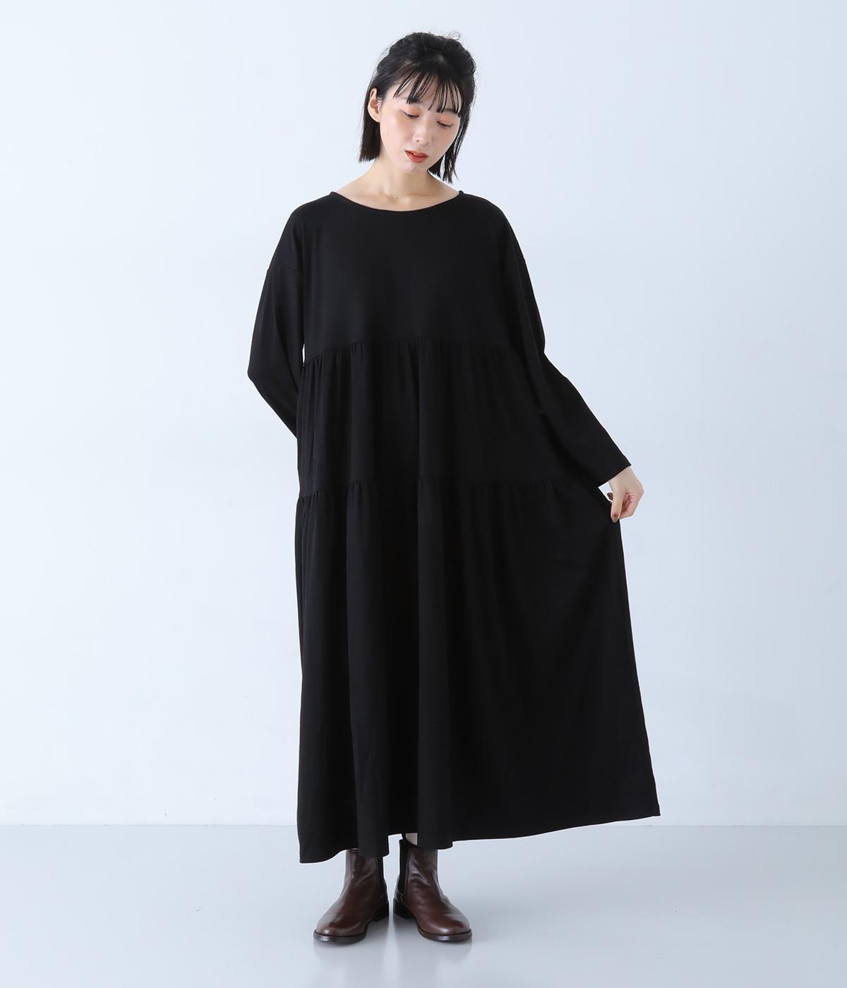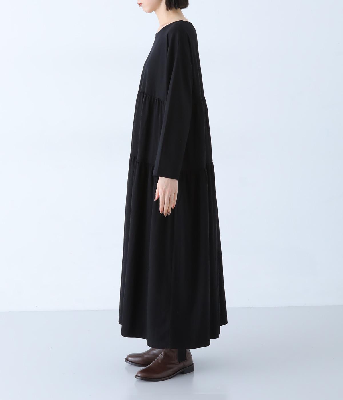 イージーに着用できるカットソーワンピース。たっぷりとギャザーを施したティアードデザインで、カジュアルな中にきれいめな印象をプラスしました。横に広めに開いたボートネックで首まわりをすっきりと印象づけ。一枚ではもちろん、上からアウターも羽織りやすくロングシーズンたのしめます。