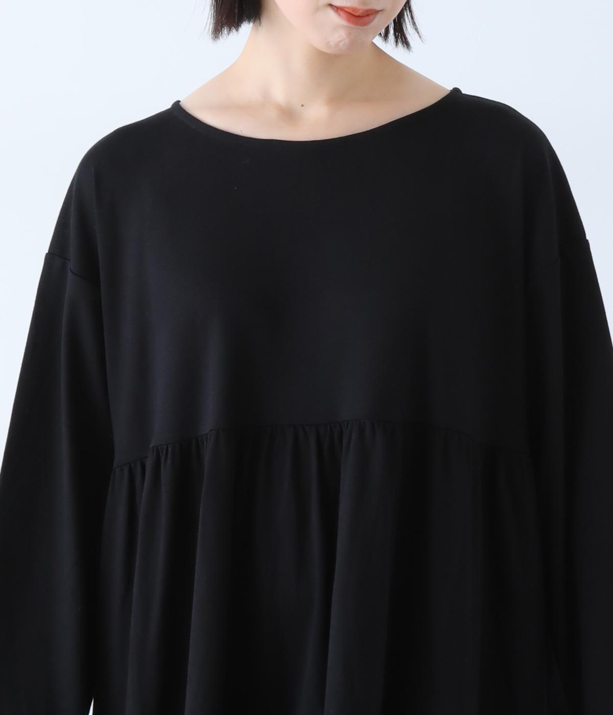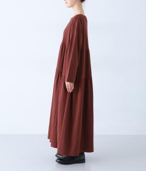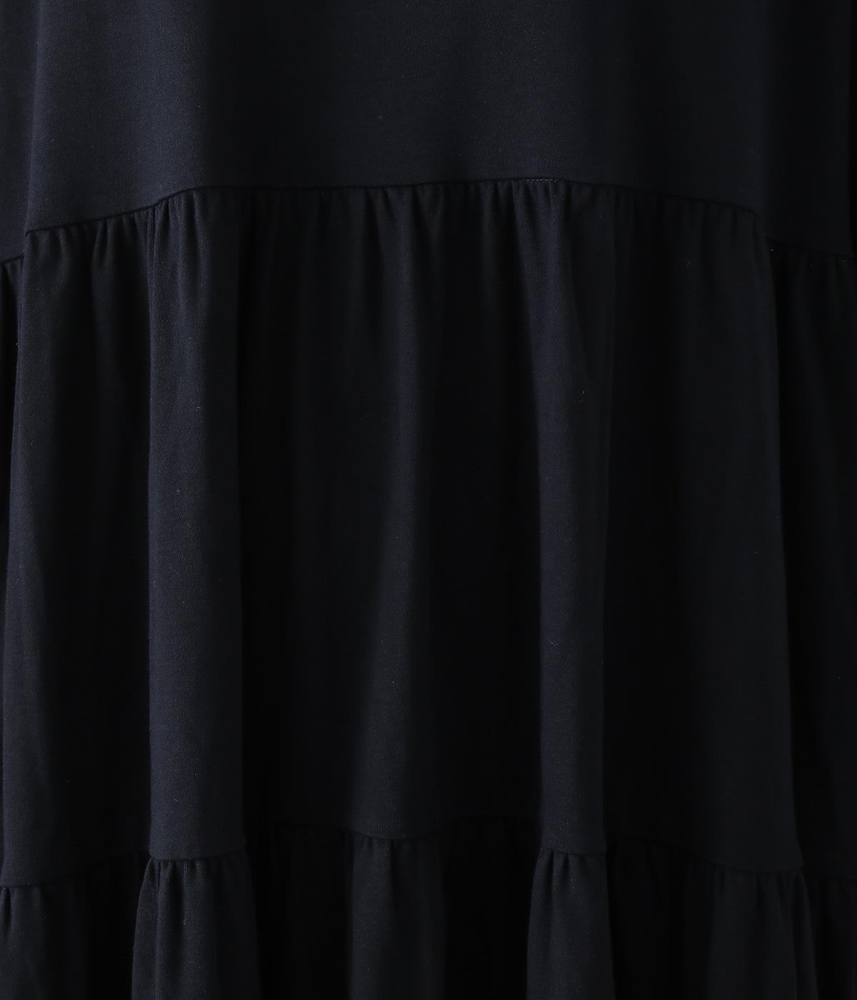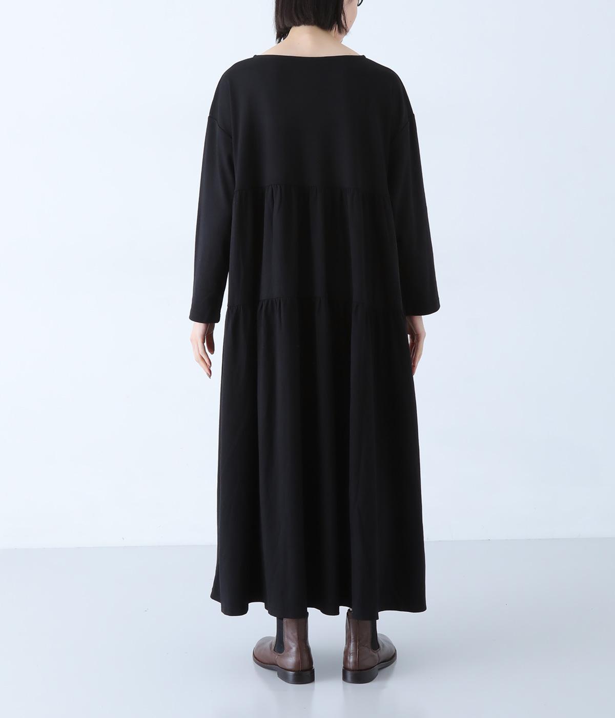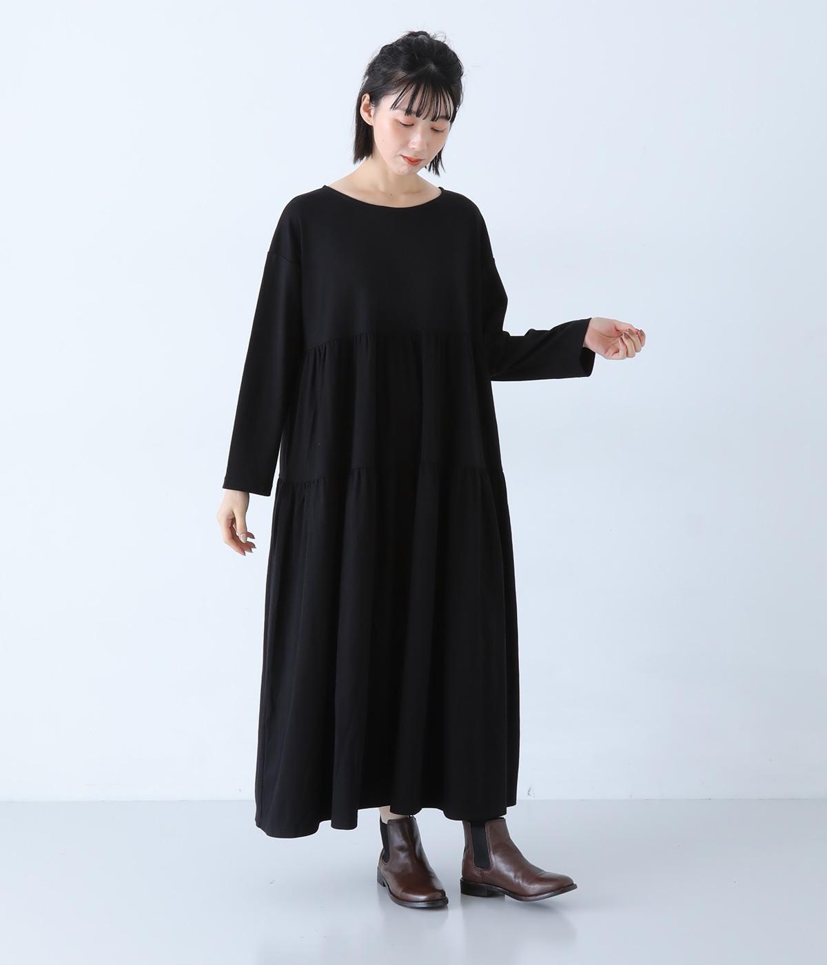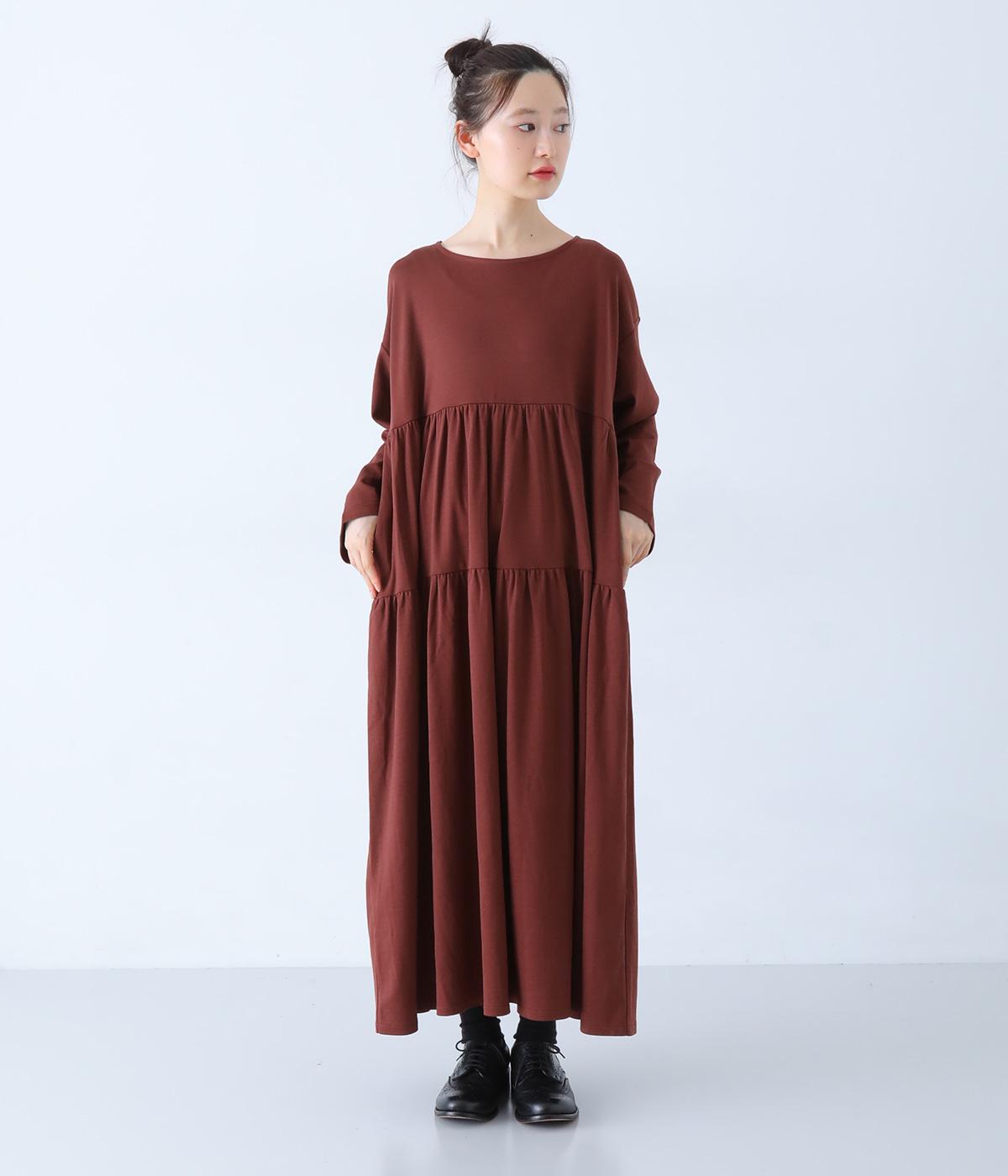 イージーに着用できるカットソーワンピース。たっぷりとギャザーを施したティアードデザインで、カジュアルな中にきれいめな印象をプラスしました。横に広めに開いたボートネックで首まわりをすっきりと印象づけ。一枚ではもちろん、上からアウターも羽織りやすくロングシーズンたのしめます。