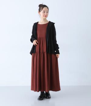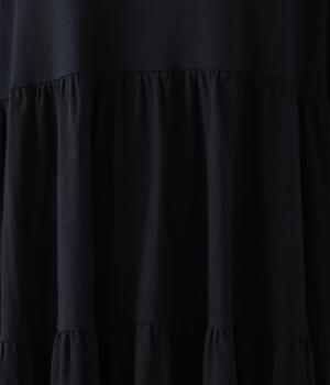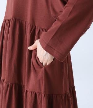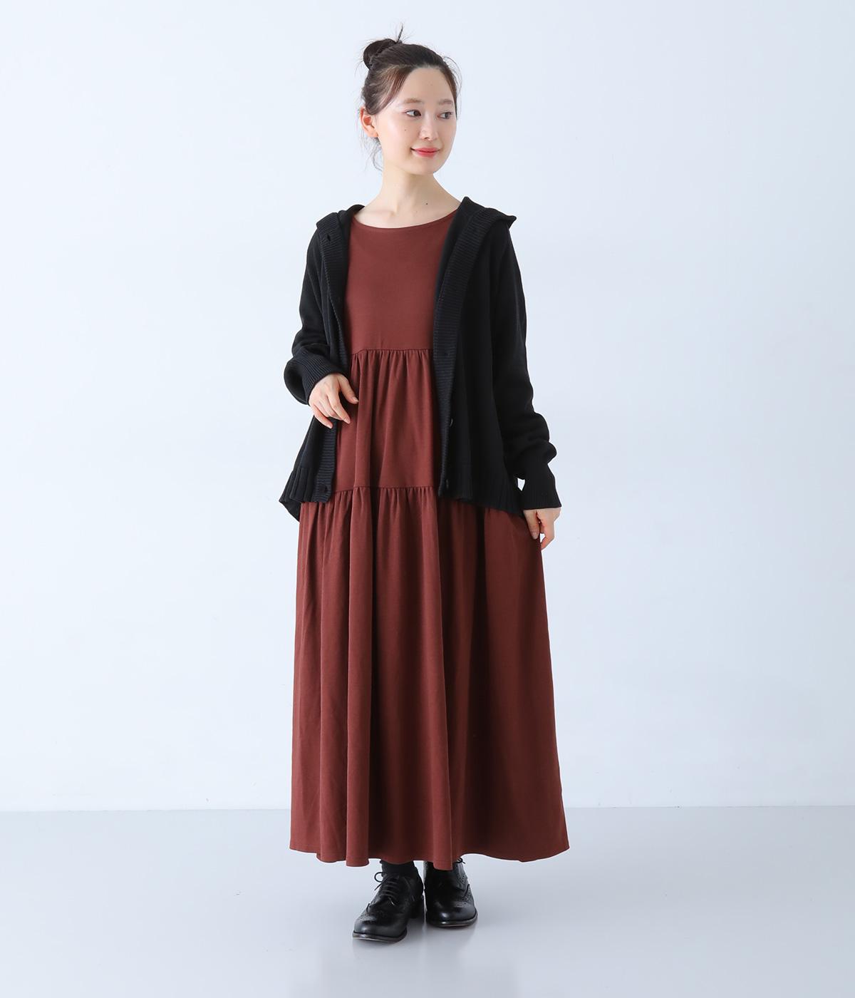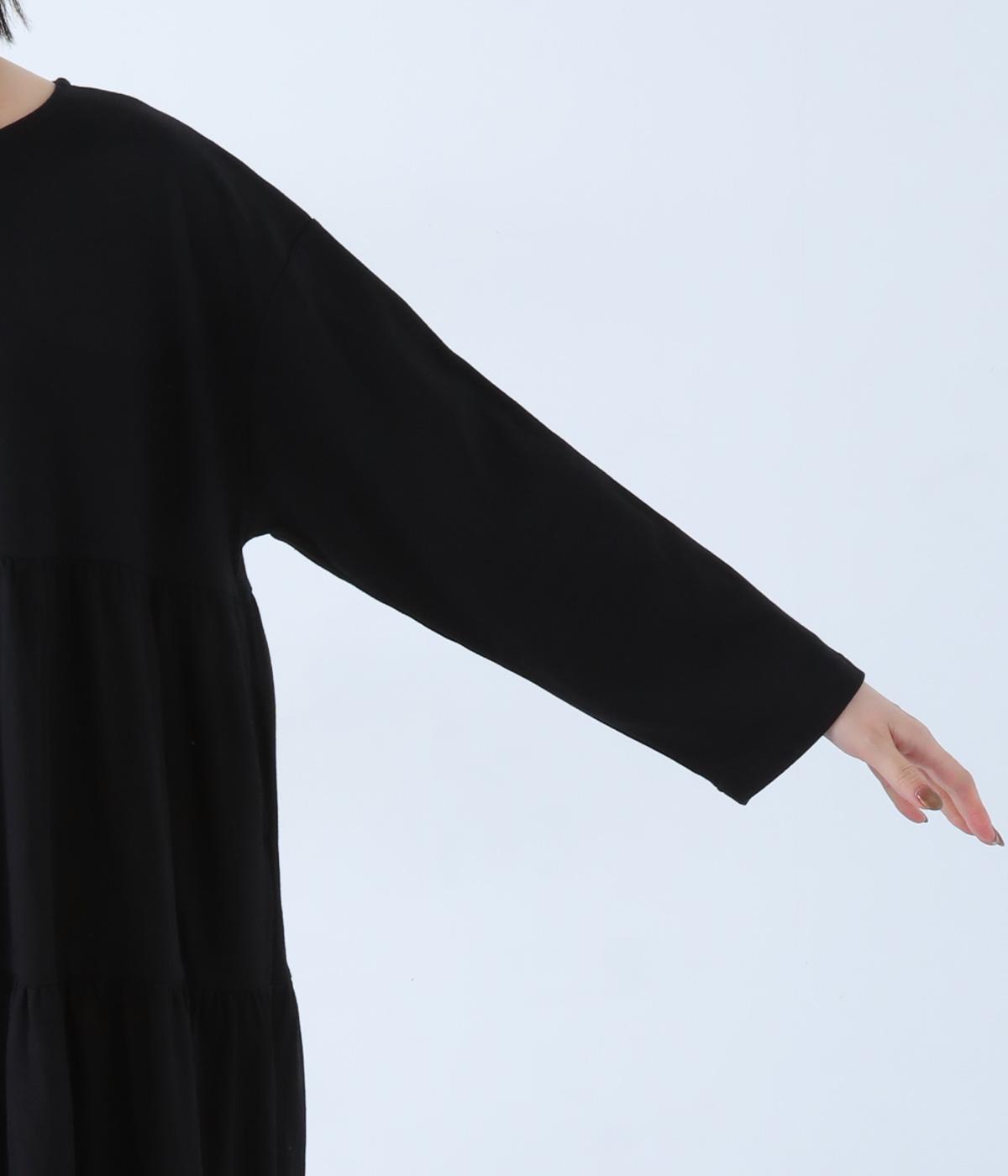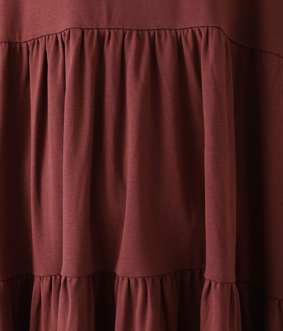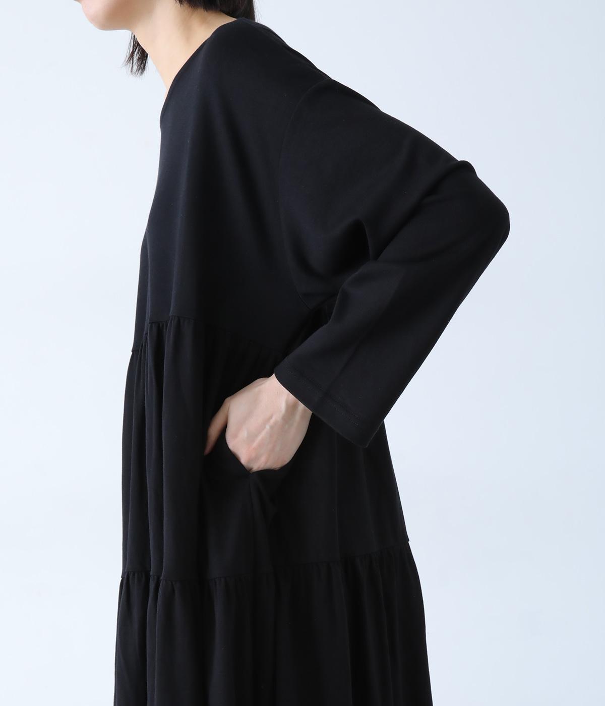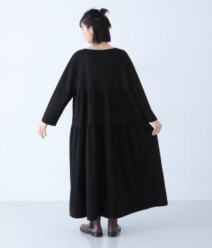イージーに着用できるカットソーワンピース。たっぷりとギャザーを施したティアードデザインで、カジュアルな中にきれいめな印象をプラスしました。横に広めに開いたボートネックで首まわりをすっきりと印象づけ。一枚ではもちろん、上からアウターも羽織りやすくロングシーズンたのしめます。