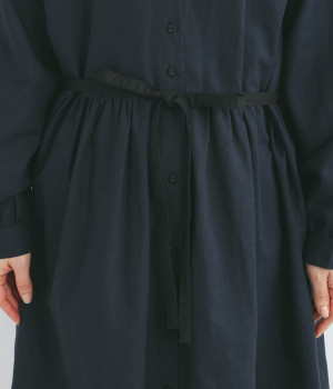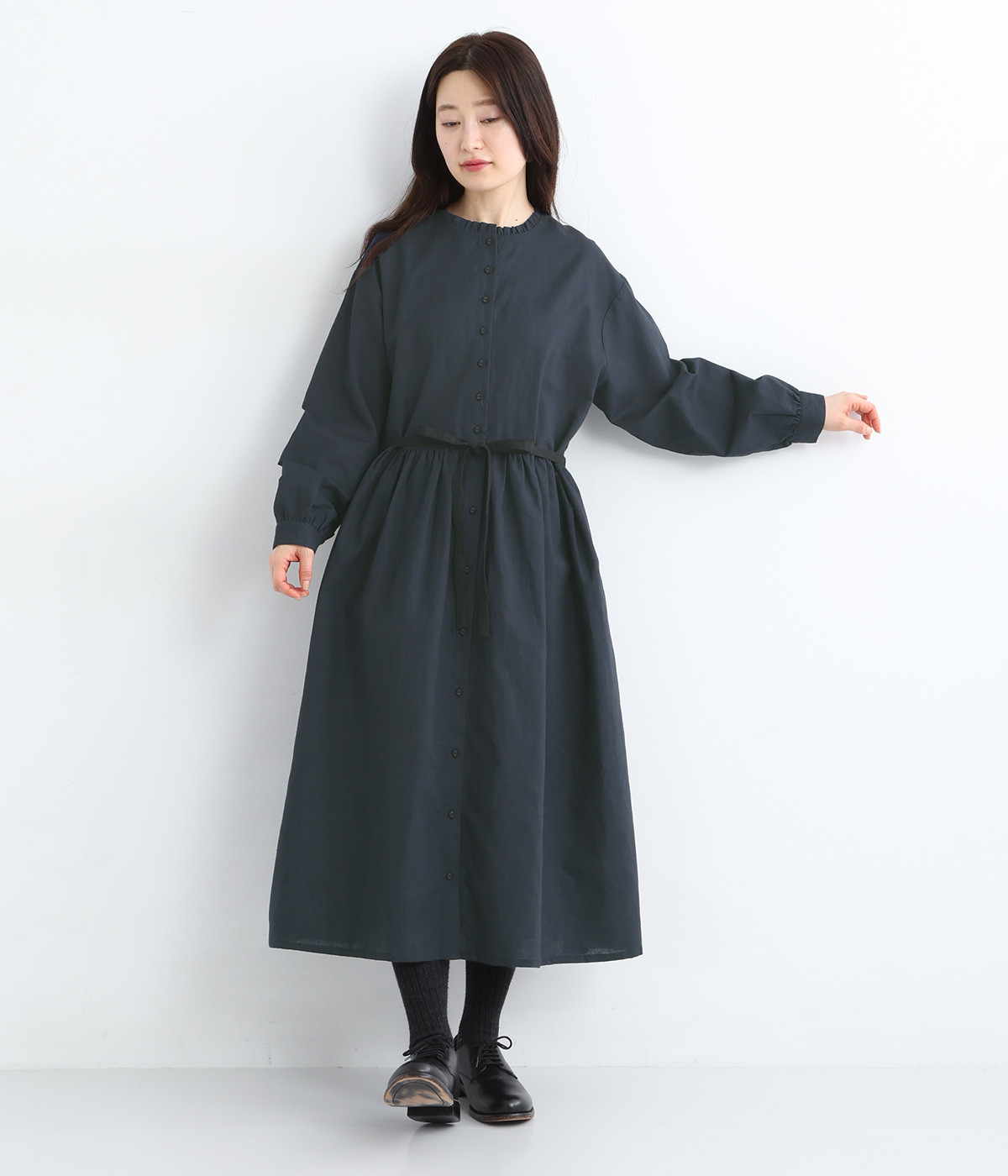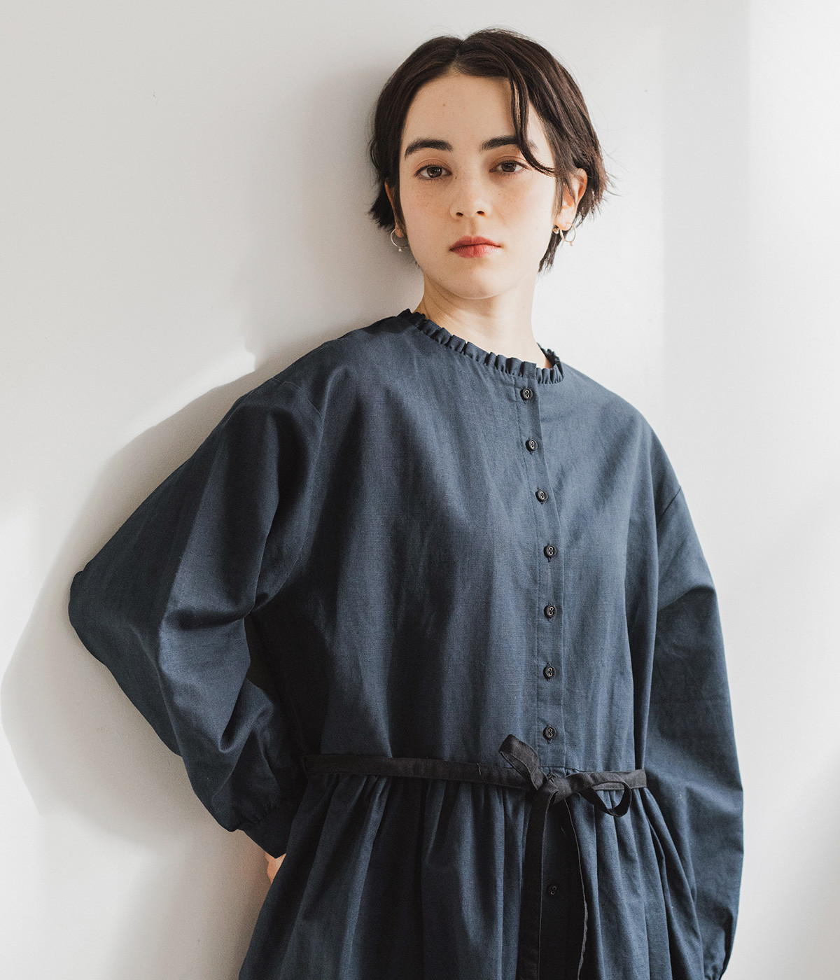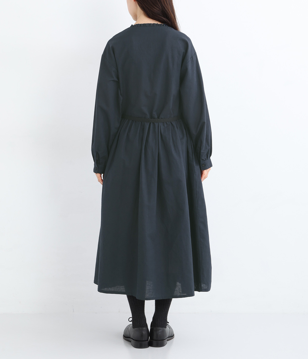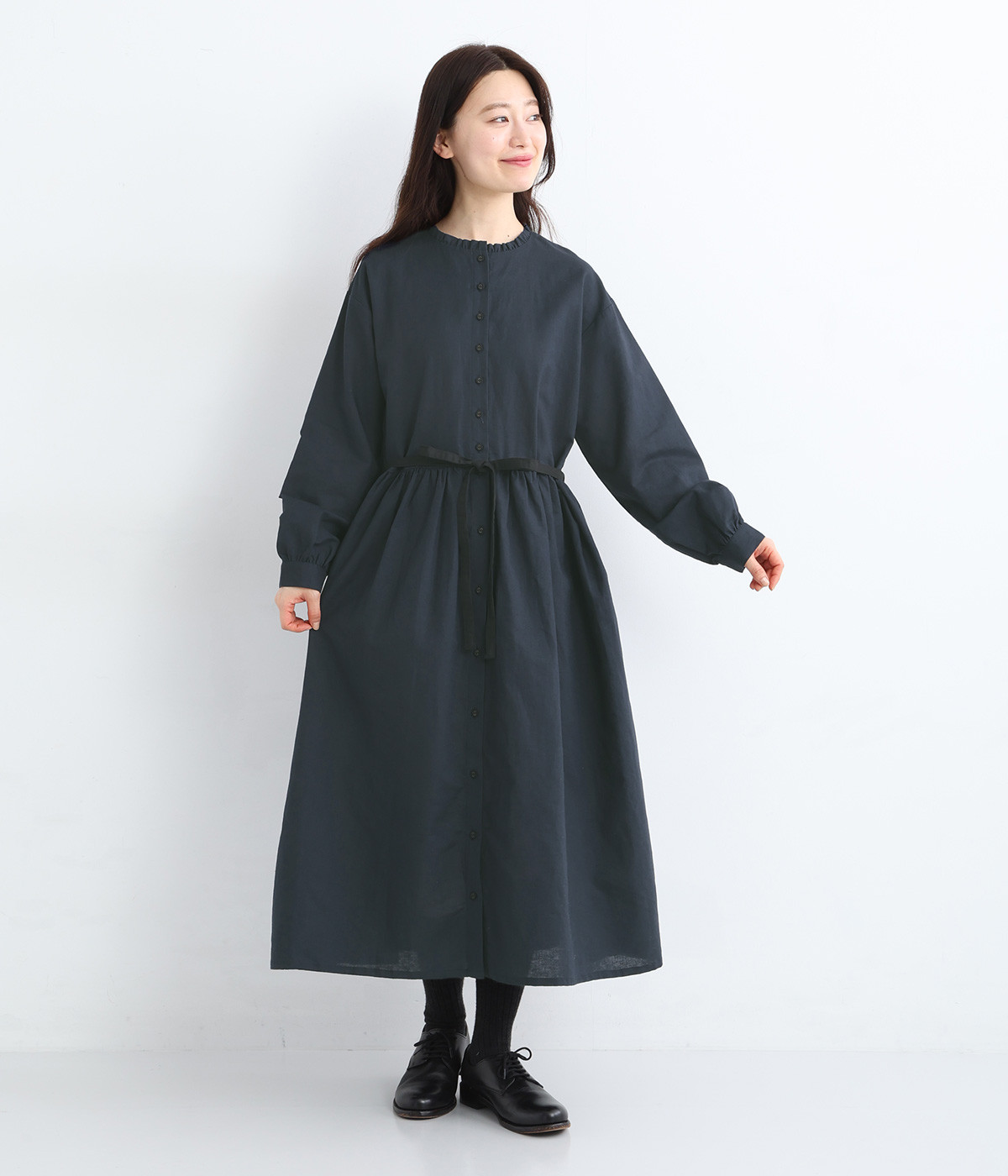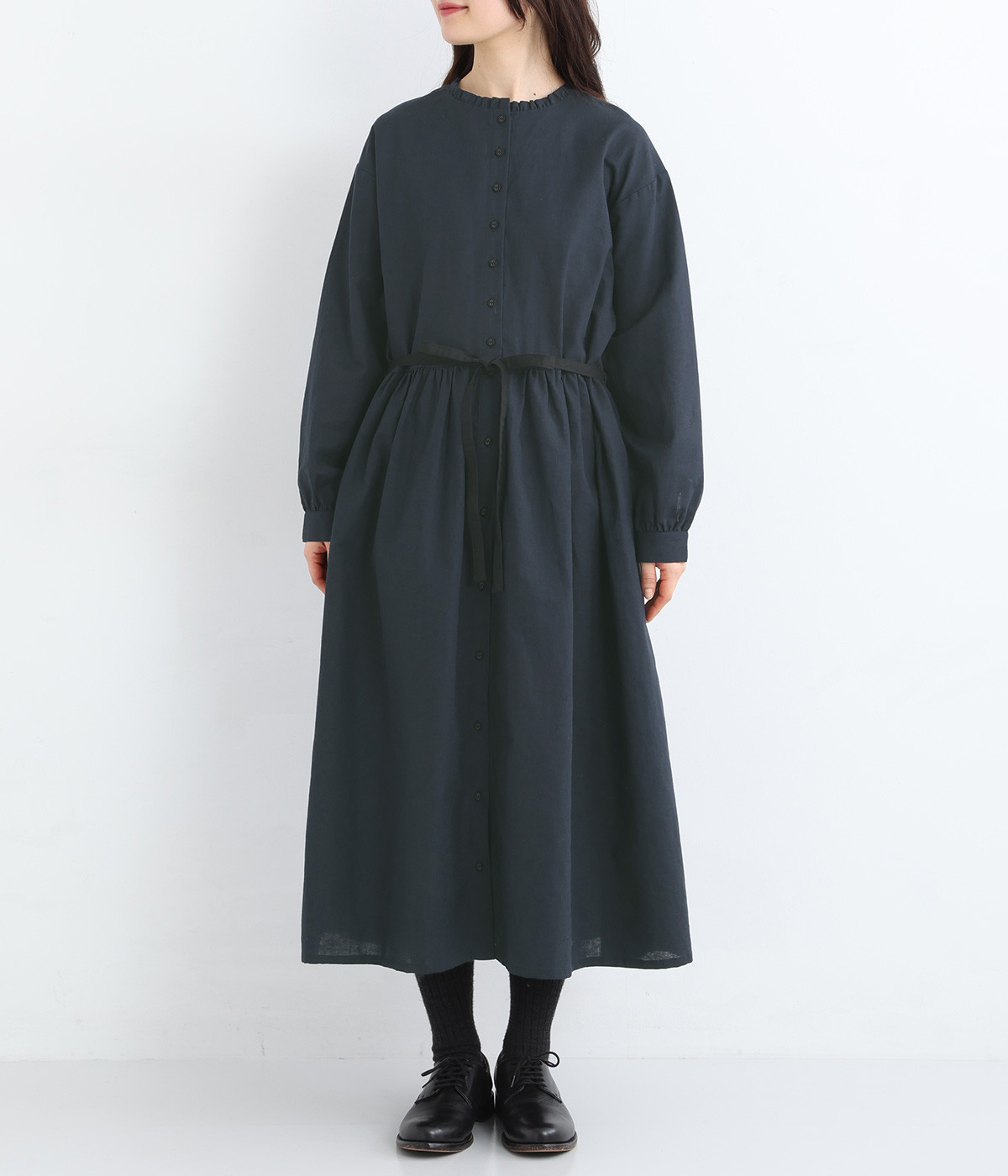 小さめのフリルがあしらわれた可愛らしい襟が特徴。ウエストのギャザーが綺麗なフレアシルエットを作ります。二つ穴くるみボタンと締め色のリボンベルトで大人の上品さを演出。ボタンを開ければ羽織りとしても活躍します。
