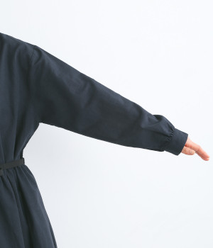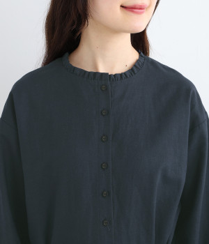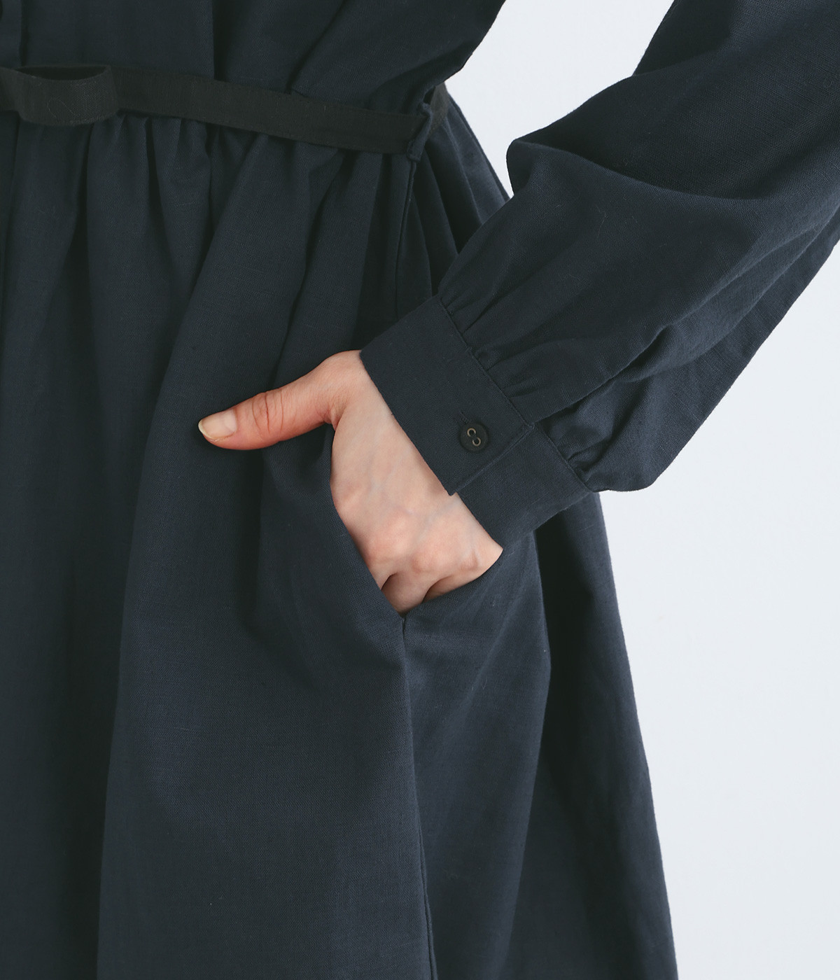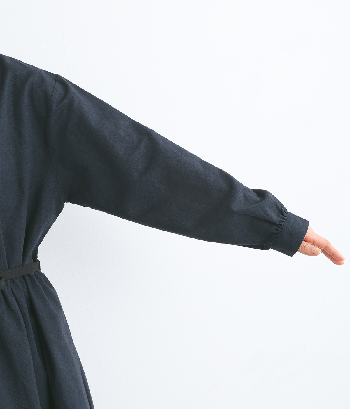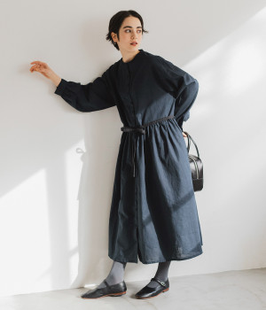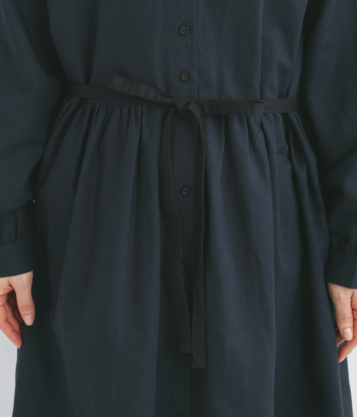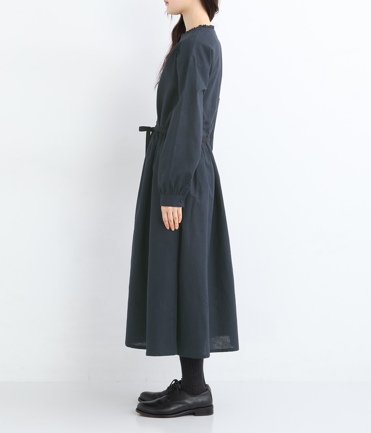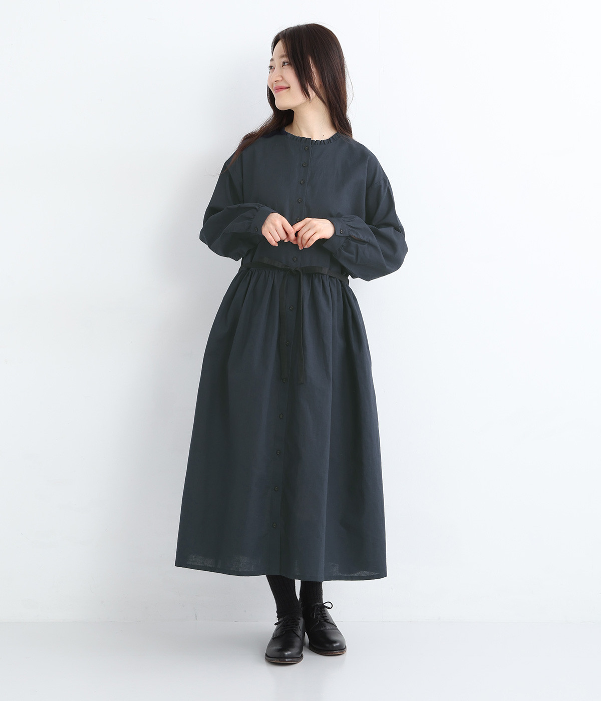 小さめのフリルがあしらわれた可愛らしい襟が特徴。ウエストのギャザーが綺麗なフレアシルエットを作ります。二つ穴くるみボタンと締め色のリボンベルトで大人の上品さを演出。ボタンを開ければ羽織りとしても活躍します。