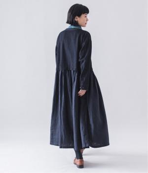 首元をきれいに見せるバンドカラーに、ウエストまで開く前ボタンで着脱もスムーズ。軽やかなスカートにデニムトップスを重ねたような仕様が印象的な、大人に似合うフォルムに仕上げました。