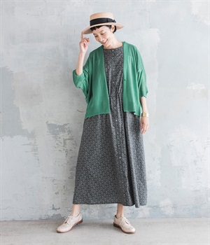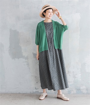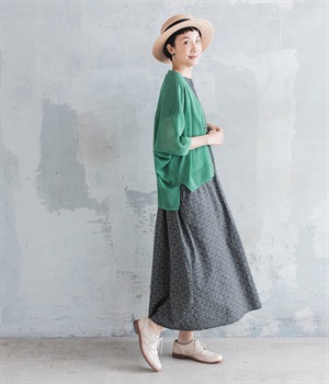 シックな印象はそのままに、夏らしい彩りを楽しめるアレンジコーデ。カーディガンを羽織るだけで、装いに軽やかな華やぎが生まれます。