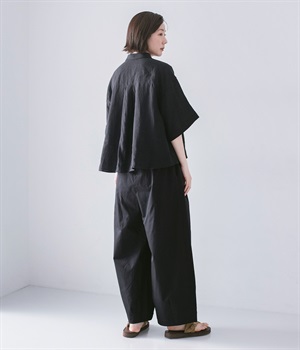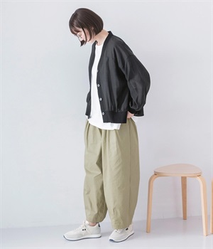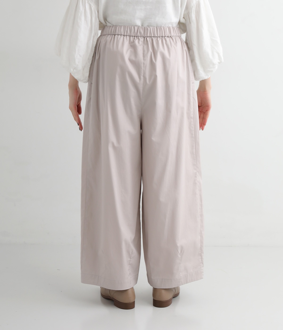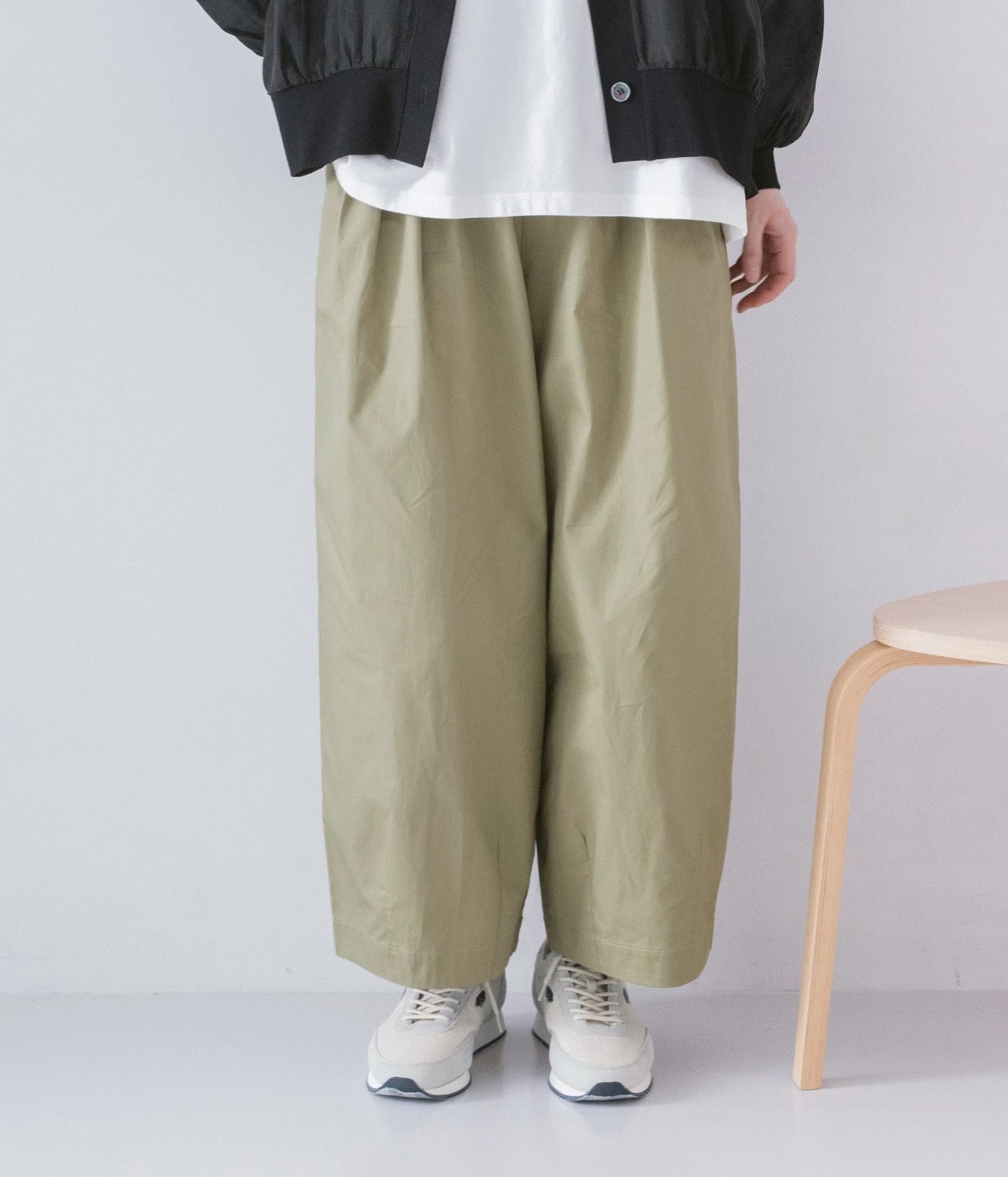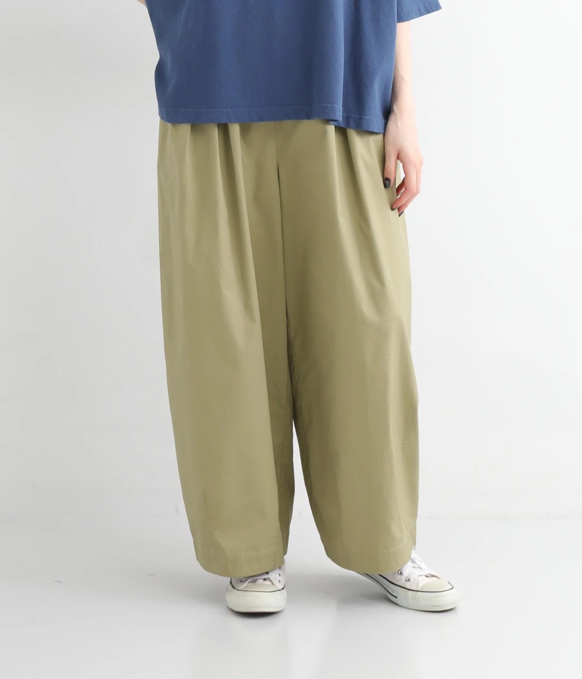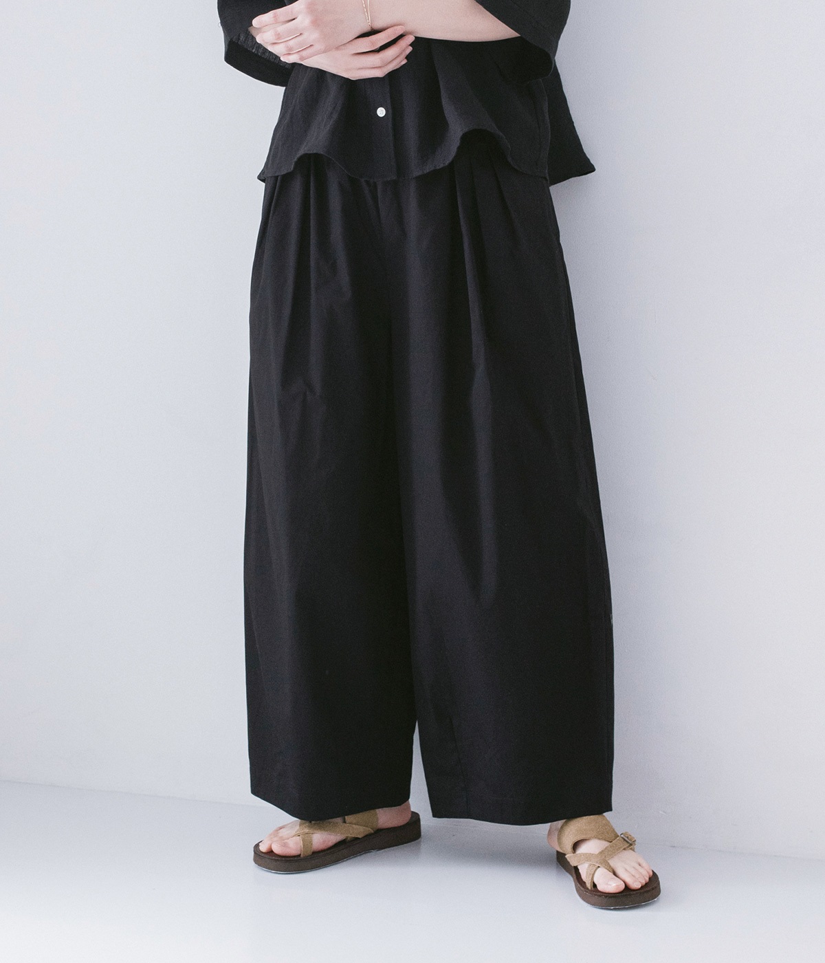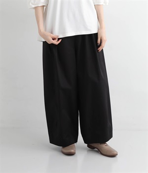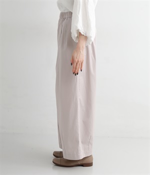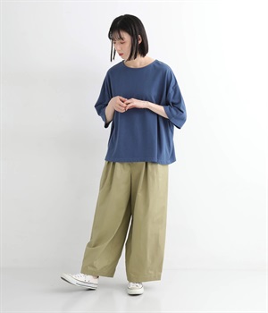 ウエストにはタックを入れることで、気になるお腹まわりもカバーしてすっきり。肌離れがよく涼しいだけでなく、脚のラインを拾わないのもワイドパンツの魅力です。