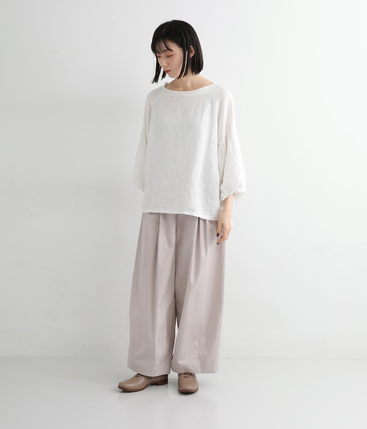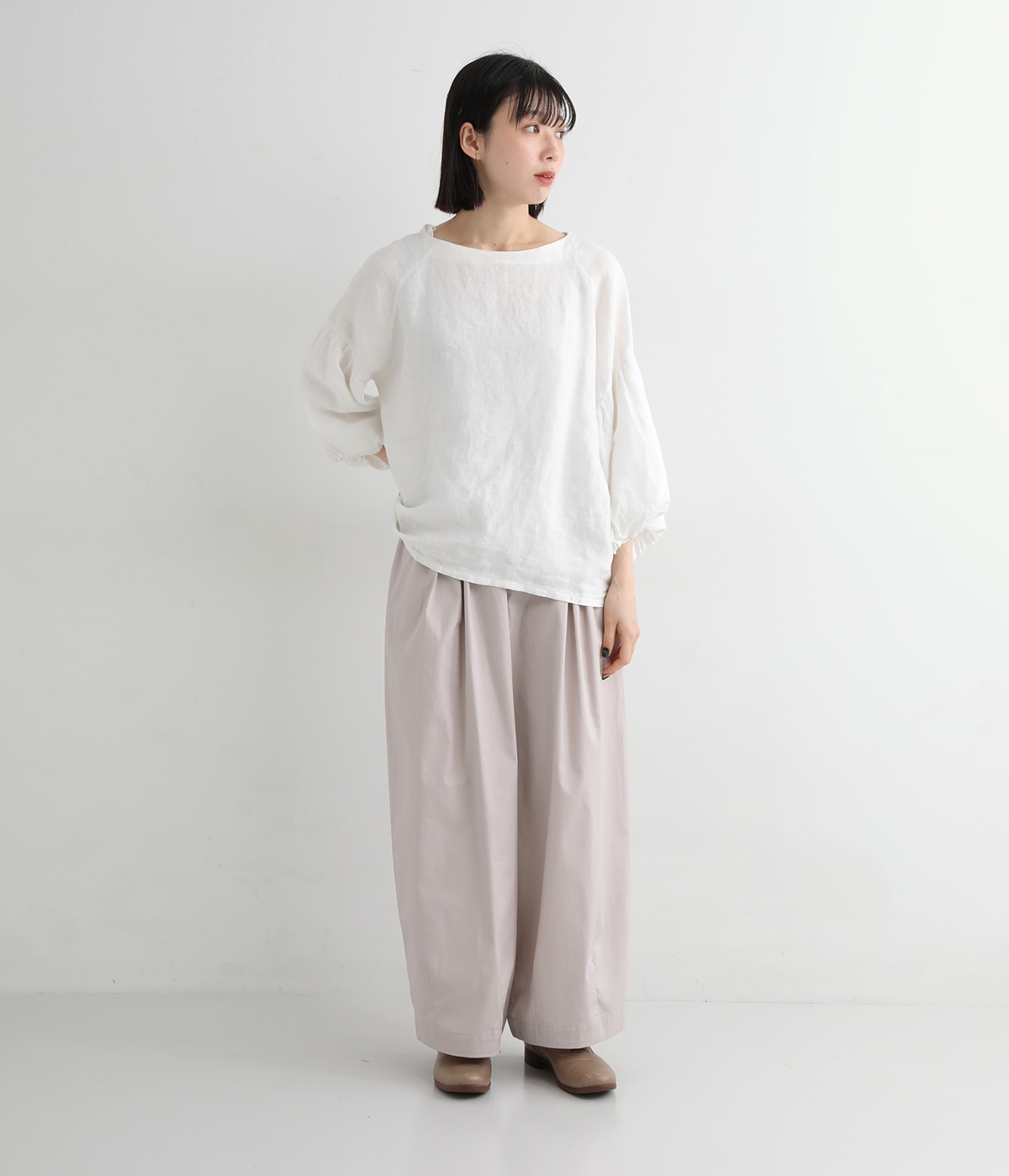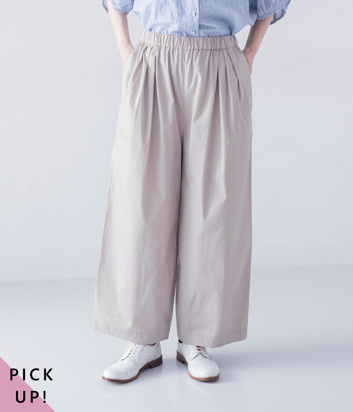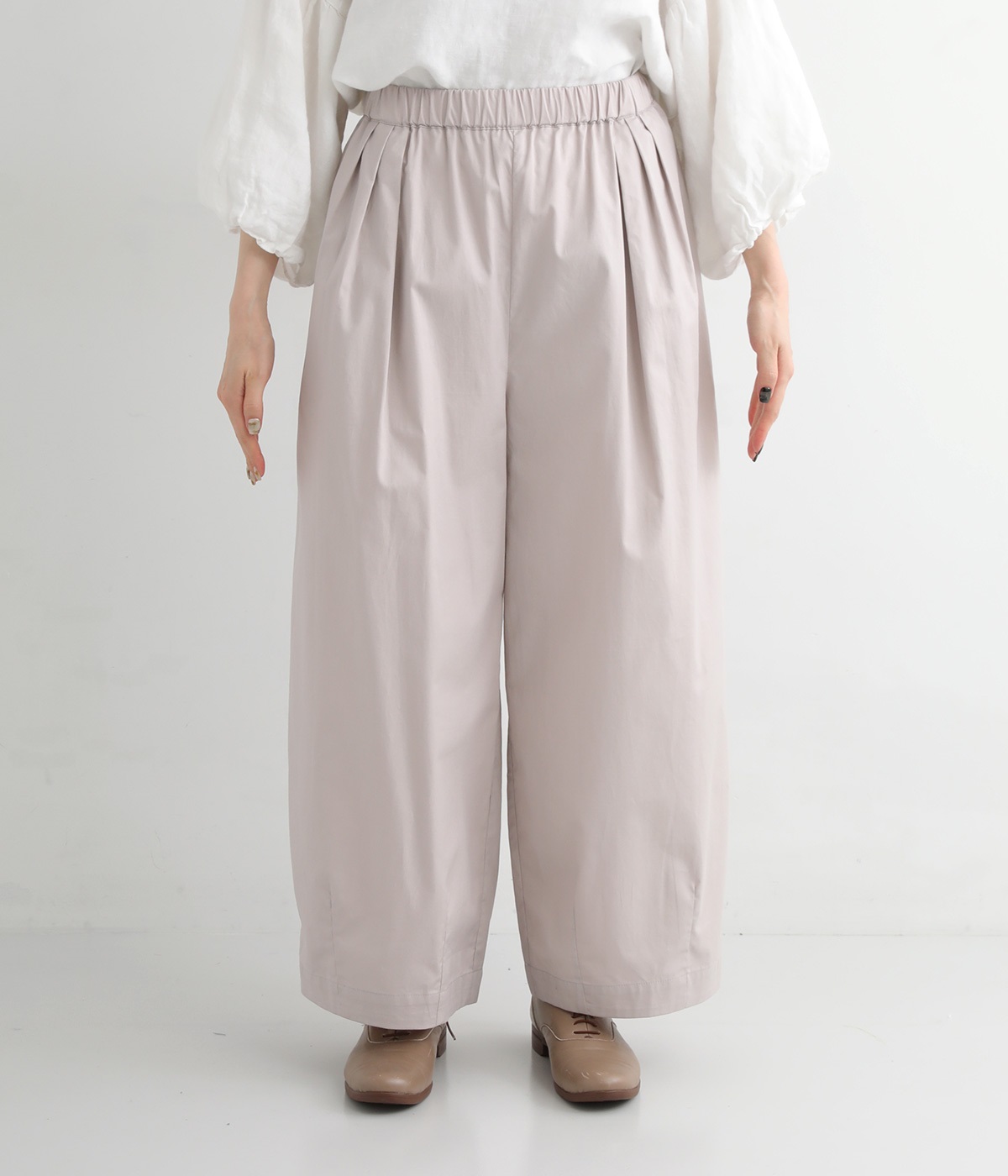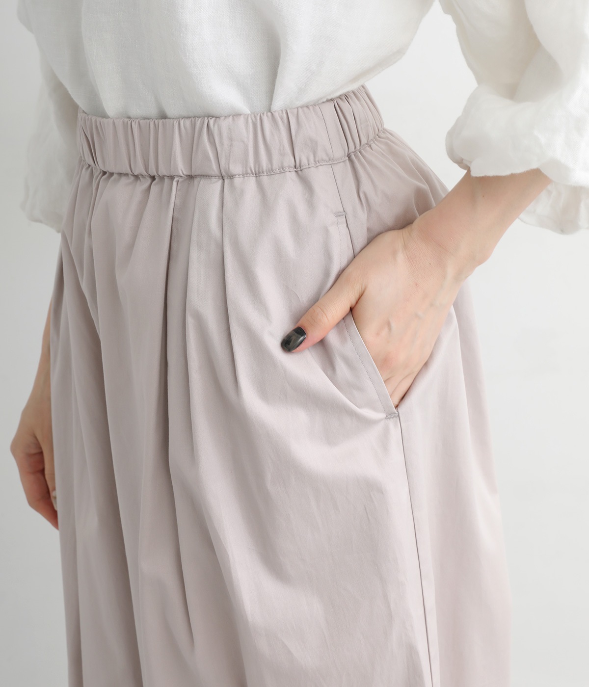 ウエストにはタックを入れることで、気になるお腹まわりもカバーしてすっきり。肌離れがよく涼しいだけでなく、脚のラインを拾わないのもワイドパンツの魅力です。