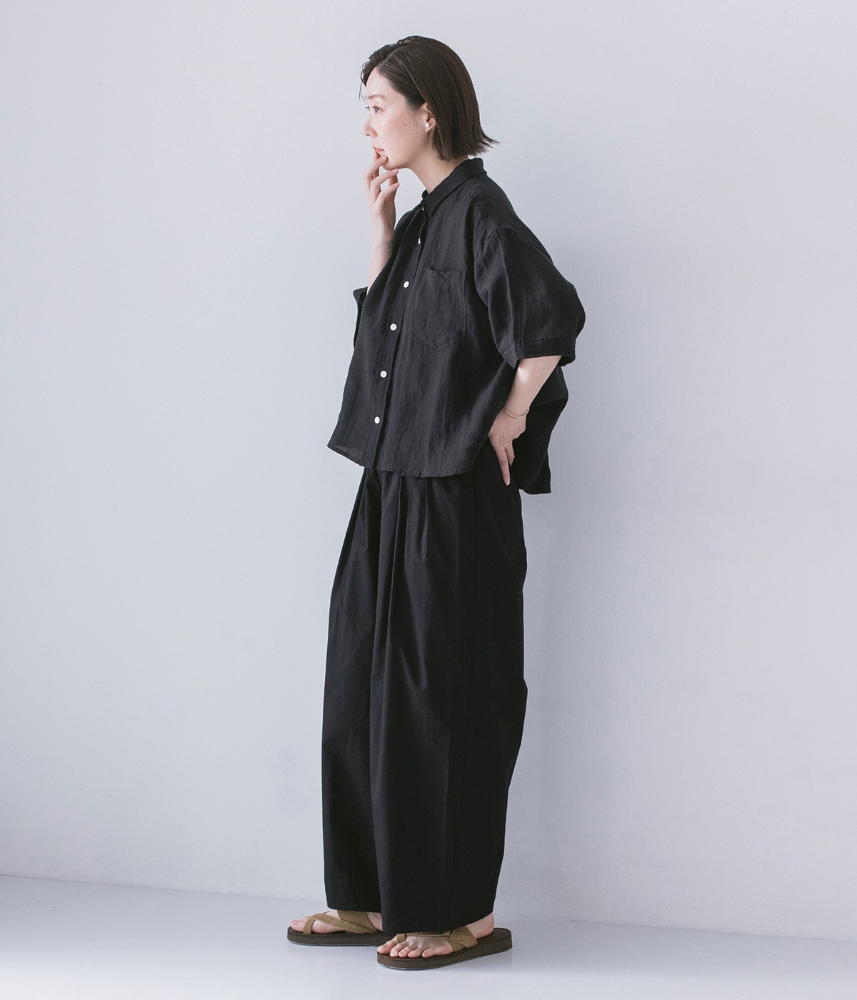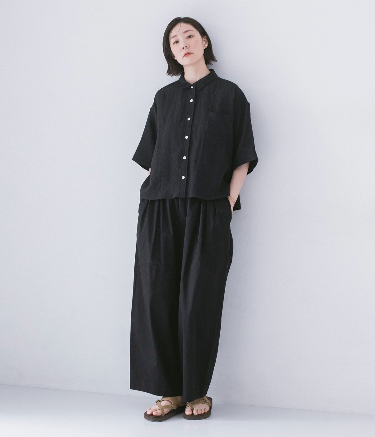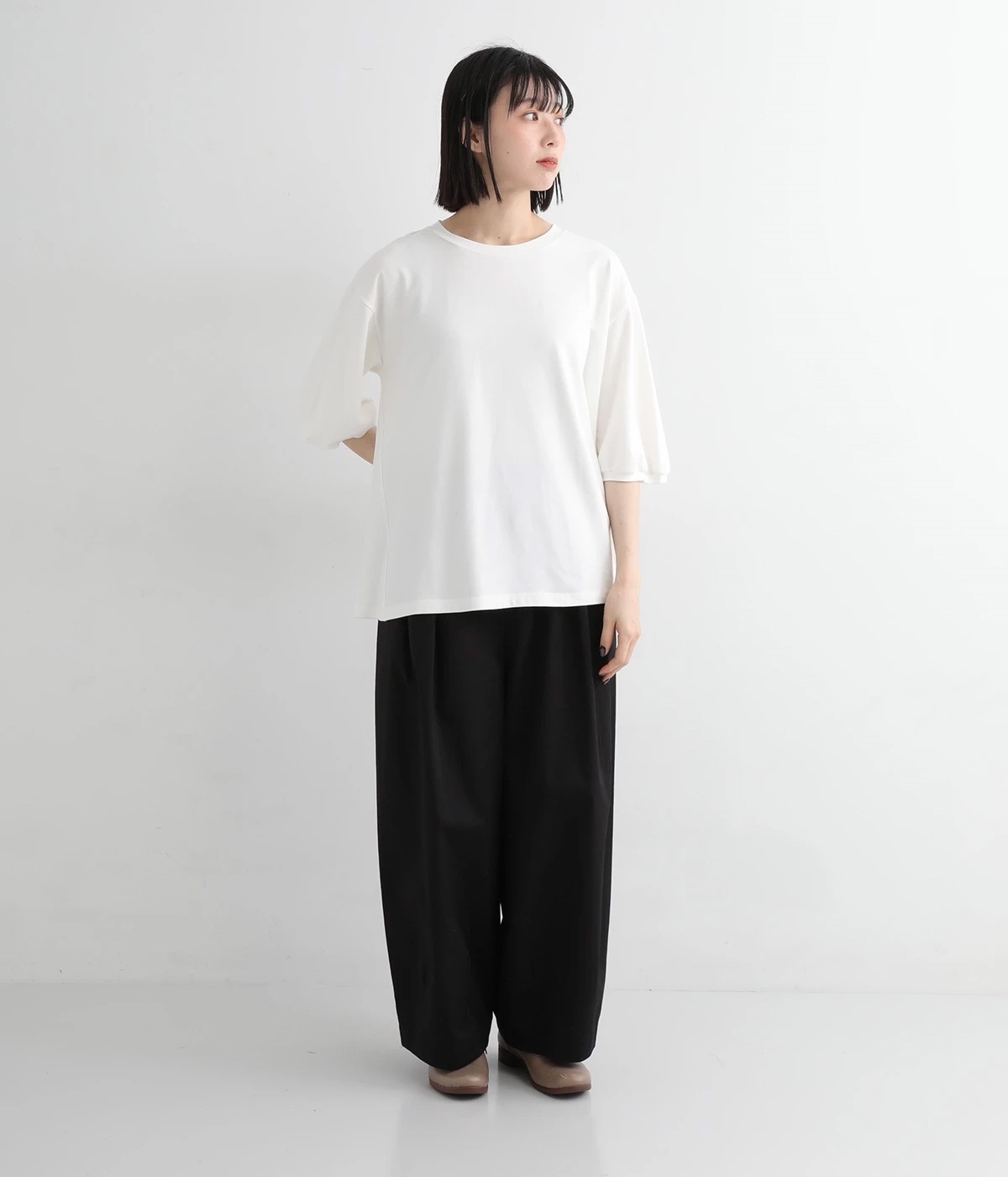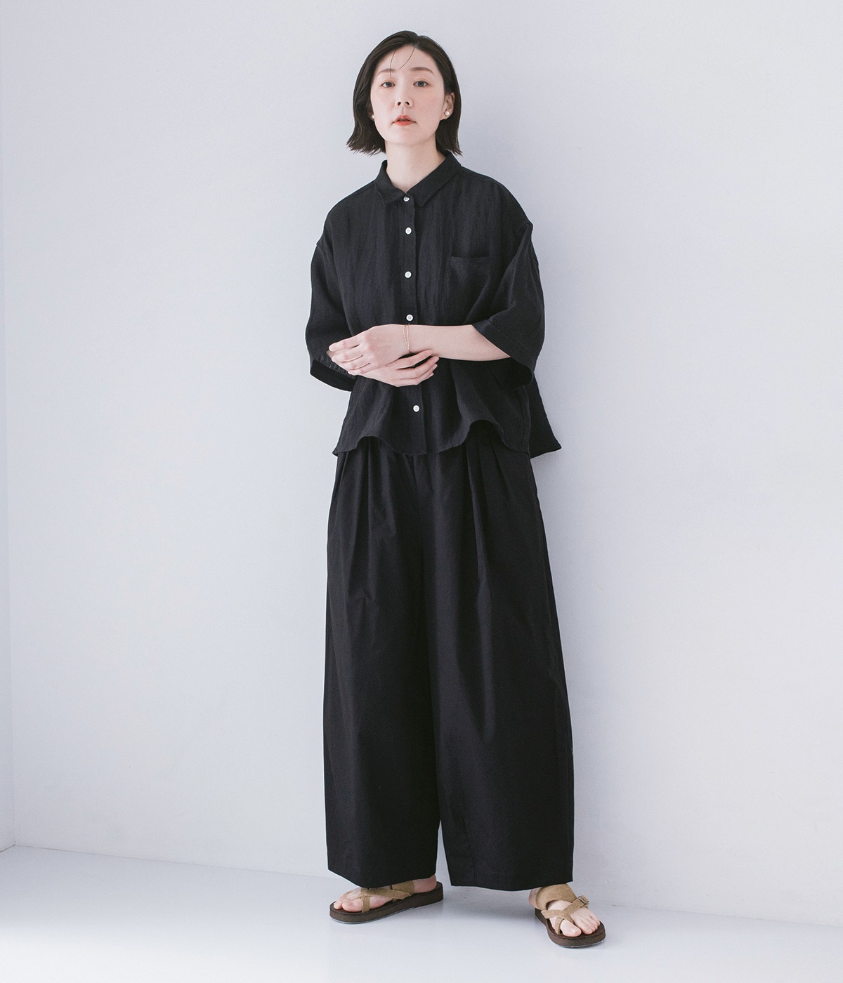 ウエストにはタックを入れることで、気になるお腹まわりもカバーしてすっきり。肌離れがよく涼しいだけでなく、脚のラインを拾わないのもワイドパンツの魅力です。