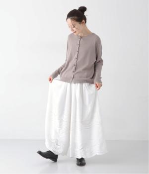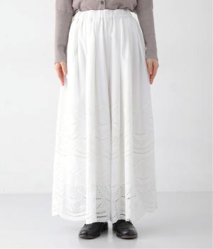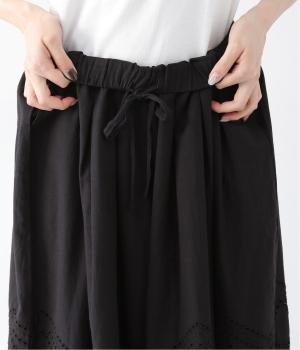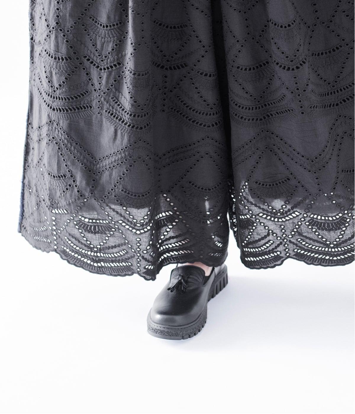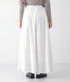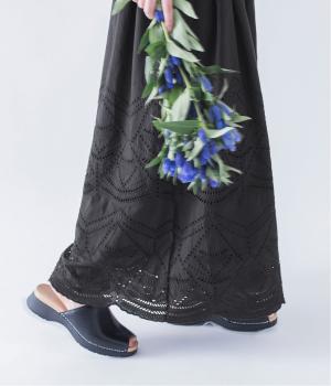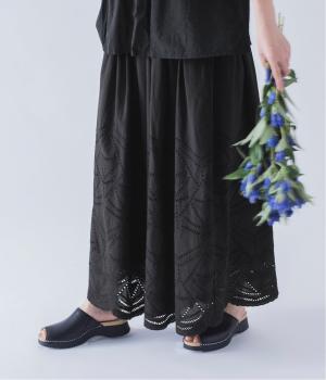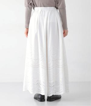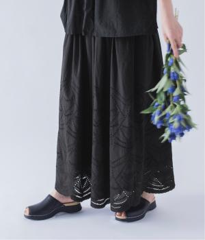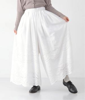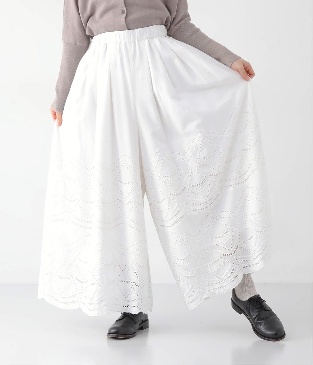模様を刺繍で縁取り、その内側を切り抜いて透かし模様をつくり出したカットワーク。ブラウスは袖に、パンツは裾にかけて贅沢にあしらいました。
