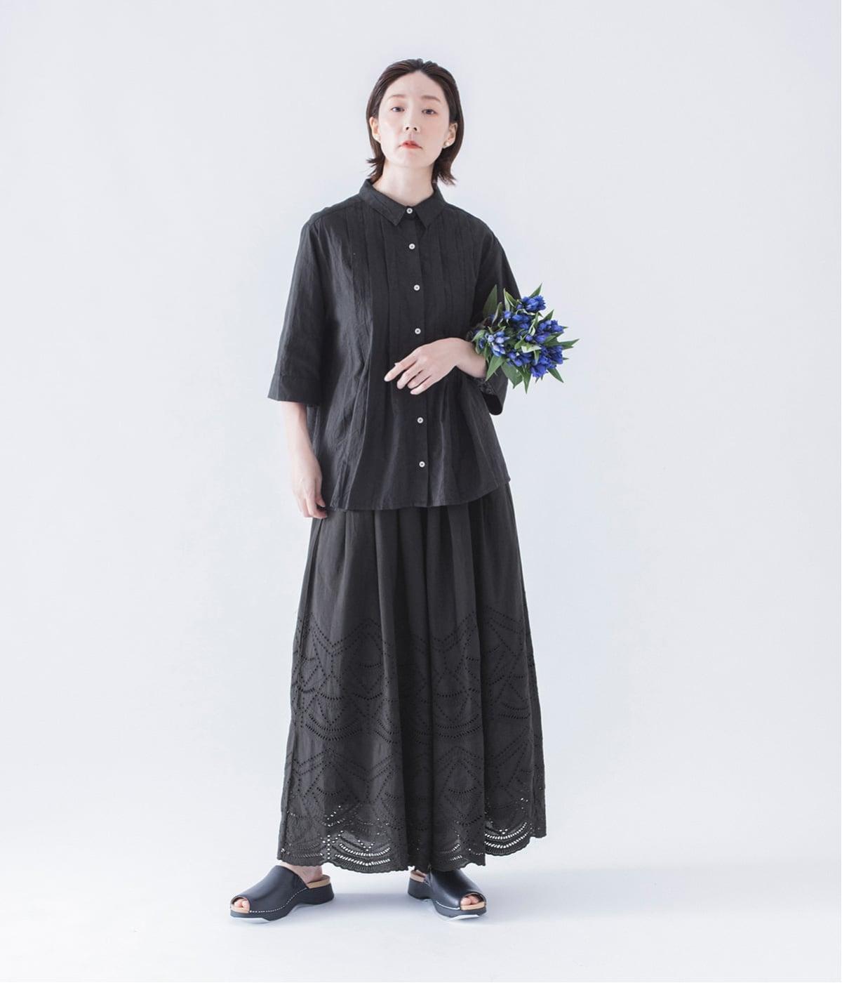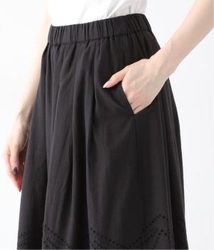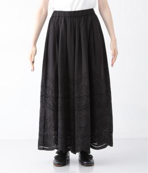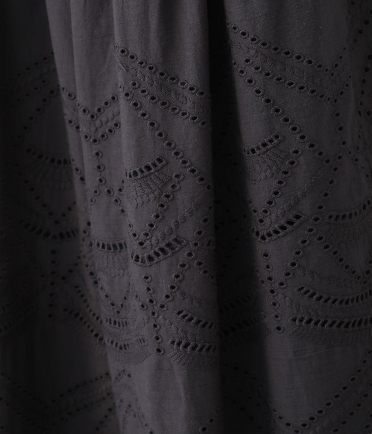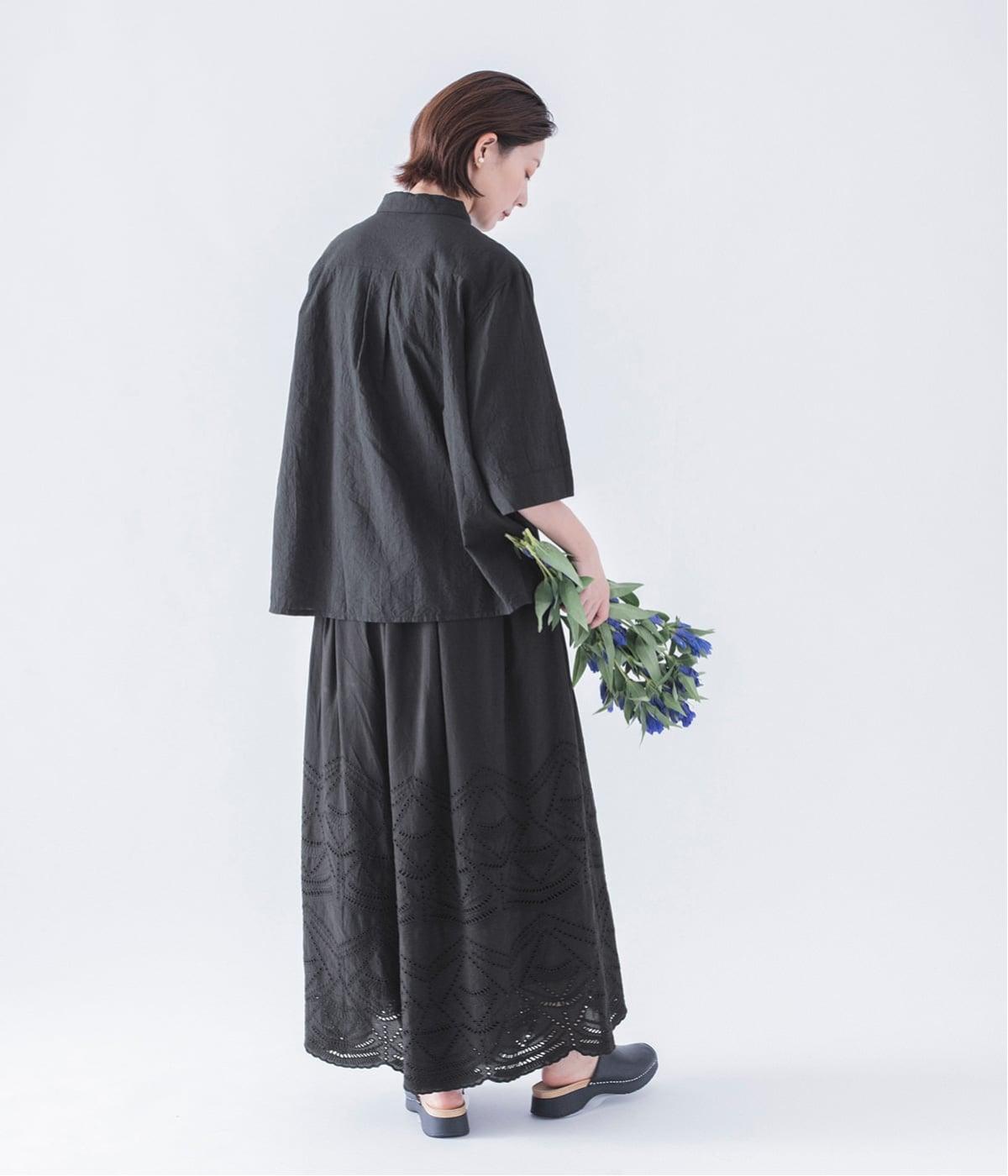 模様を刺繍で縁取り、その内側を切り抜いて透かし模様をつくり出したカットワーク。ブラウスは袖に、パンツは裾にかけて贅沢にあしらいました。