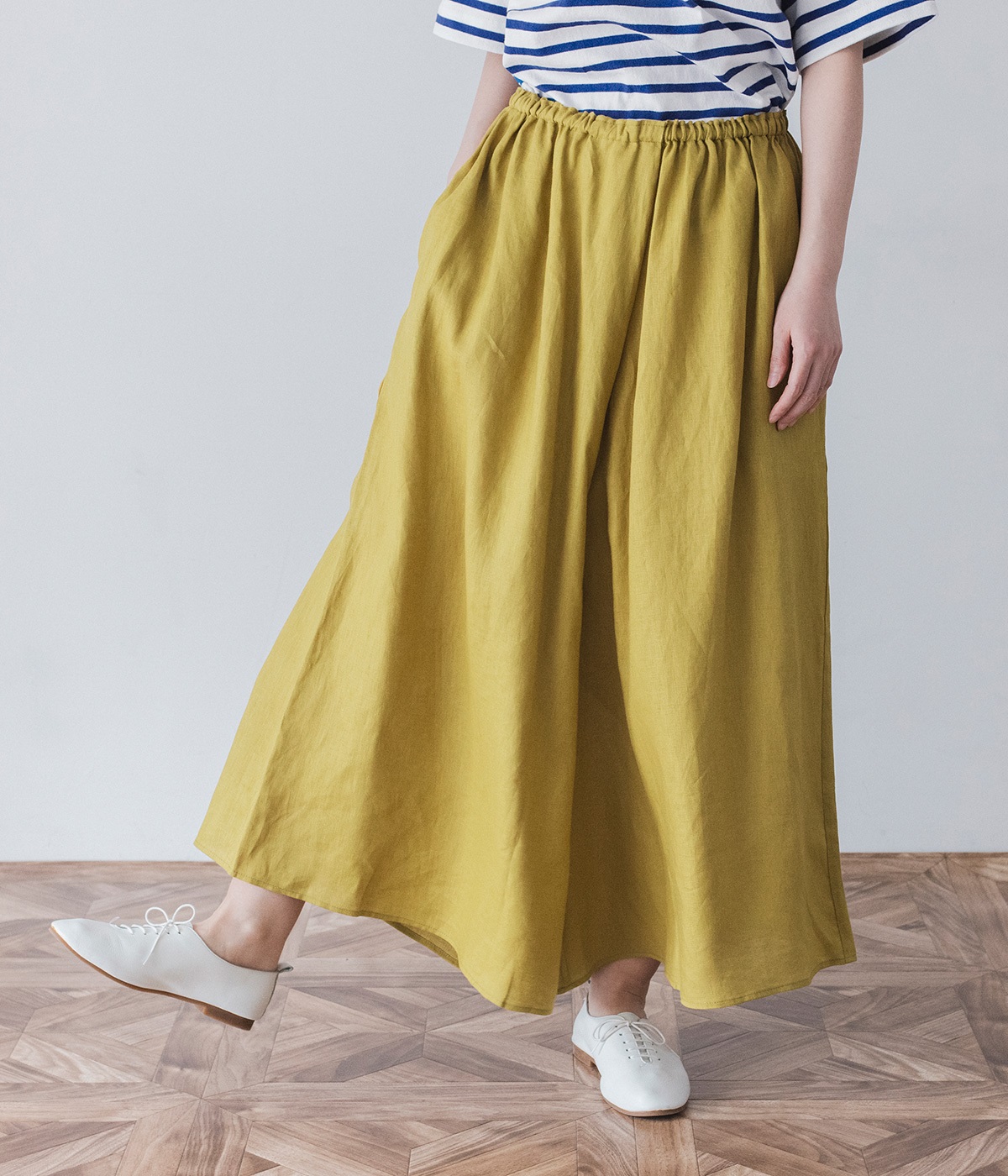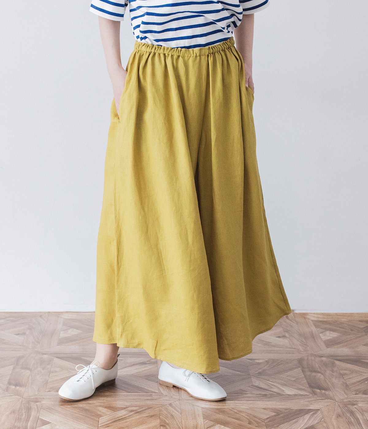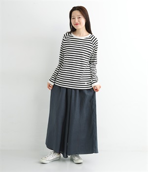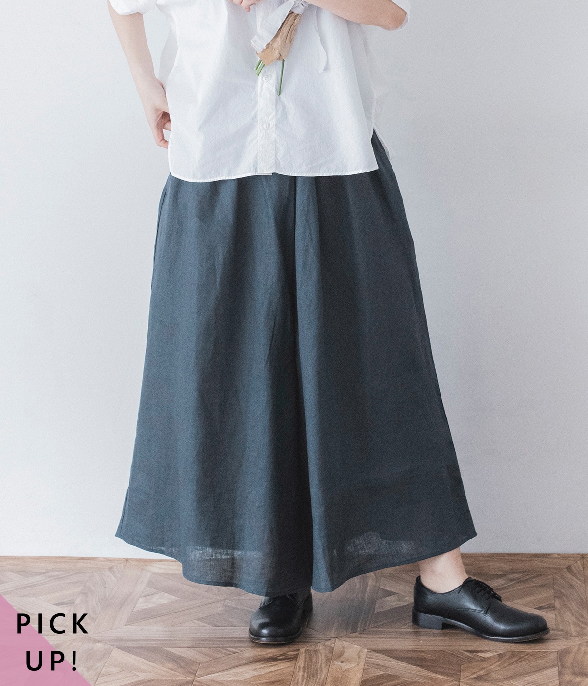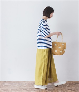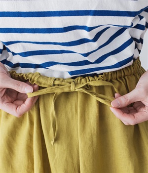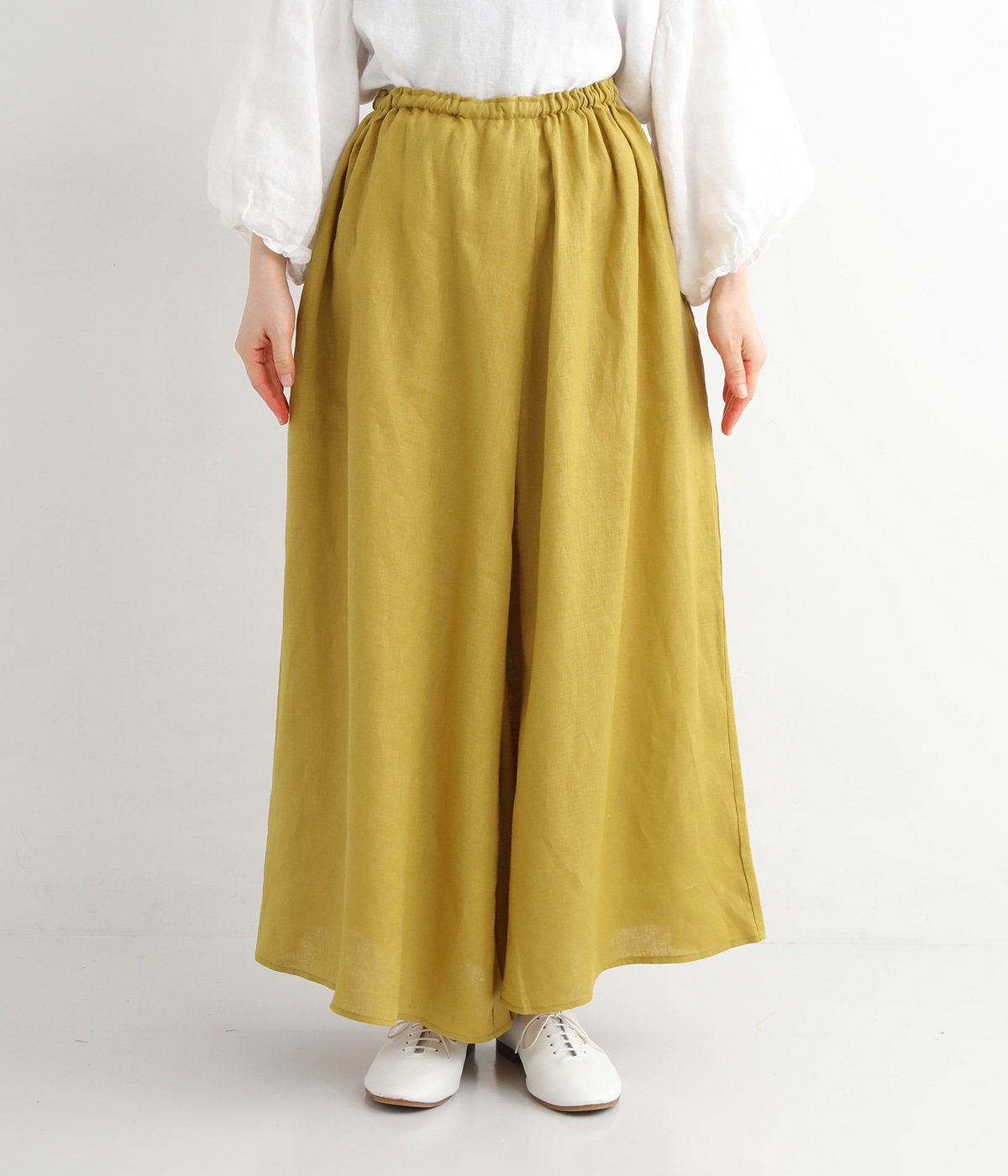 【素材】品のいい光沢とシャリッとした手触りが心地いいリネン素材は、風通しがよく、軽いはき心地を叶えます。はりつきにくく、肌に触れた時もさわやか。リラックスムードをアシストする気持ちのいい生地感です。【デザイン】スカート見えするほどボリューミーなワイドシルエットで、歩くたびに裾がひらりと揺らめき、周囲の視線をキャッチします。ウエストは伸びやかでフィット感のある総ゴムに、調整可能なドロストコードをあしらいました。