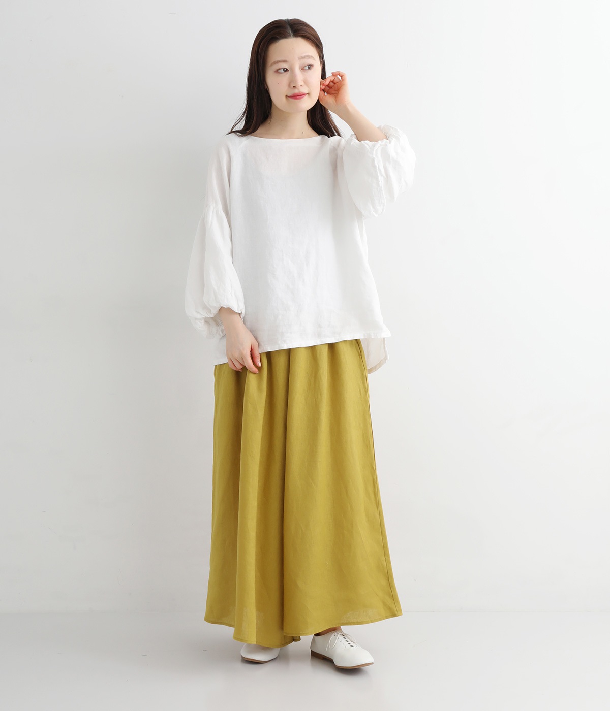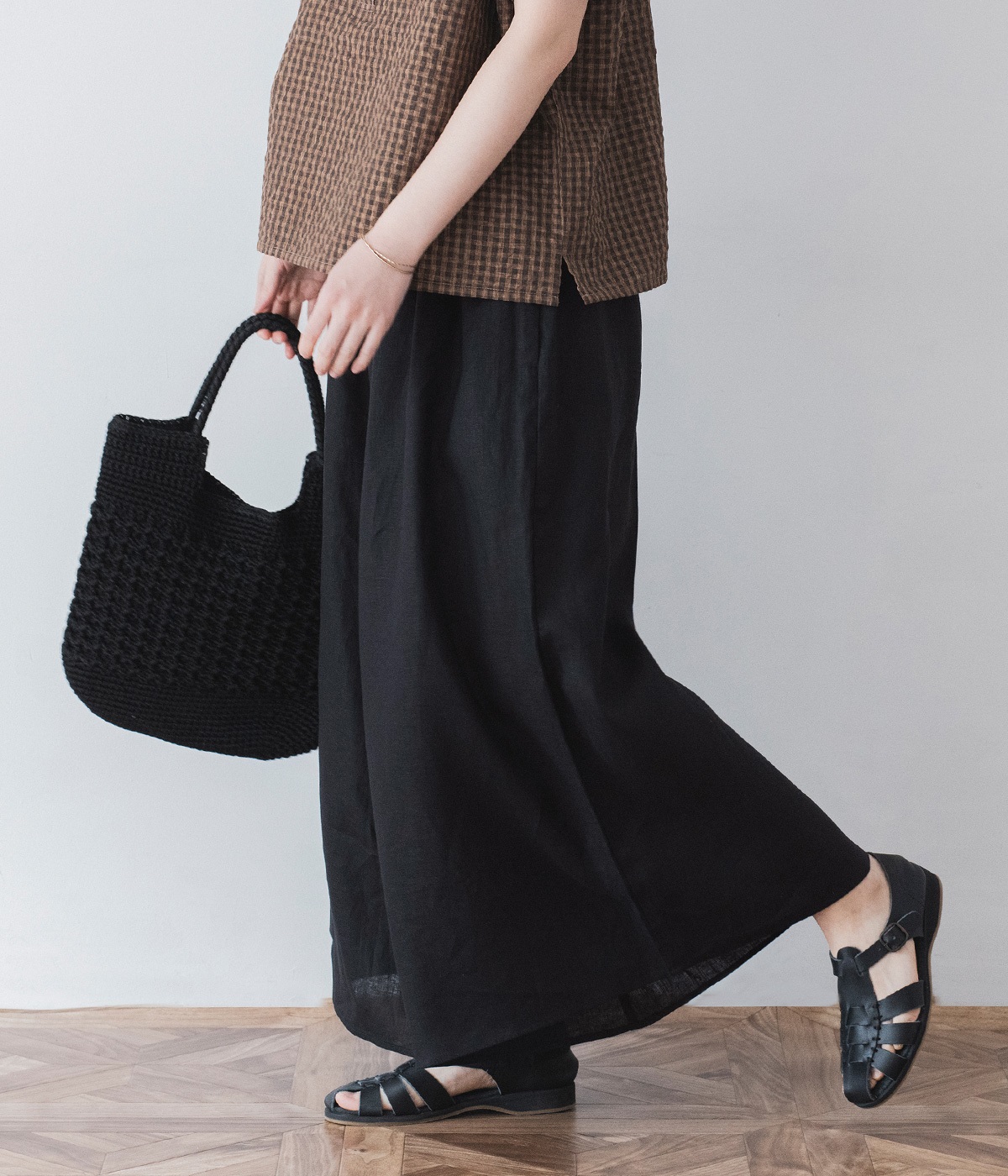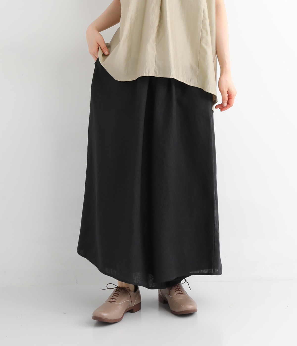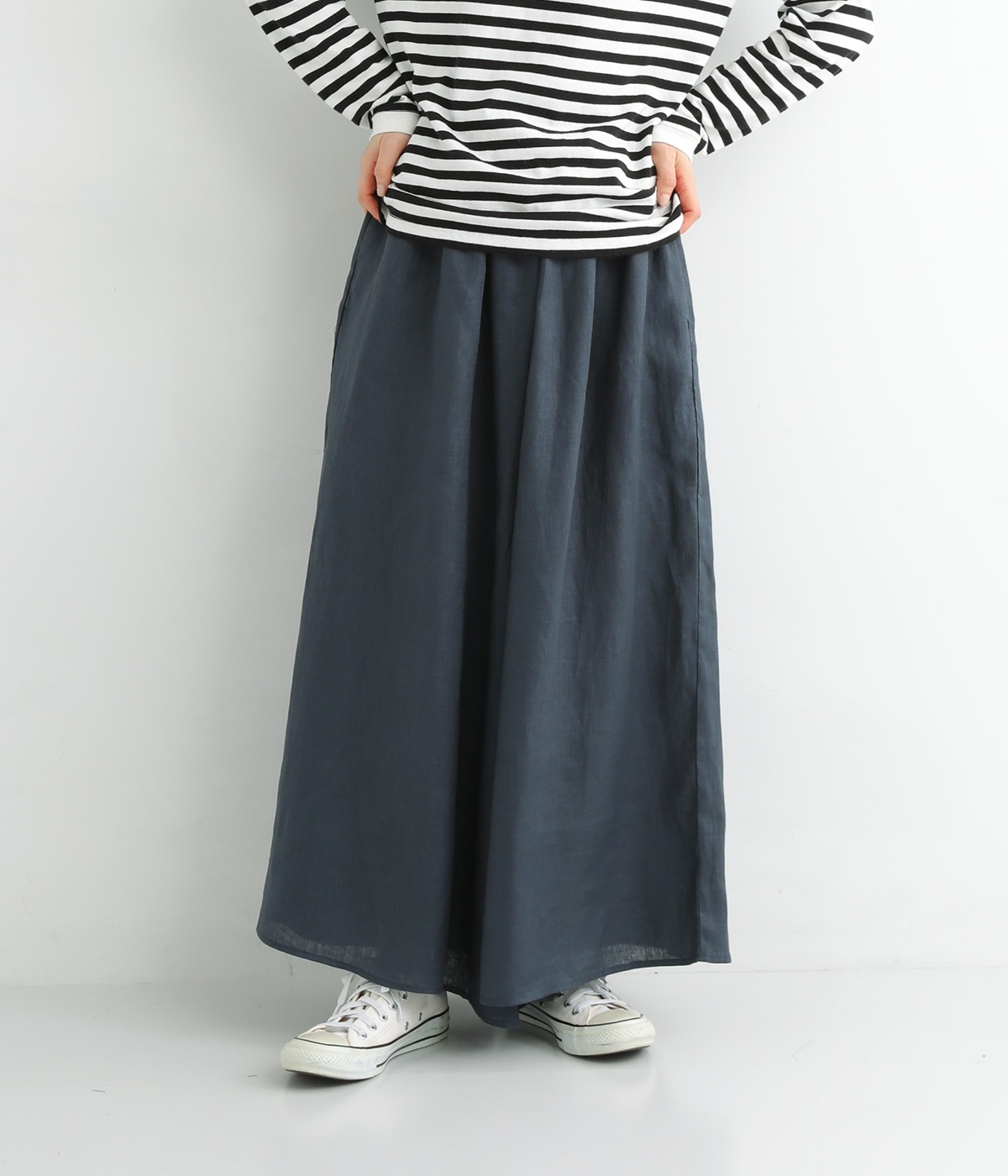 【素材】品のいい光沢とシャリッとした手触りが心地いいリネン素材は、風通しがよく、軽いはき心地を叶えます。はりつきにくく、肌に触れた時もさわやか。リラックスムードをアシストする気持ちのいい生地感です。【デザイン】スカート見えするほどボリューミーなワイドシルエットで、歩くたびに裾がひらりと揺らめき、周囲の視線をキャッチします。ウエストは伸びやかでフィット感のある総ゴムに、調整可能なドロストコードをあしらいました。