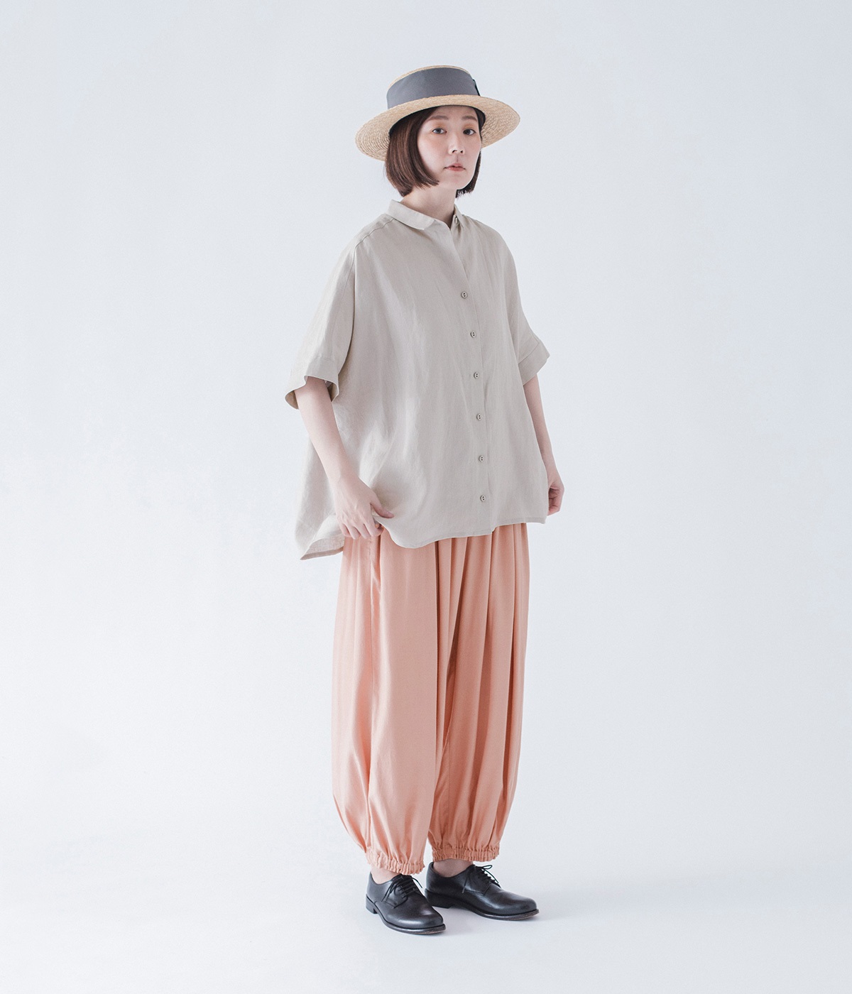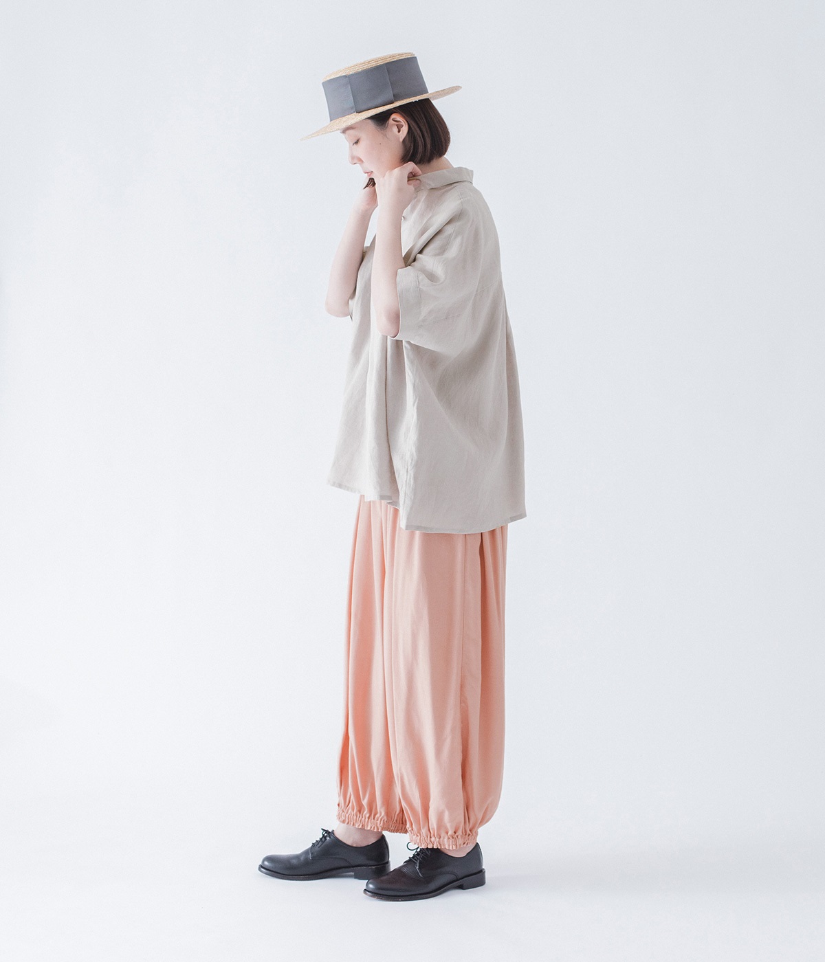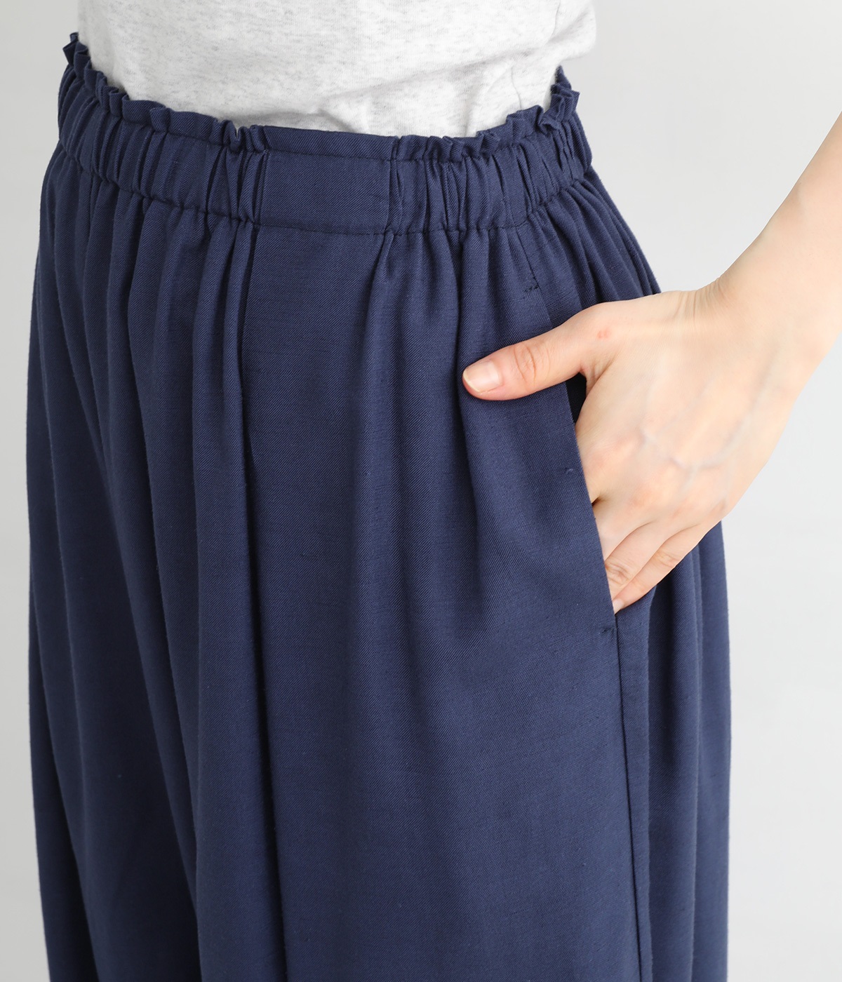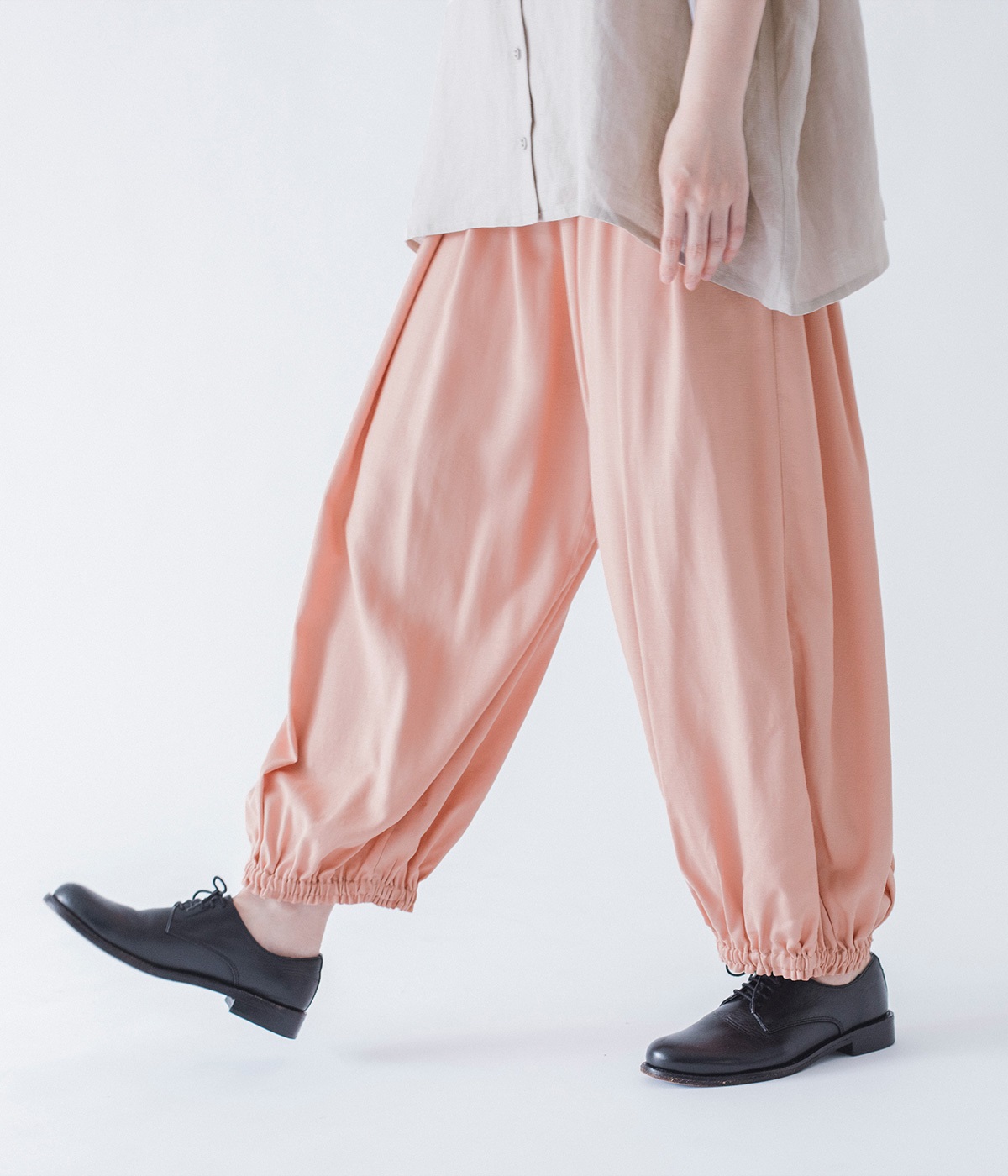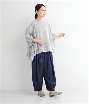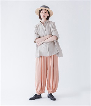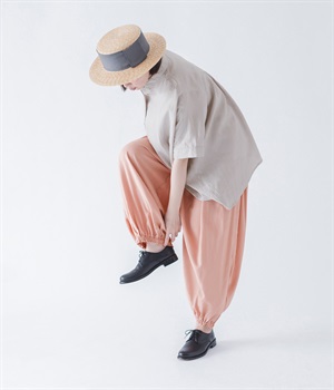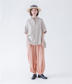 きれいなギャザーを出すために、動くと揺れる、落ち感のある生地をセレクト。リネンも入っているので、節のあるナチュラルな風合いも魅力です。