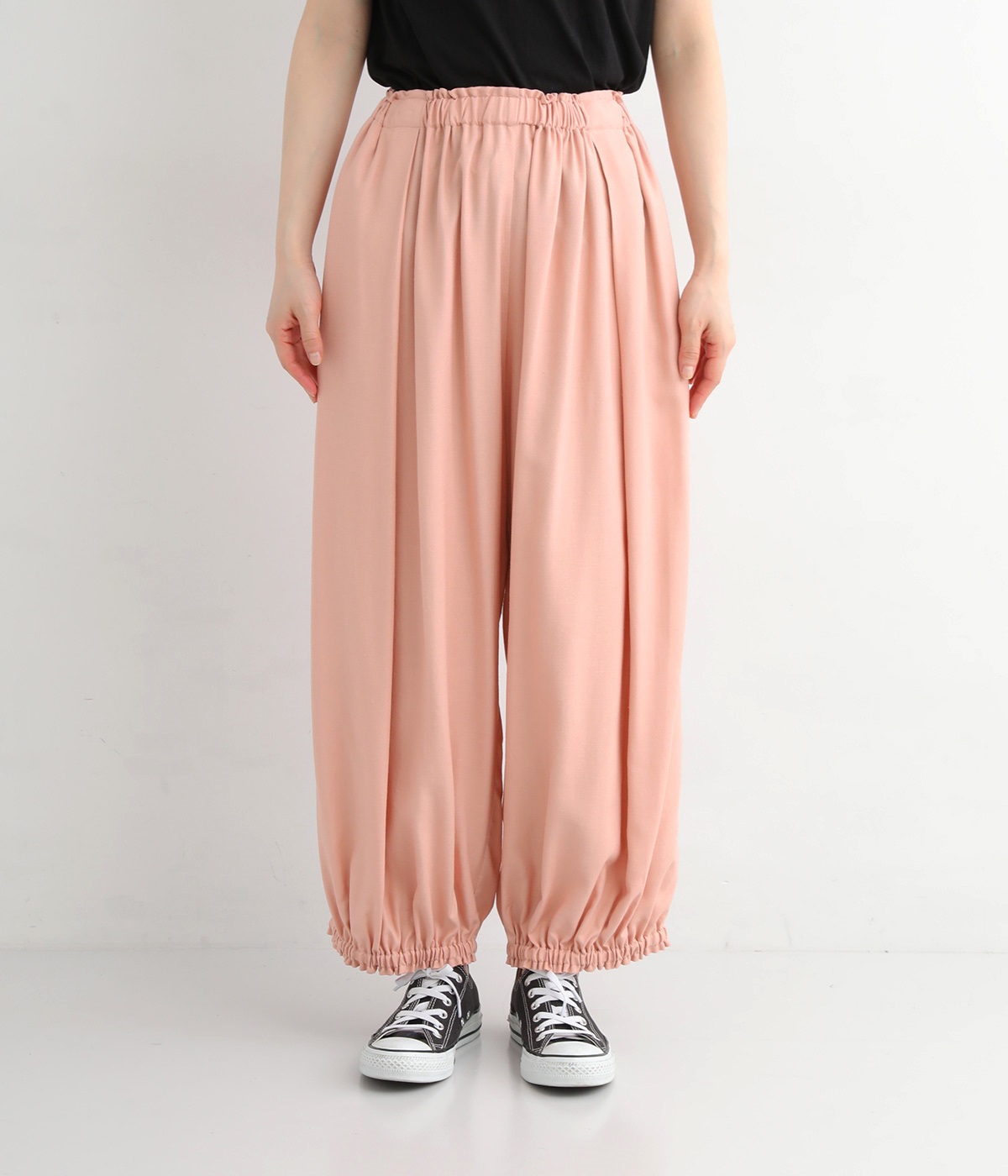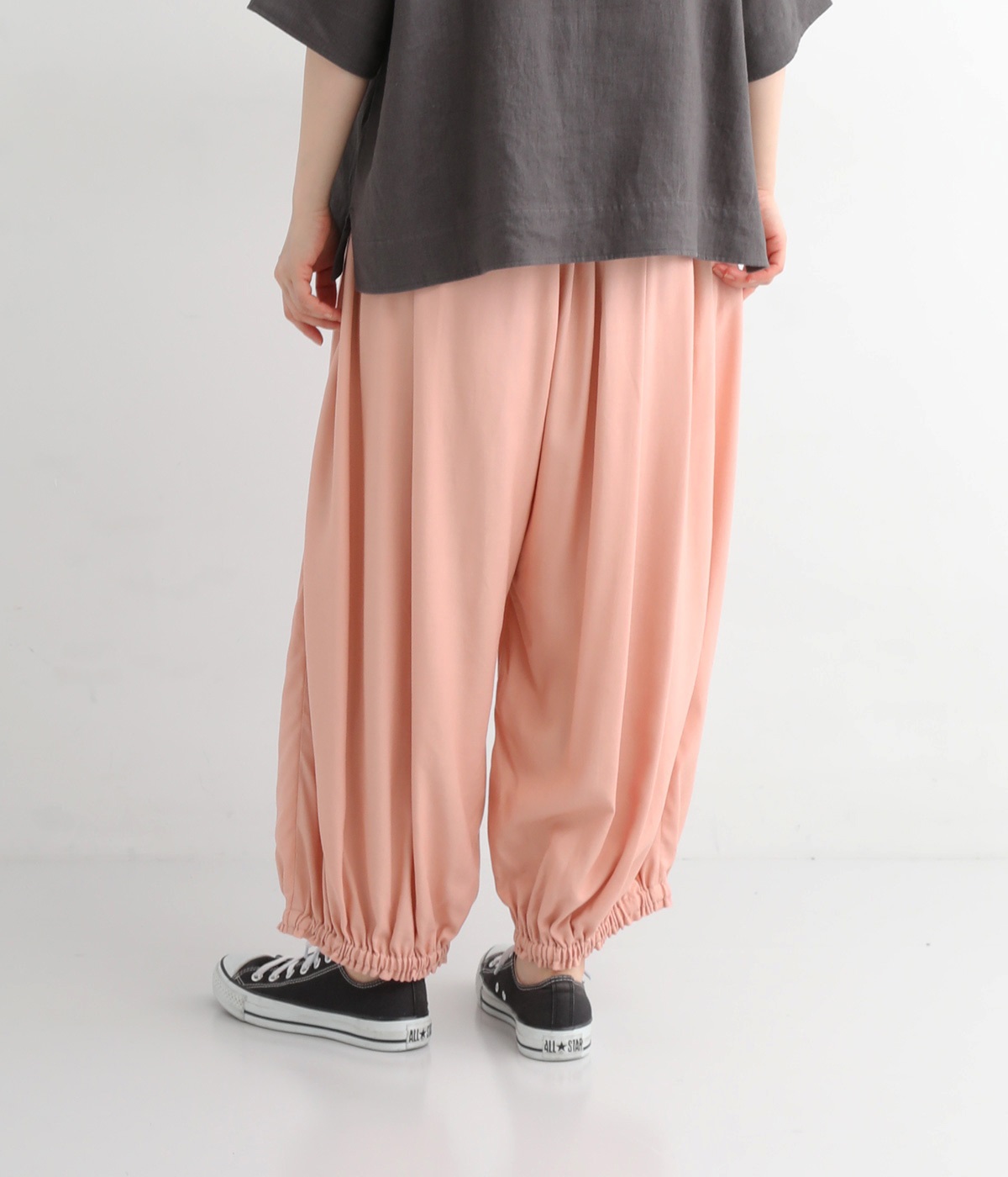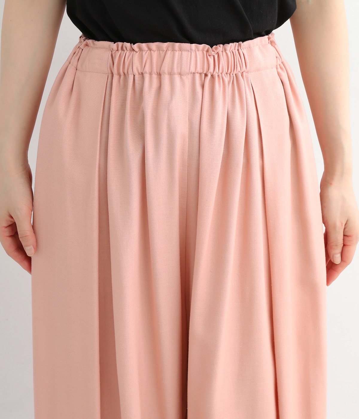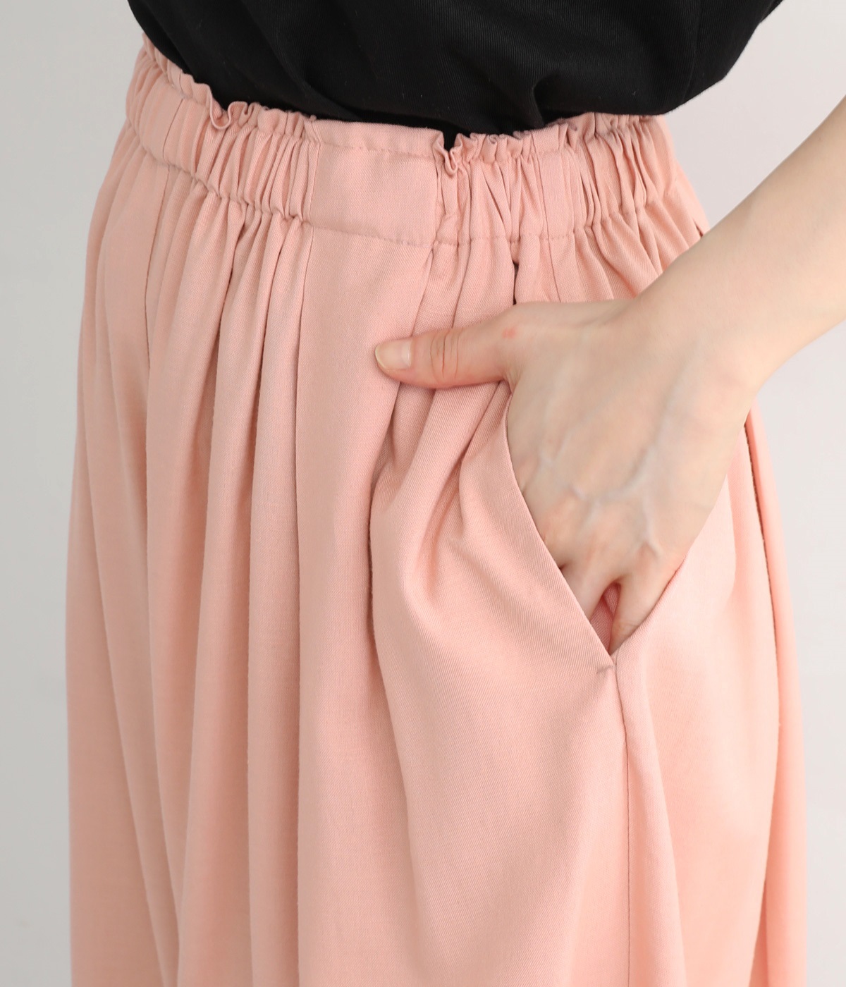 女性らしい印象のピンクですが、ギャザーでボリュームを出すことで、カジュアルなエッセンスをプラス。