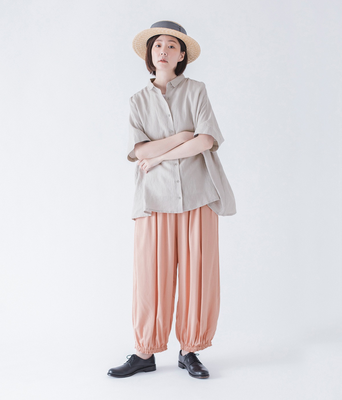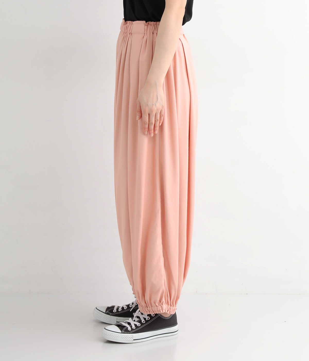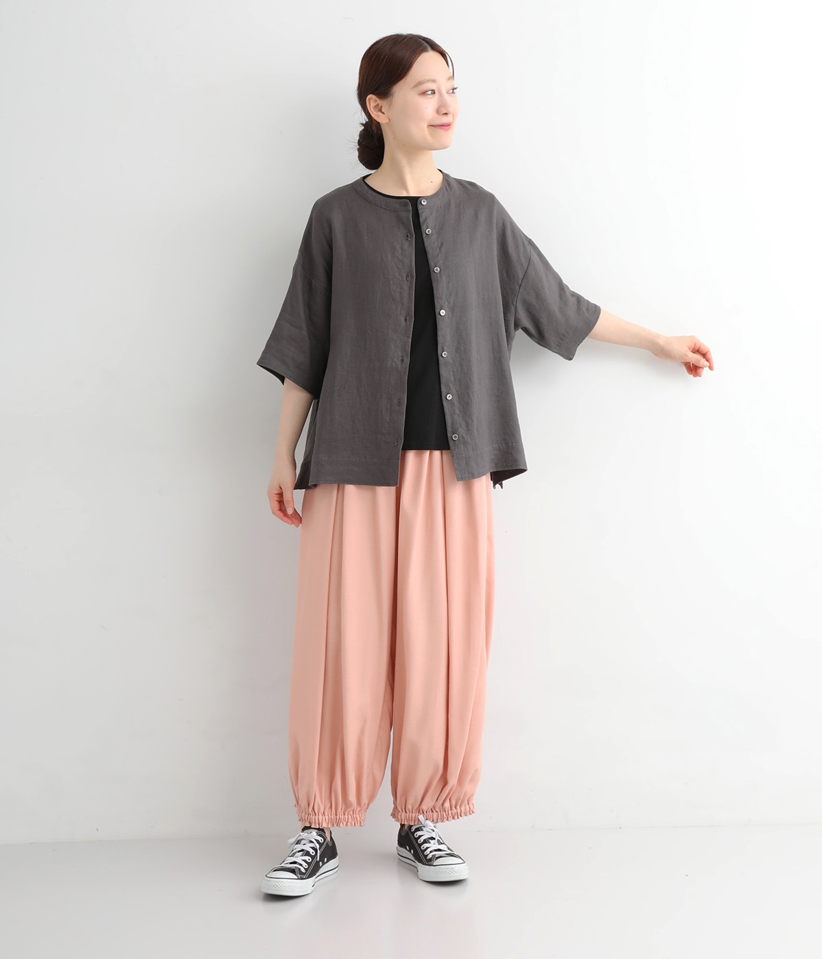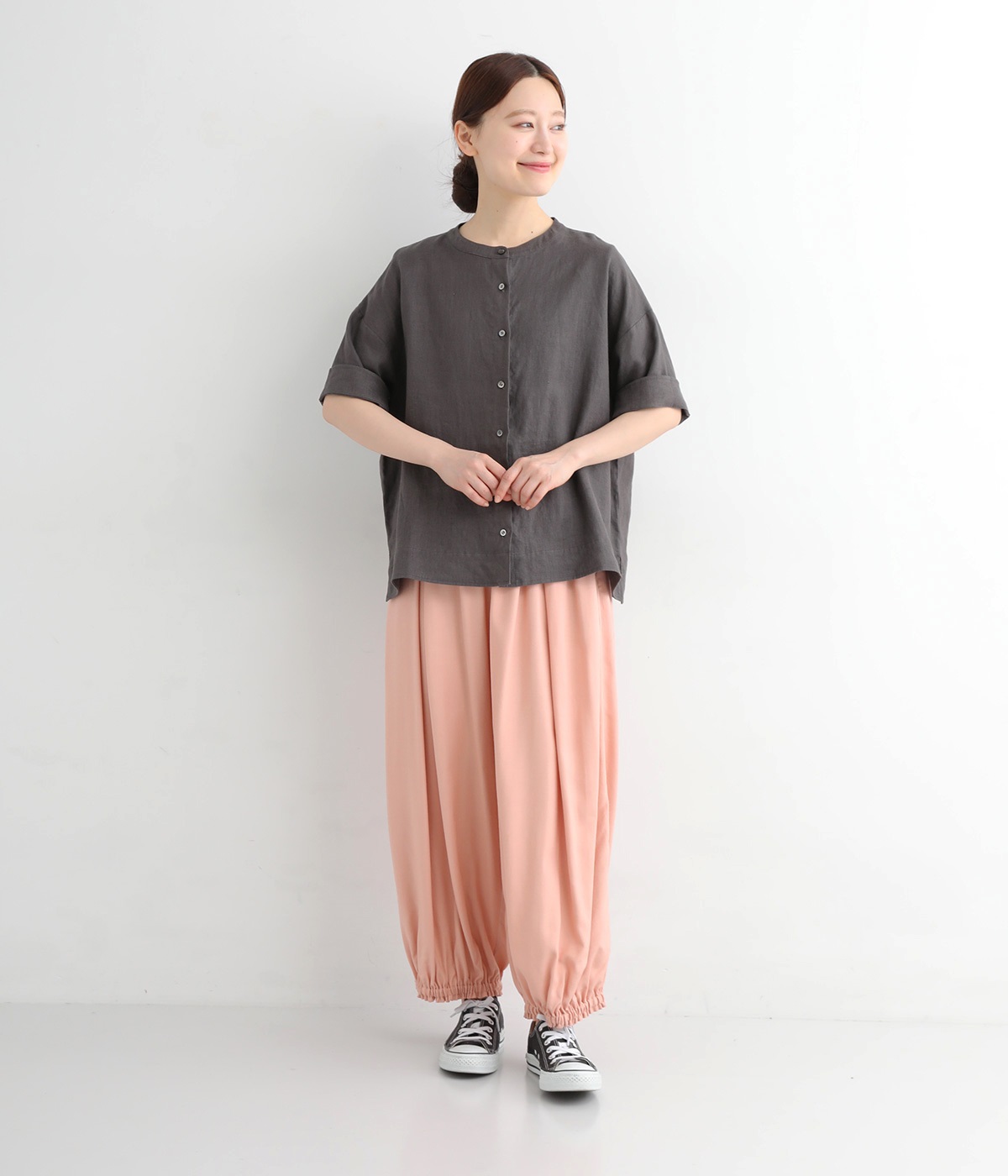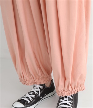 女性らしい印象のピンクですが、ギャザーでボリュームを出すことで、カジュアルなエッセンスをプラス。