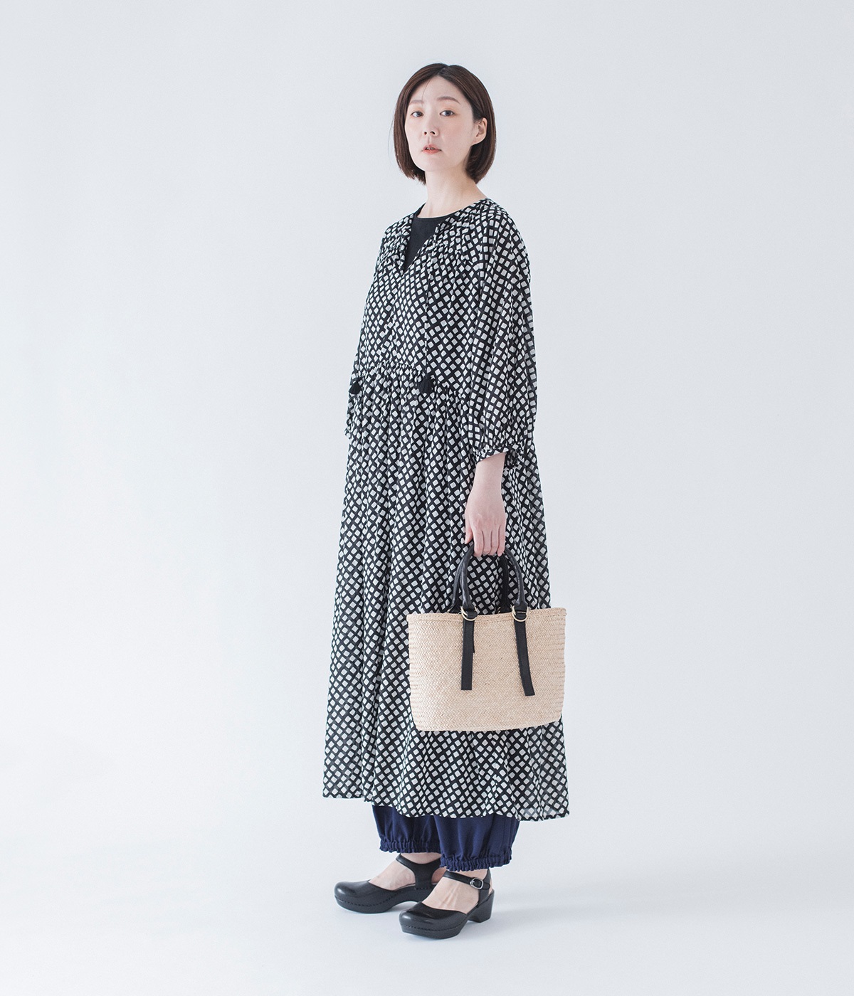 ワイドパンツほどボリュームが出ないので、小柄な方でも挑戦しやすいワンピースとの重ね着。