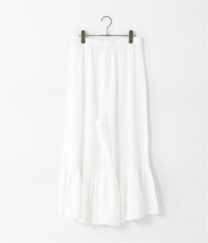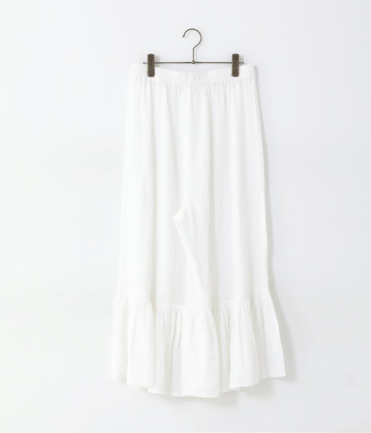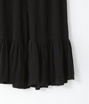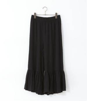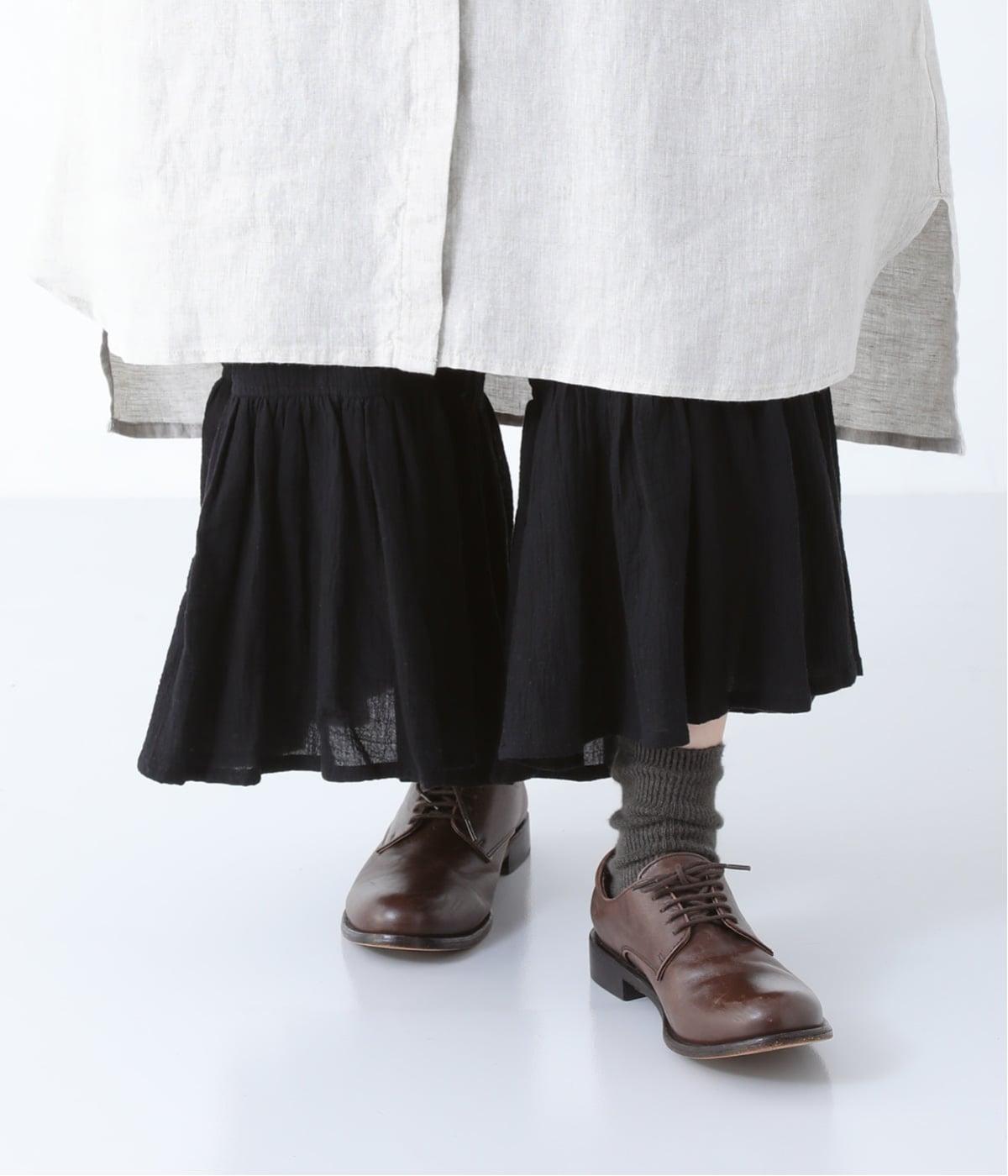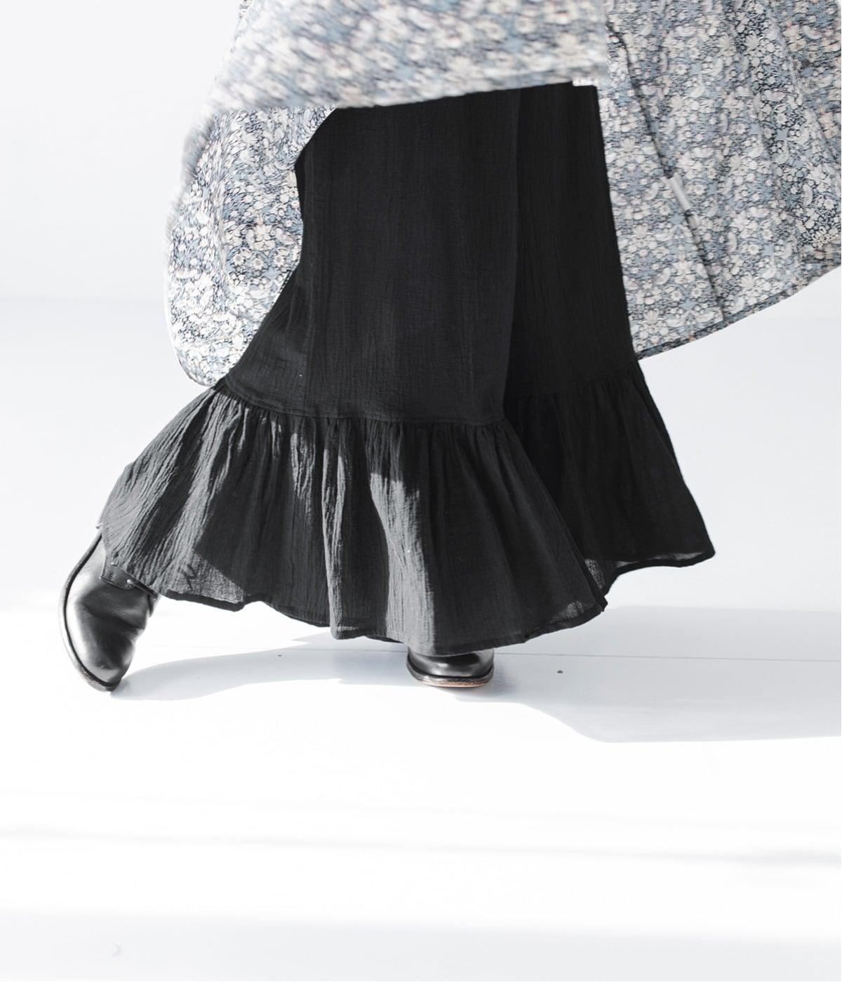 裾に切り替えとギャザーを入れた、女性らしいレイヤードスタイルをたのしめるぺチパンツ。パンツの足さばきの良さはそのままに、スカート見えするボリューム感を出しました。ウエストは一周ゴムでストレスフリーのはき心地です。