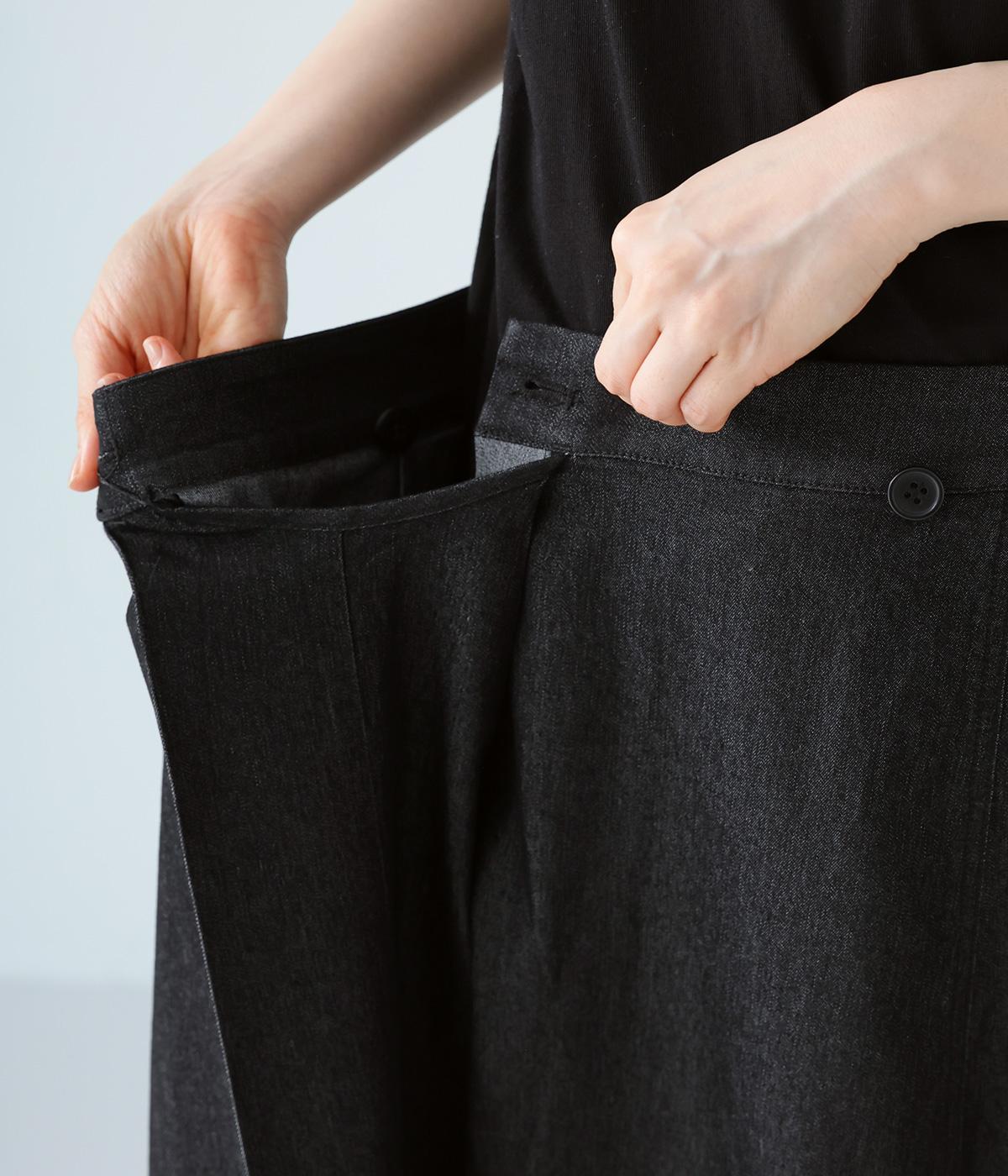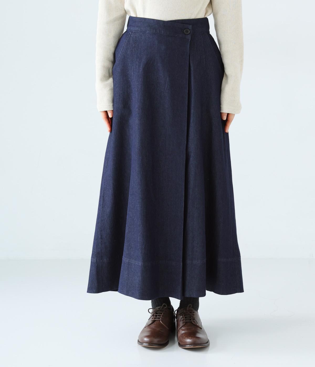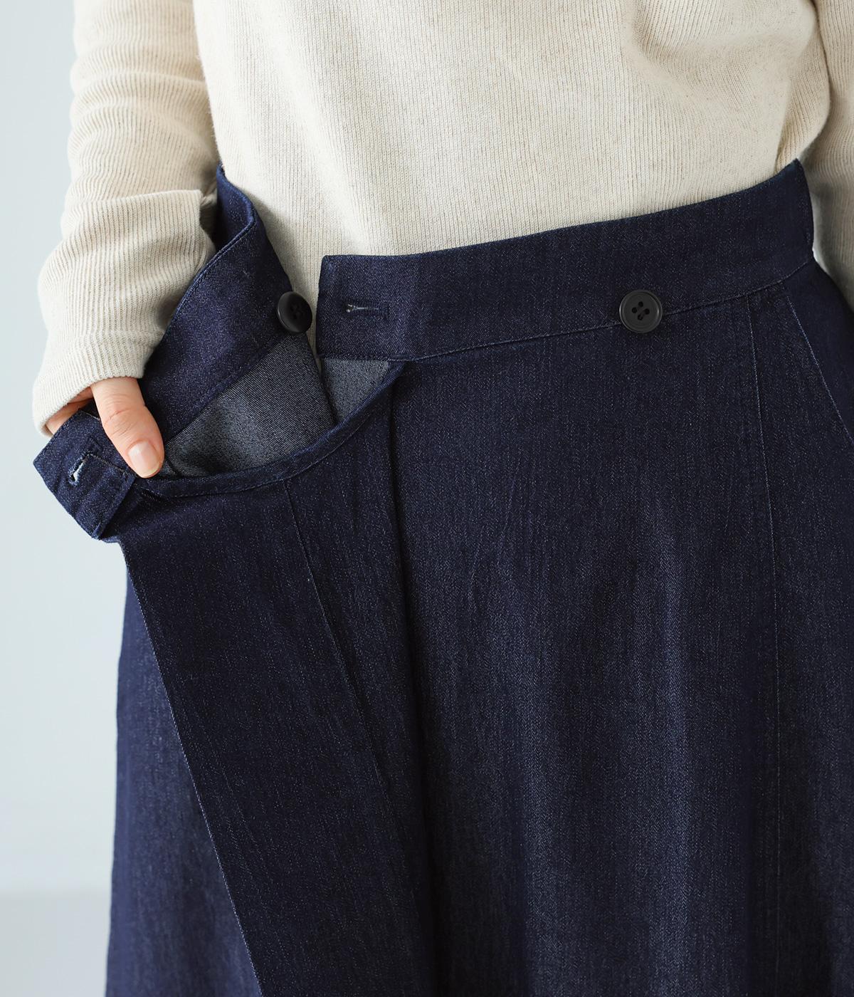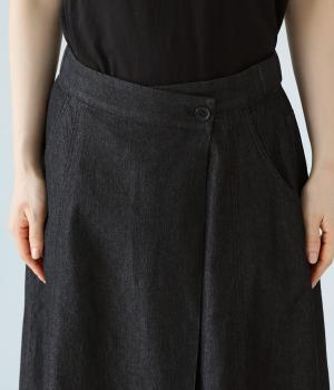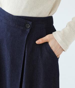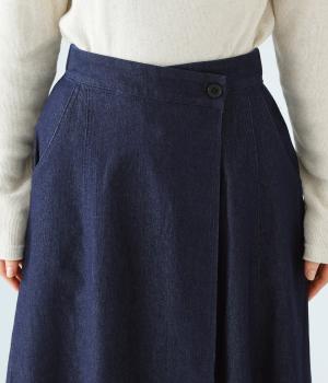 デニム生地や後ろポケットがカジュアルな雰囲気ながらも、ラップ風デザインで大人らしく仕上げました。ボリュームをおさえたきれいなAラインシルエットですっきりとした印象に。ウエストは後ろのみゴム仕様で、前の2つのボタンによって着脱できます。