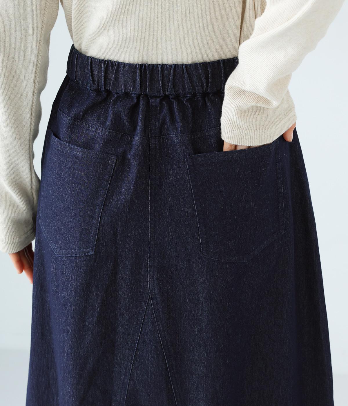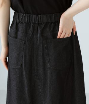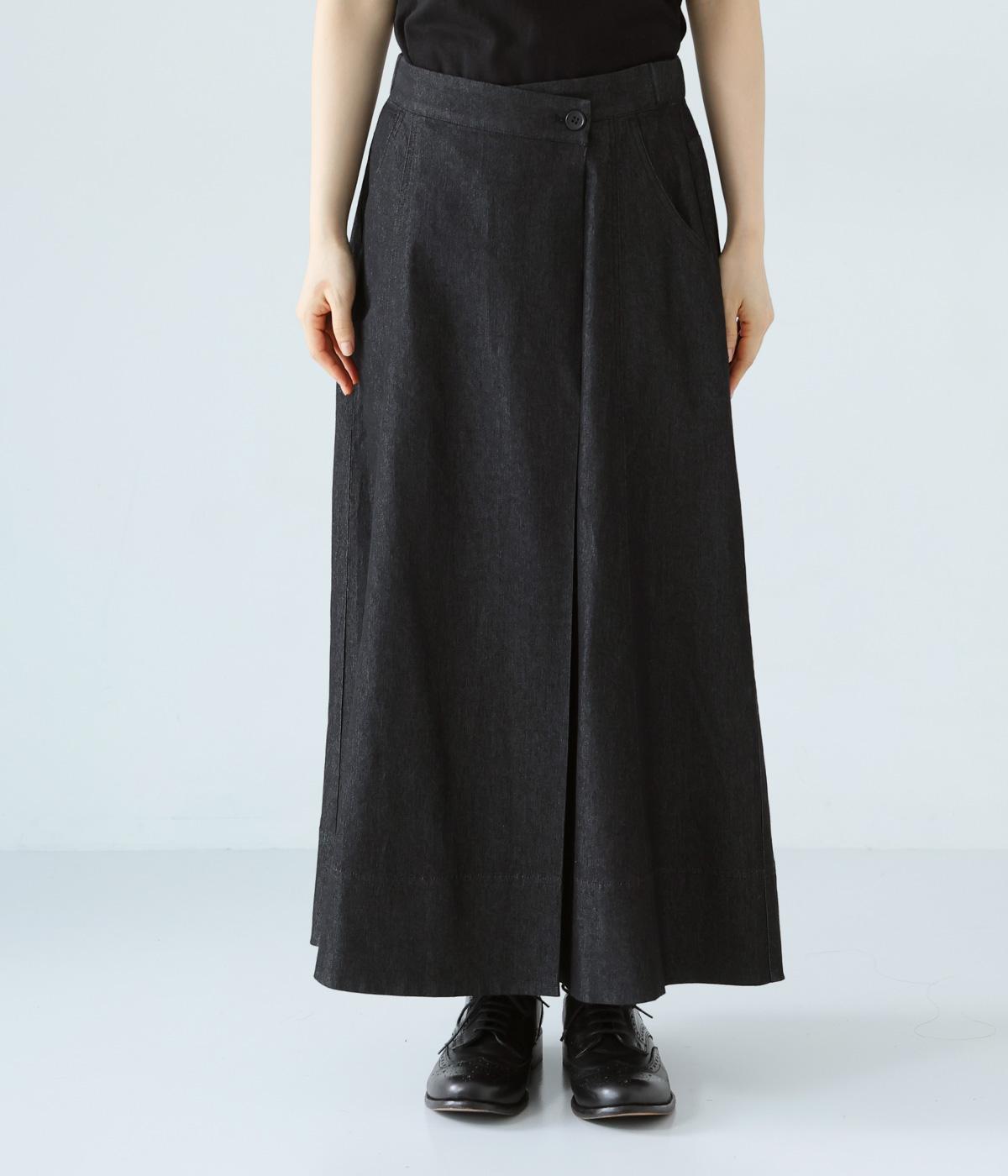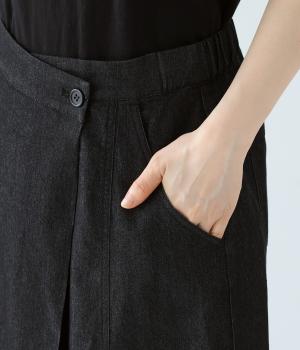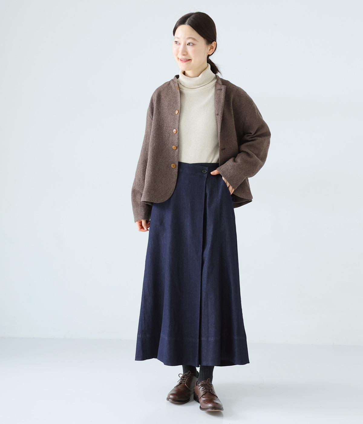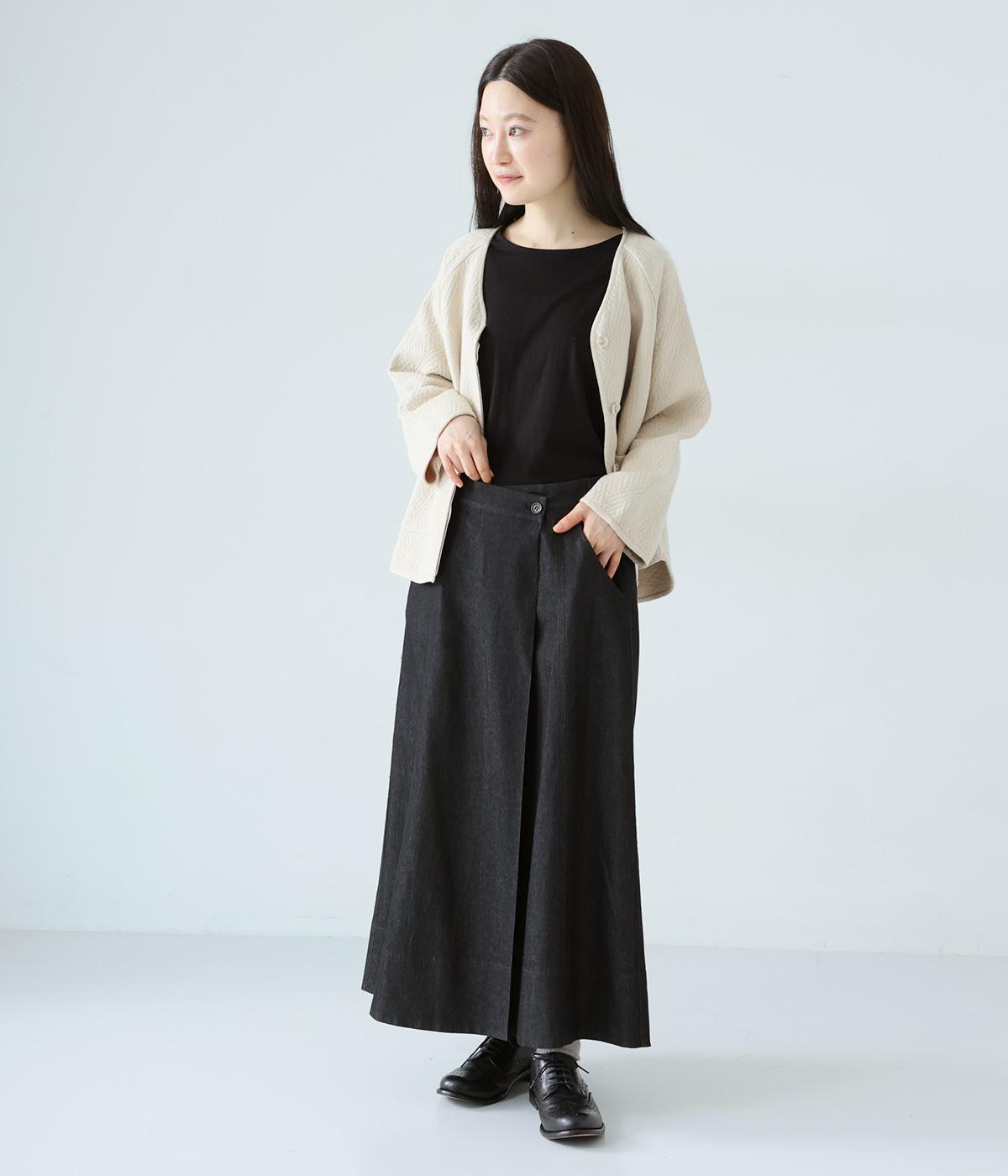 デニム生地や後ろポケットがカジュアルな雰囲気ながらも、ラップ風デザインで大人らしく仕上げました。ボリュームをおさえたきれいなAラインシルエットですっきりとした印象に。ウエストは後ろのみゴム仕様で、前の2つのボタンによって着脱できます。