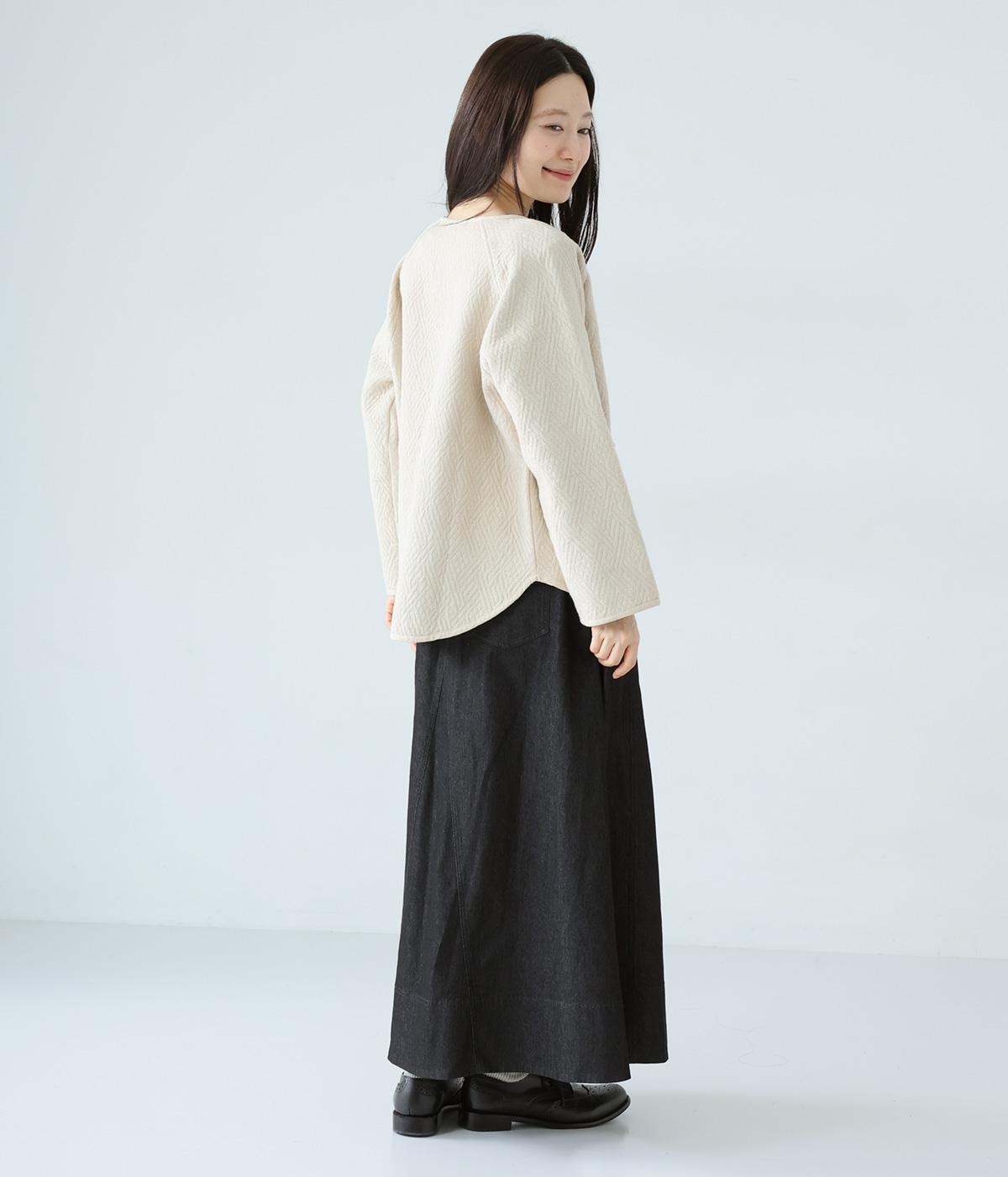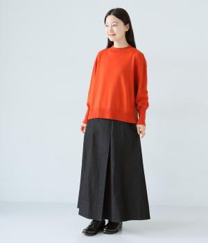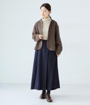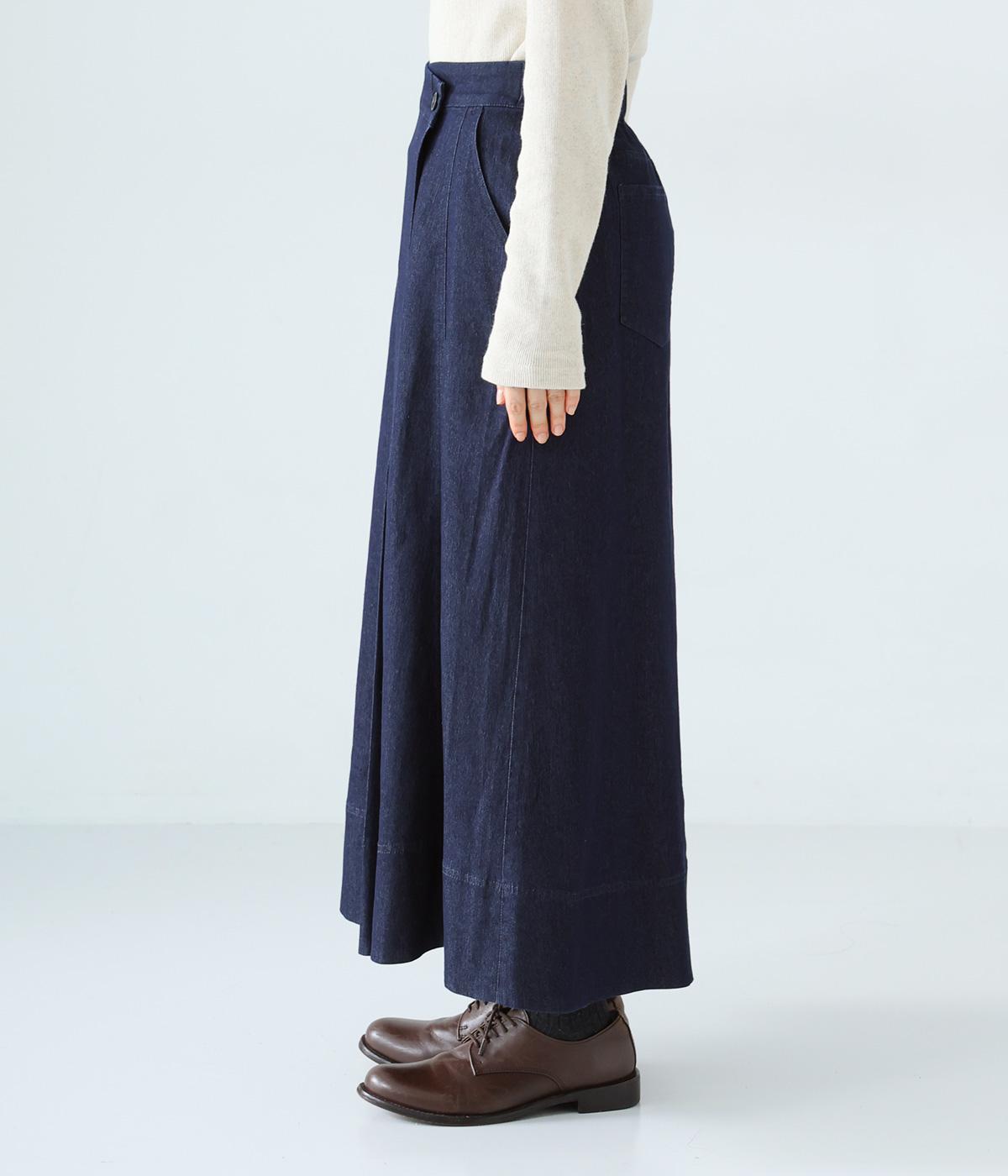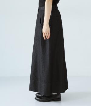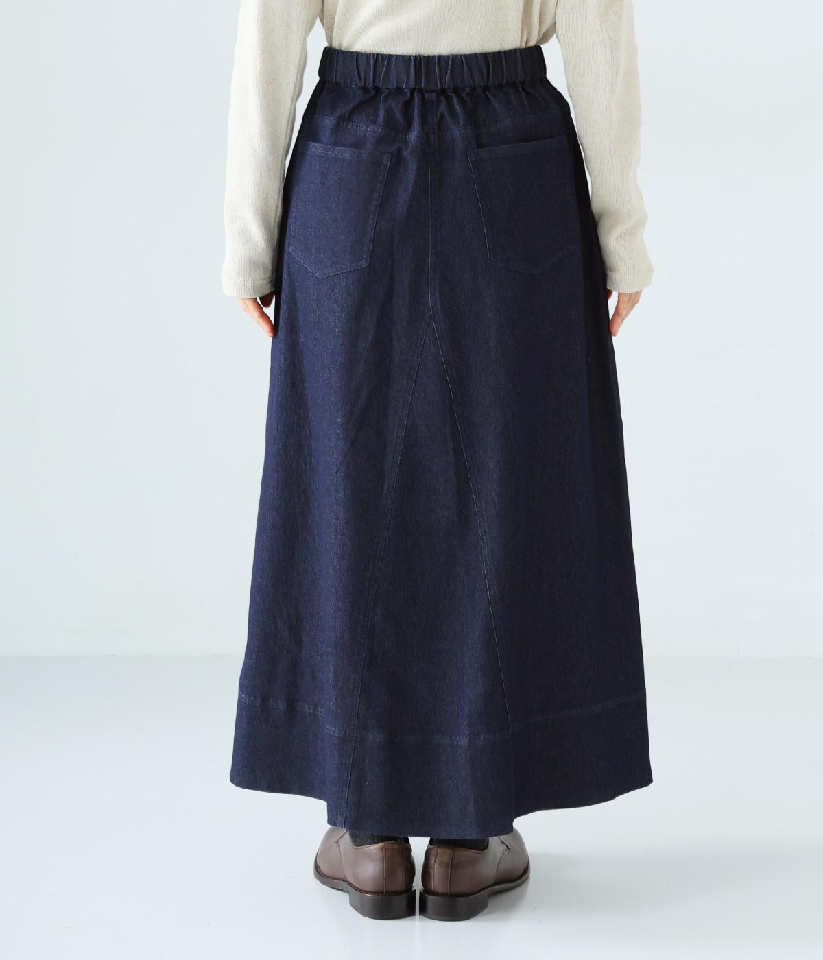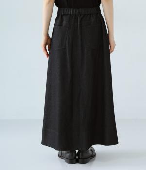 デニム生地や後ろポケットがカジュアルな雰囲気ながらも、ラップ風デザインで大人らしく仕上げました。ボリュームをおさえたきれいなAラインシルエットですっきりとした印象に。ウエストは後ろのみゴム仕様で、前の2つのボタンによって着脱できます。