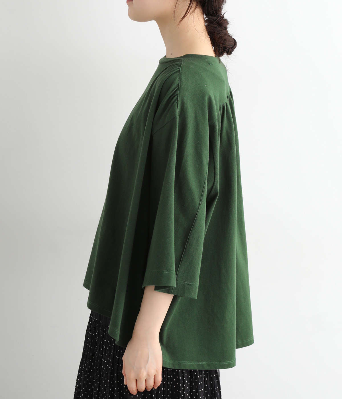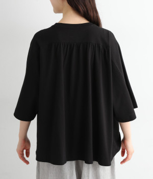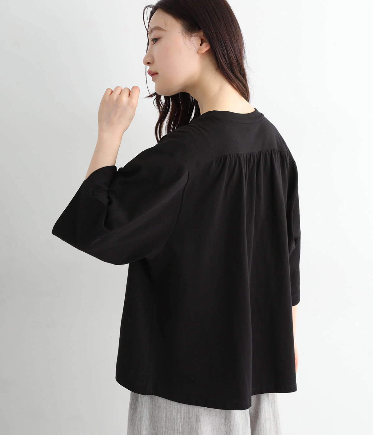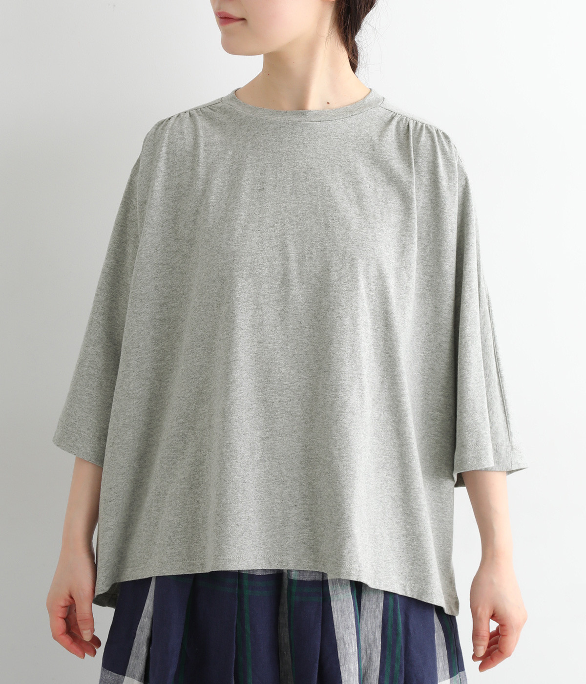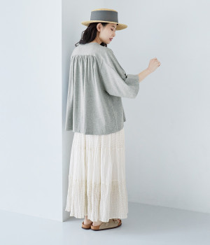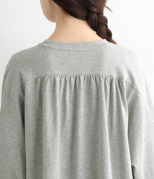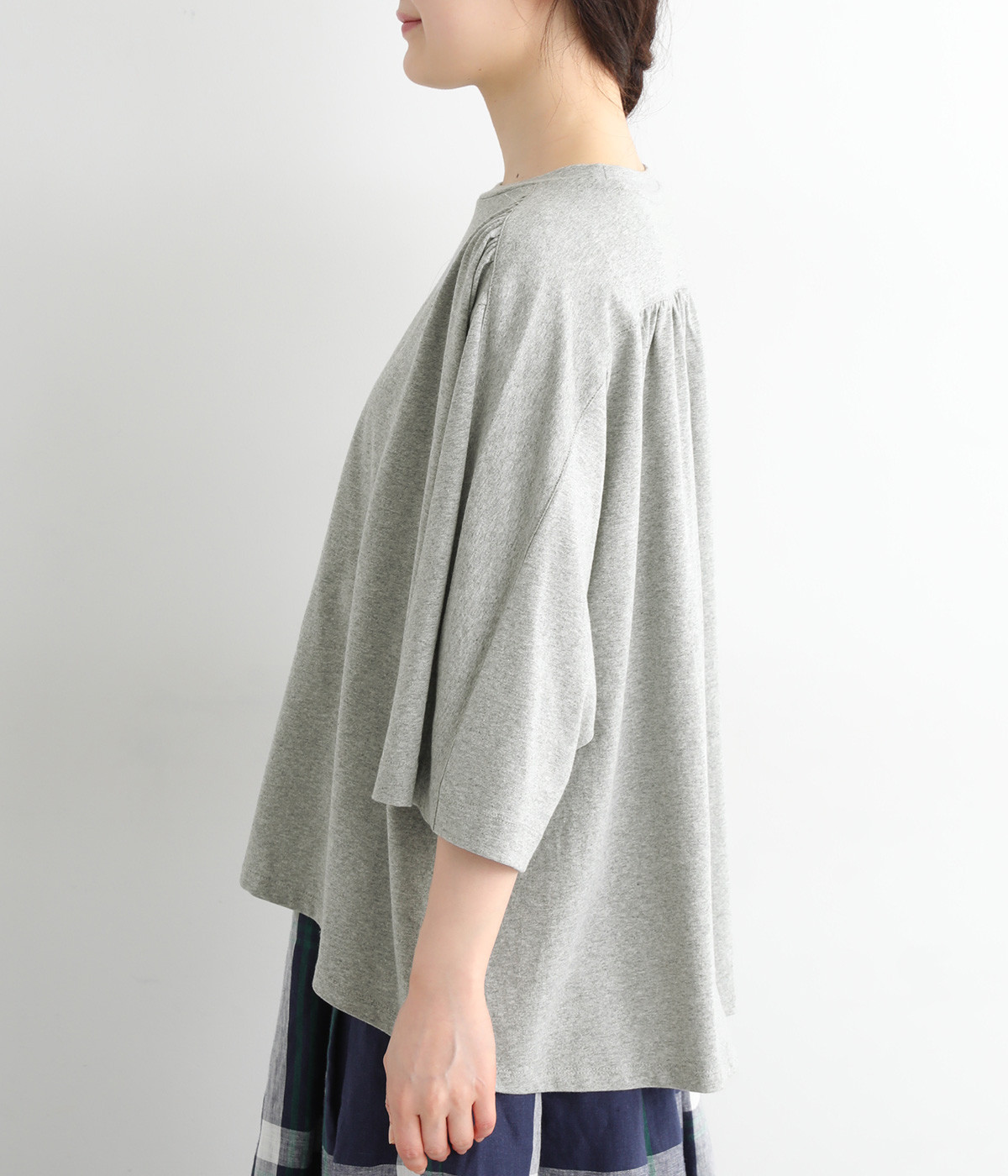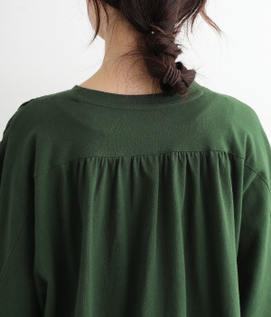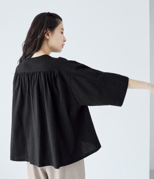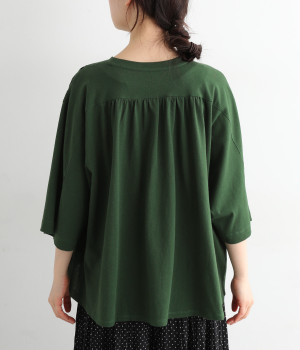 ショルダーラインとバックヨークにギャザーを入れて、ゆったりとしたフレアシルエットに。二の腕や体のラインを拾いにくく、さらりとコーディネートに合わせられます。着丈に前後差があるので、ボリューミーなボトムと好相性。