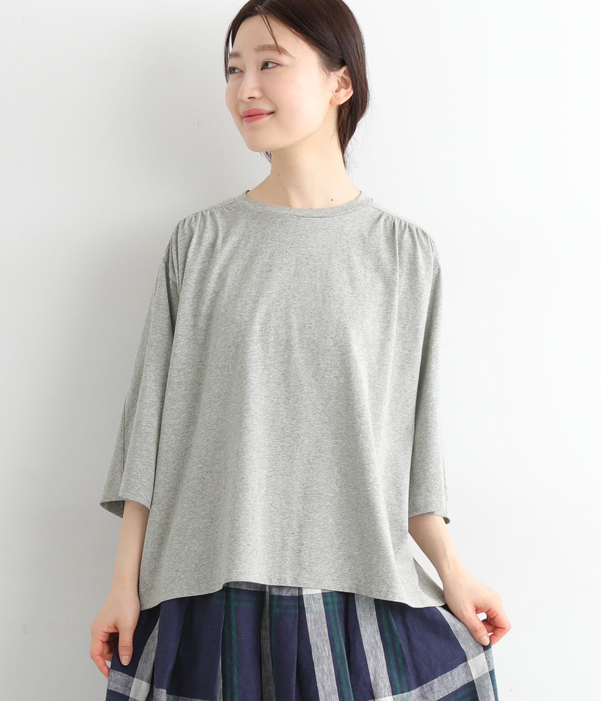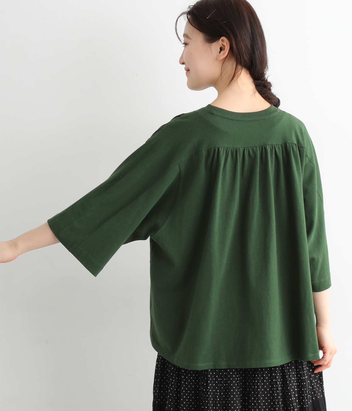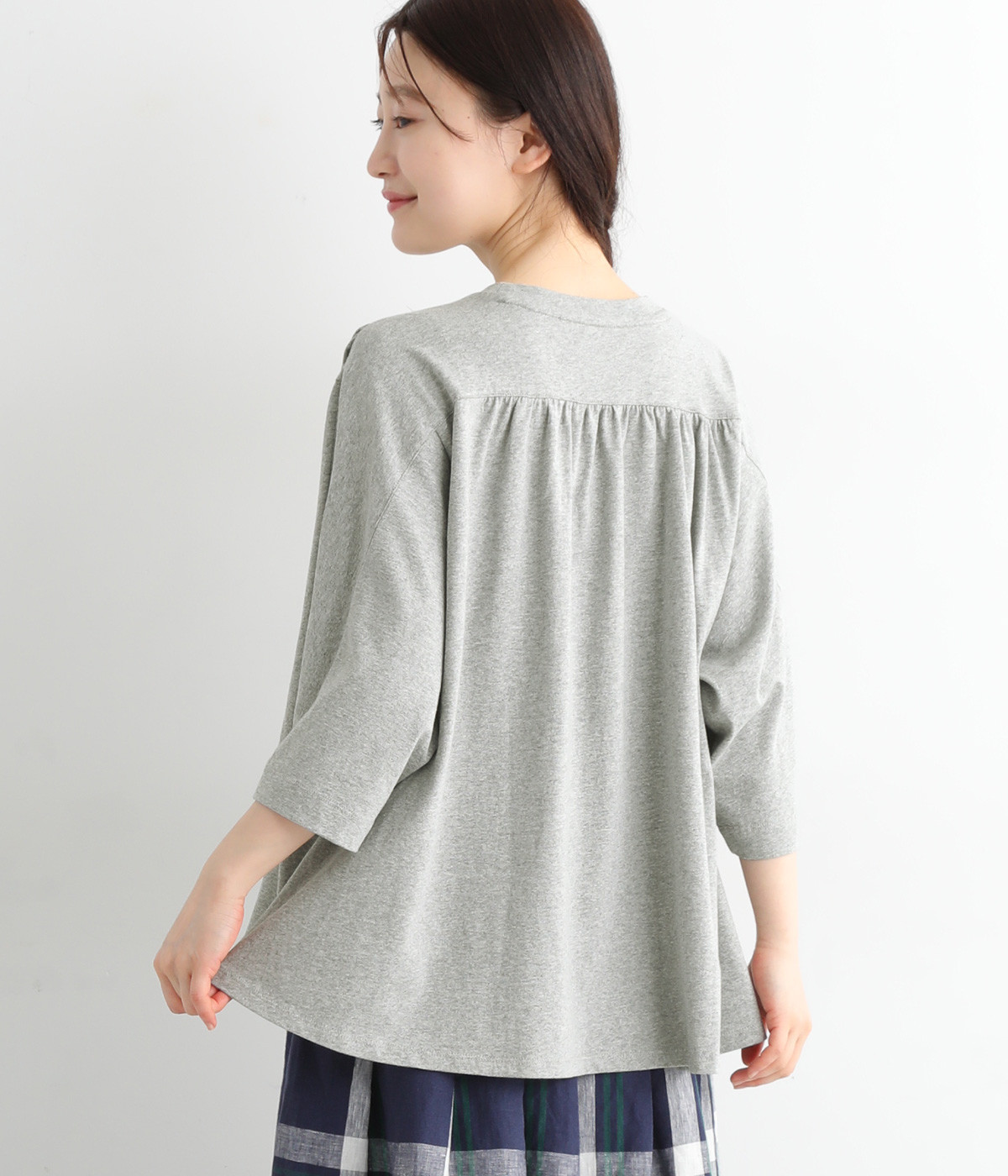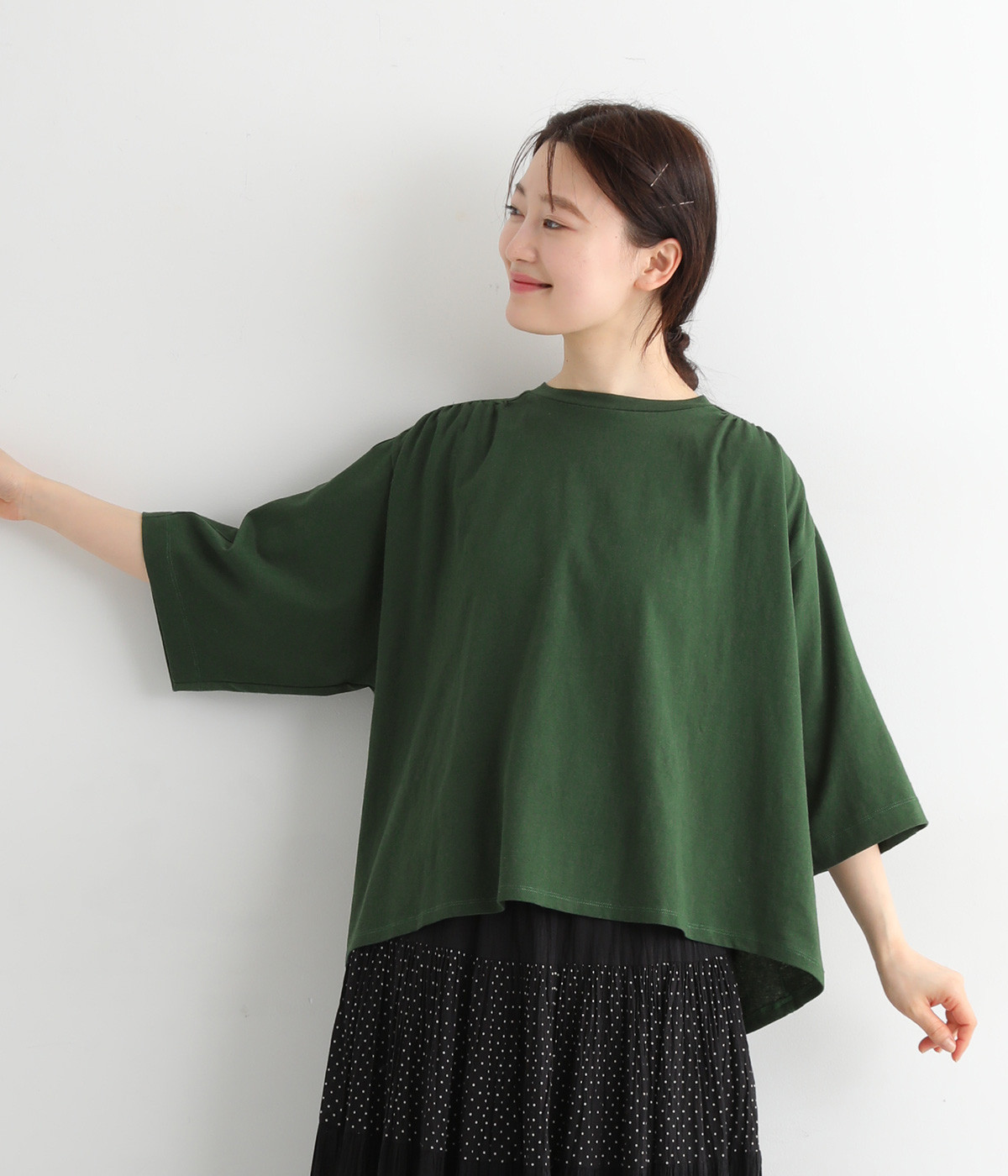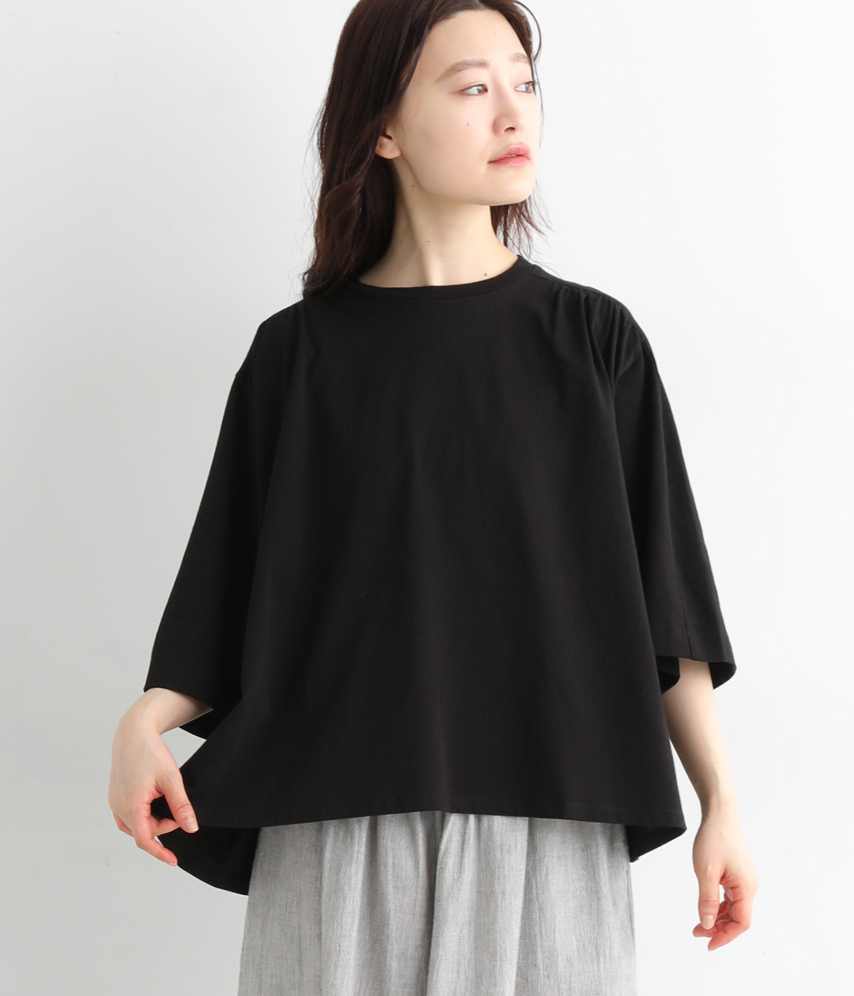 ショルダーラインとバックヨークにギャザーを入れて、ゆったりとしたフレアシルエットに。二の腕や体のラインを拾いにくく、さらりとコーディネートに合わせられます。着丈に前後差があるので、ボリューミーなボトムと好相性。